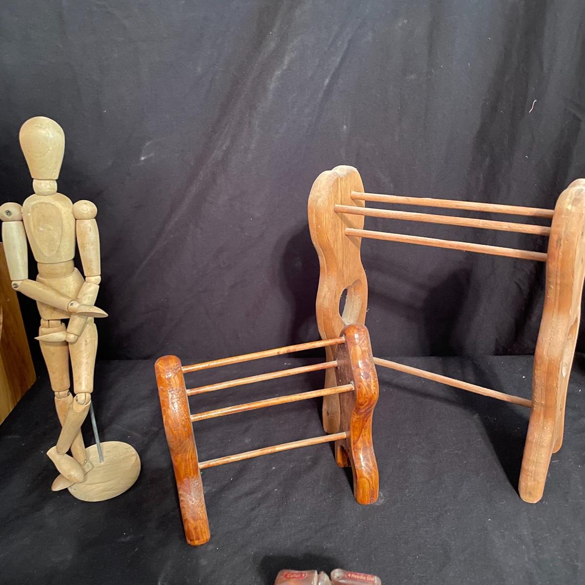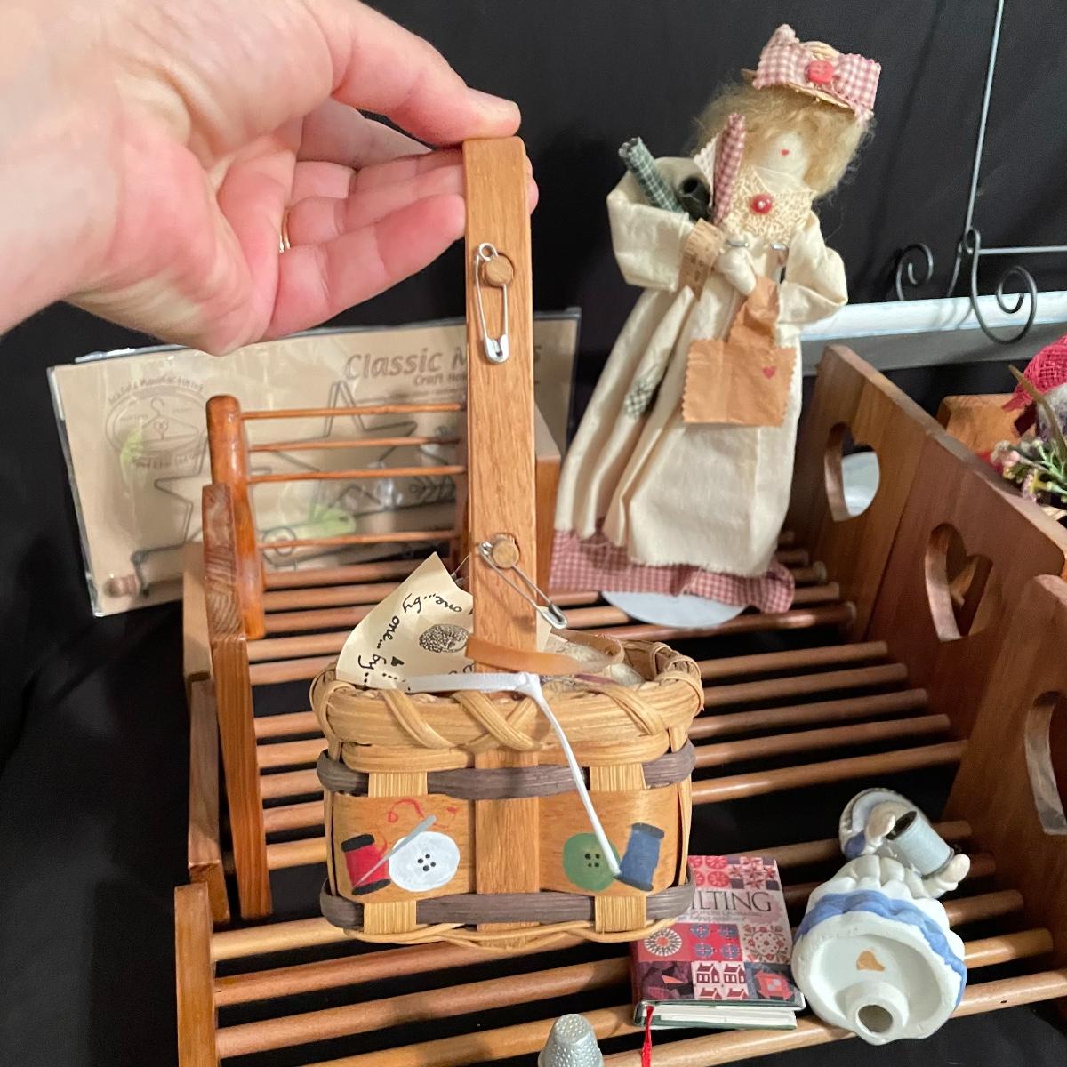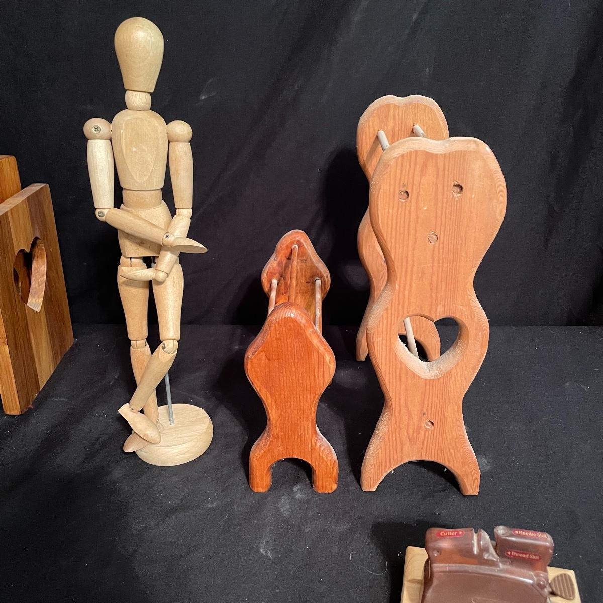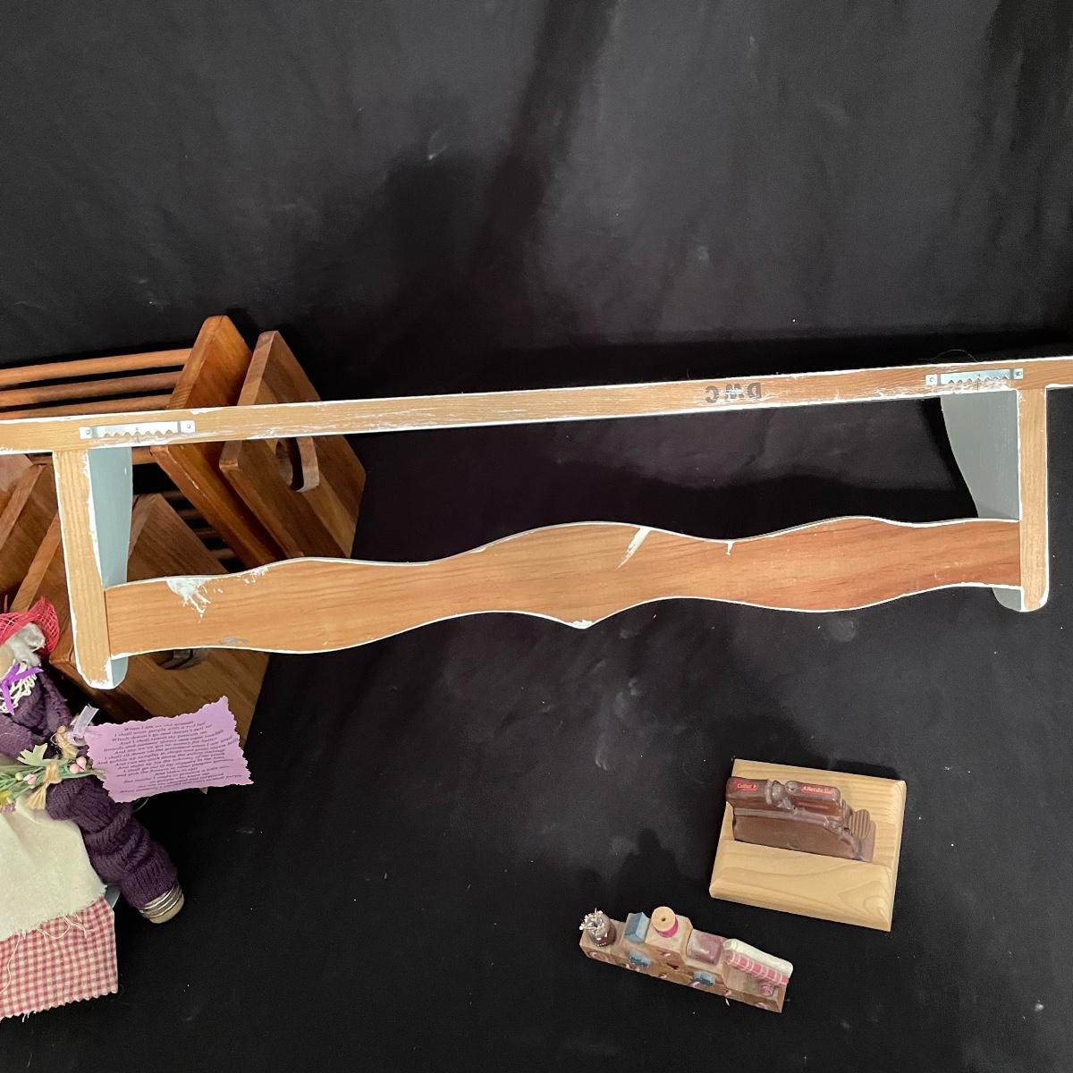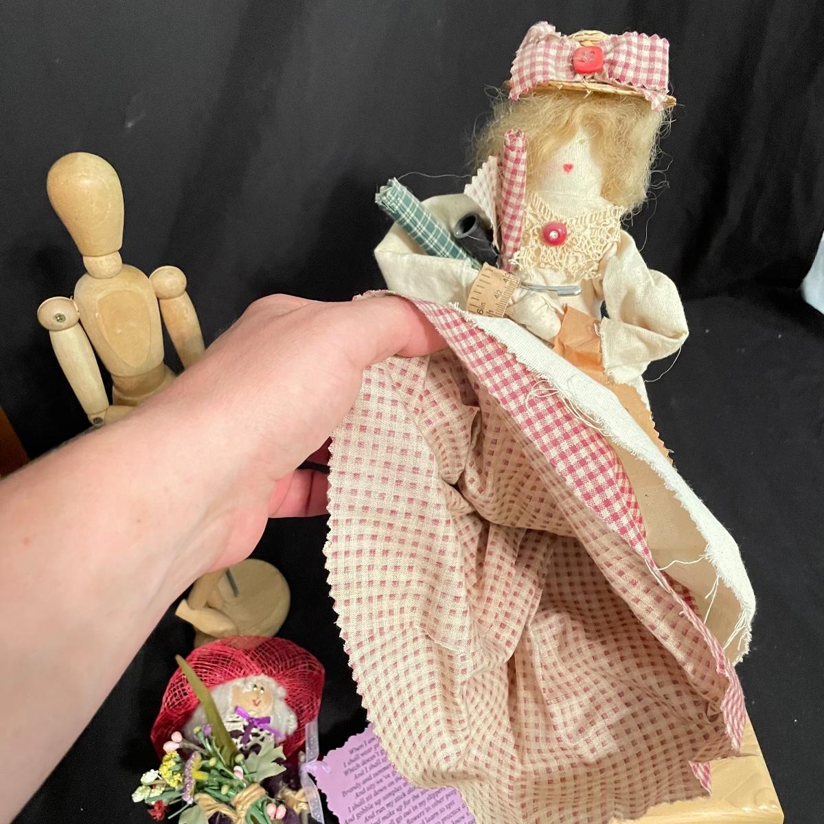 Seven heart shaped wooden racks with sliding ends to organize books, CDs, fabric, yarn or more! Fully extended at 18” x 5.5” x 7”. Lot also features metal racks for displaying art such as quilts or needle work. Dolls, figurines, a signed basket pin cushion and more! The bobbin doll is about 10”. See images. Note that the shelf has a small stain. Local pick up only.