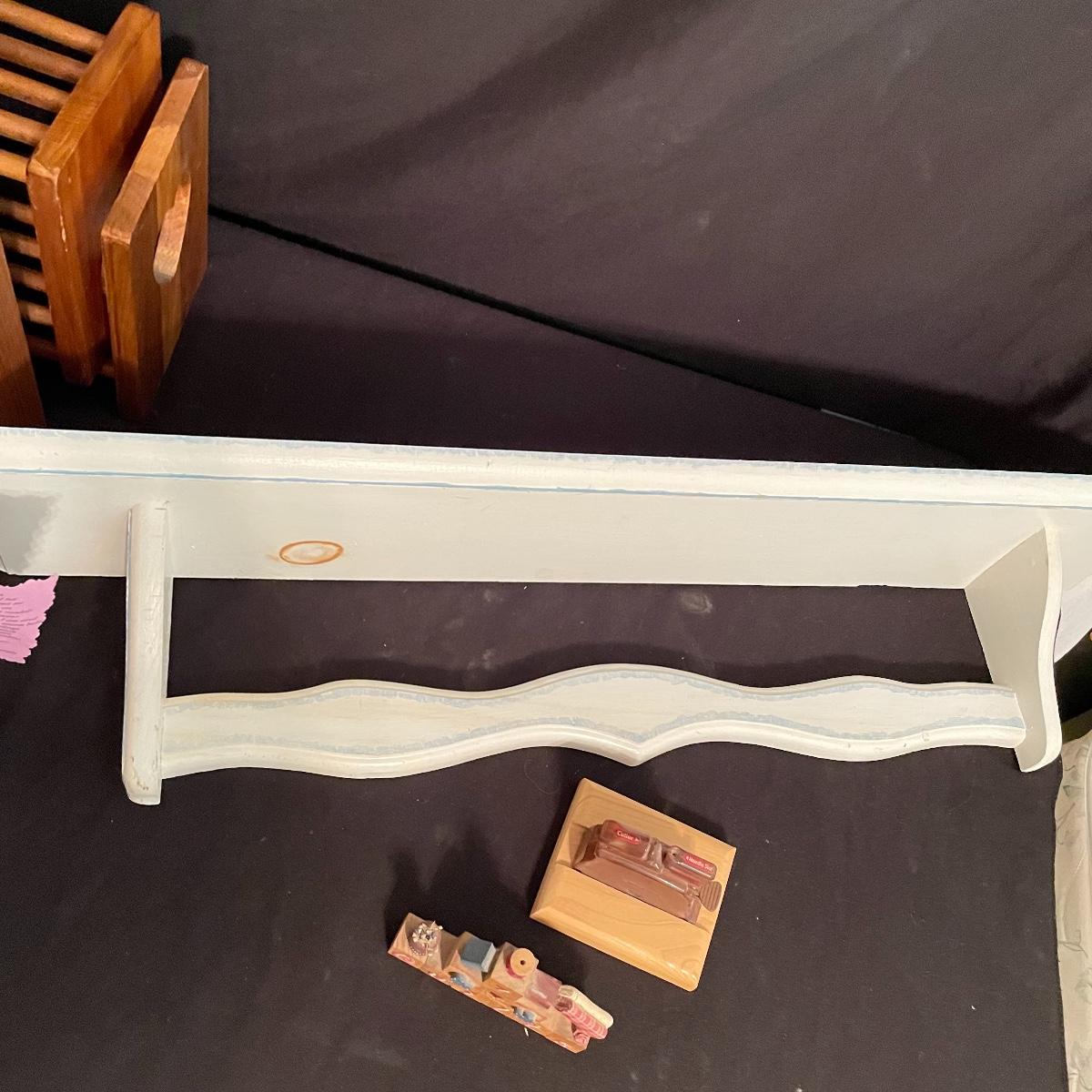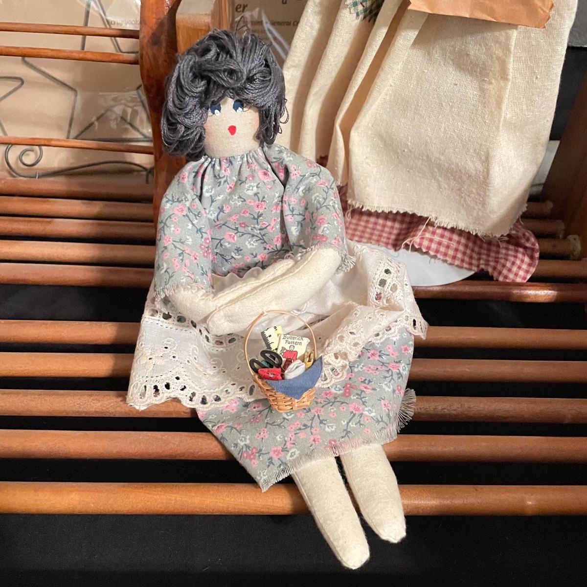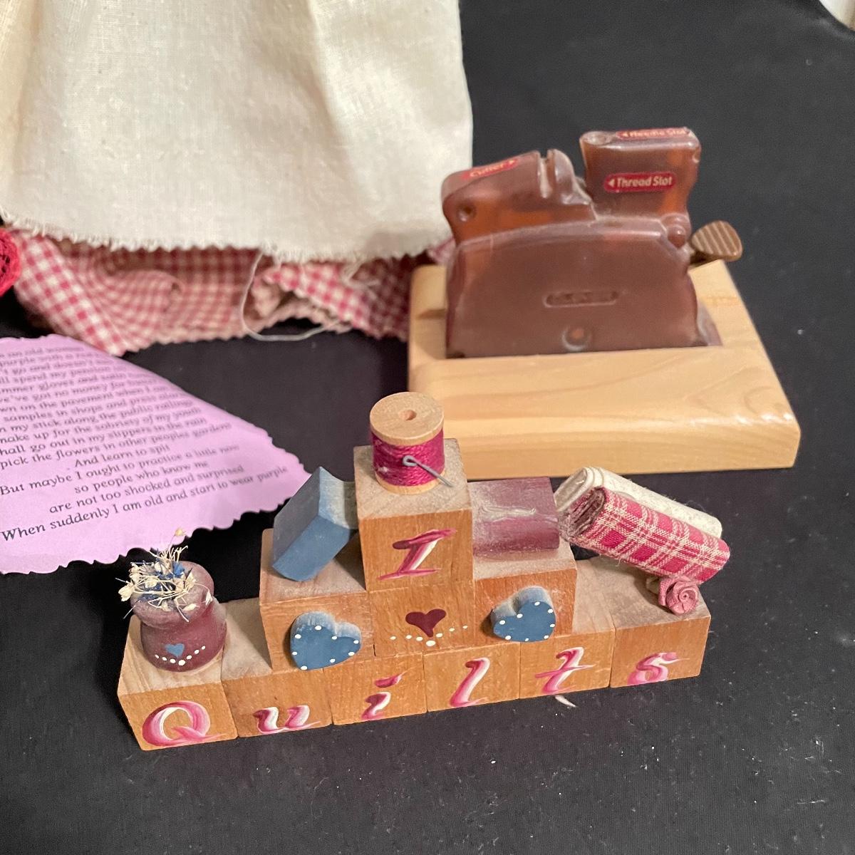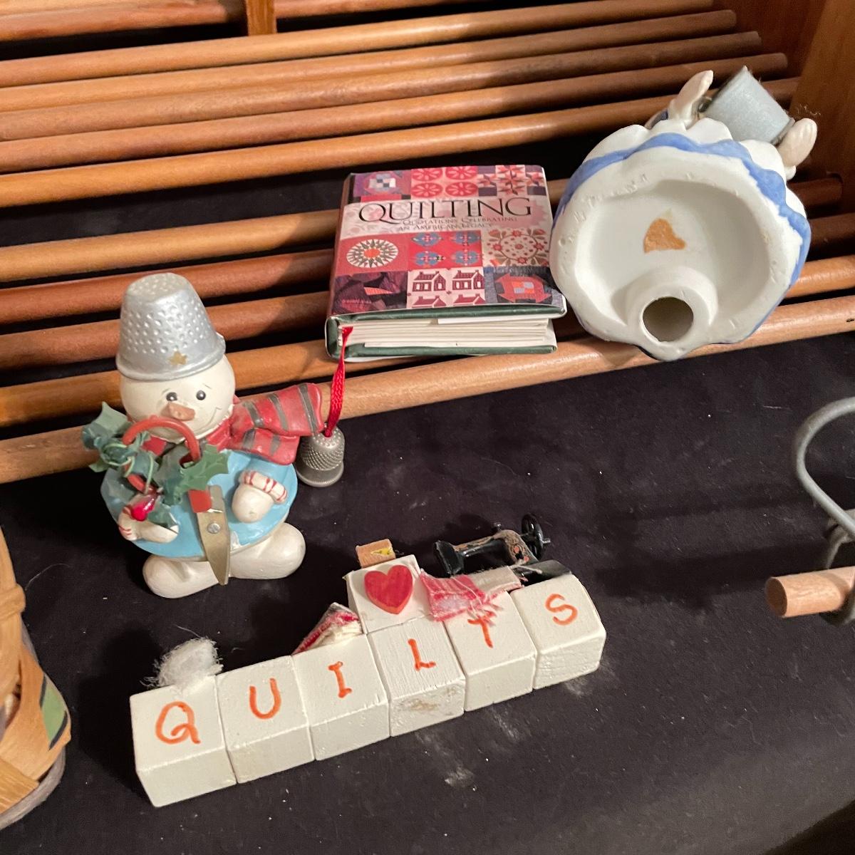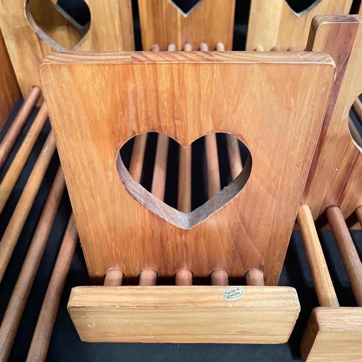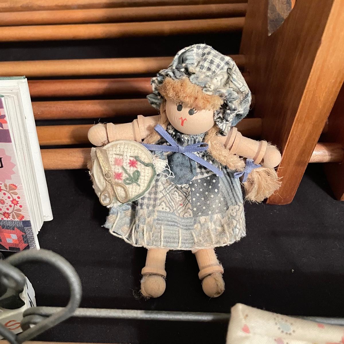 Seven heart shaped wooden racks with sliding ends to organize books, CDs, fabric, yarn or more! Fully extended at 18” x 5.5” x 7”. Lot also features metal racks for displaying art such as quilts or needle work. Dolls, figurines, a signed basket pin cushion and more! The bobbin doll is about 10”. See images. Note that the shelf has a small stain. Local pick up only.