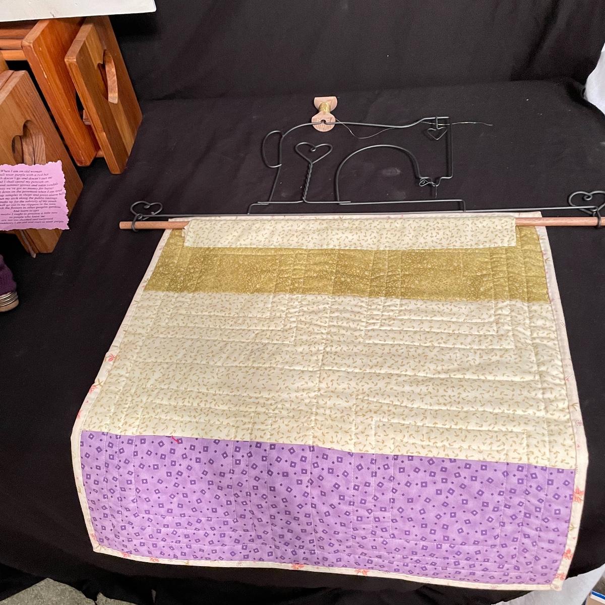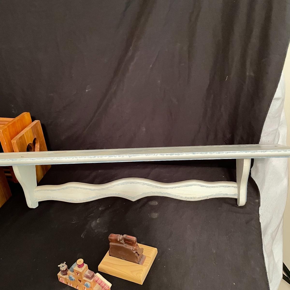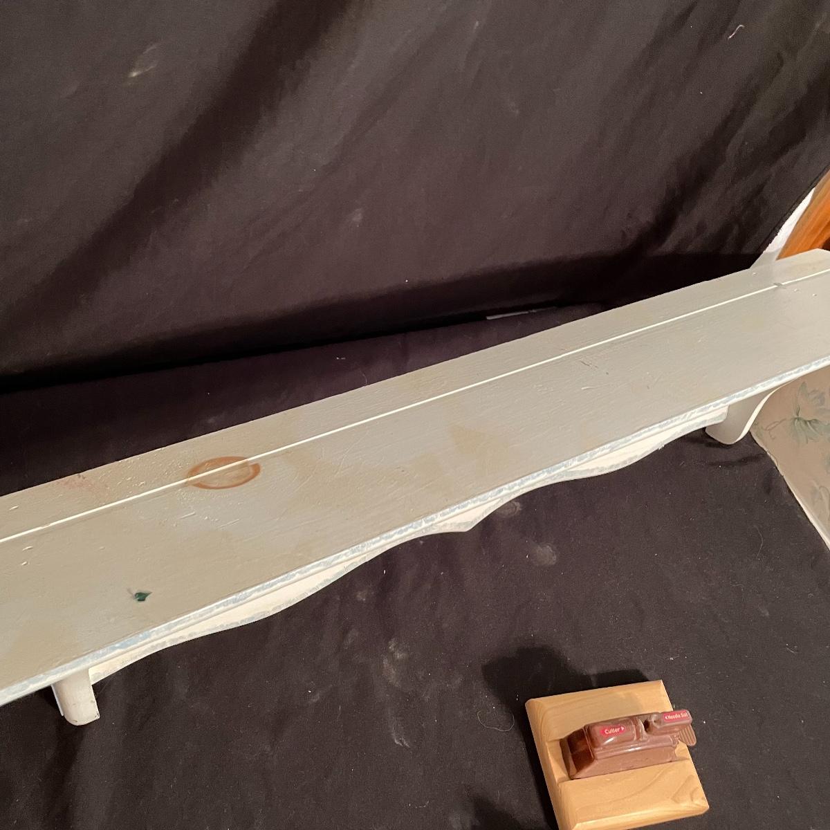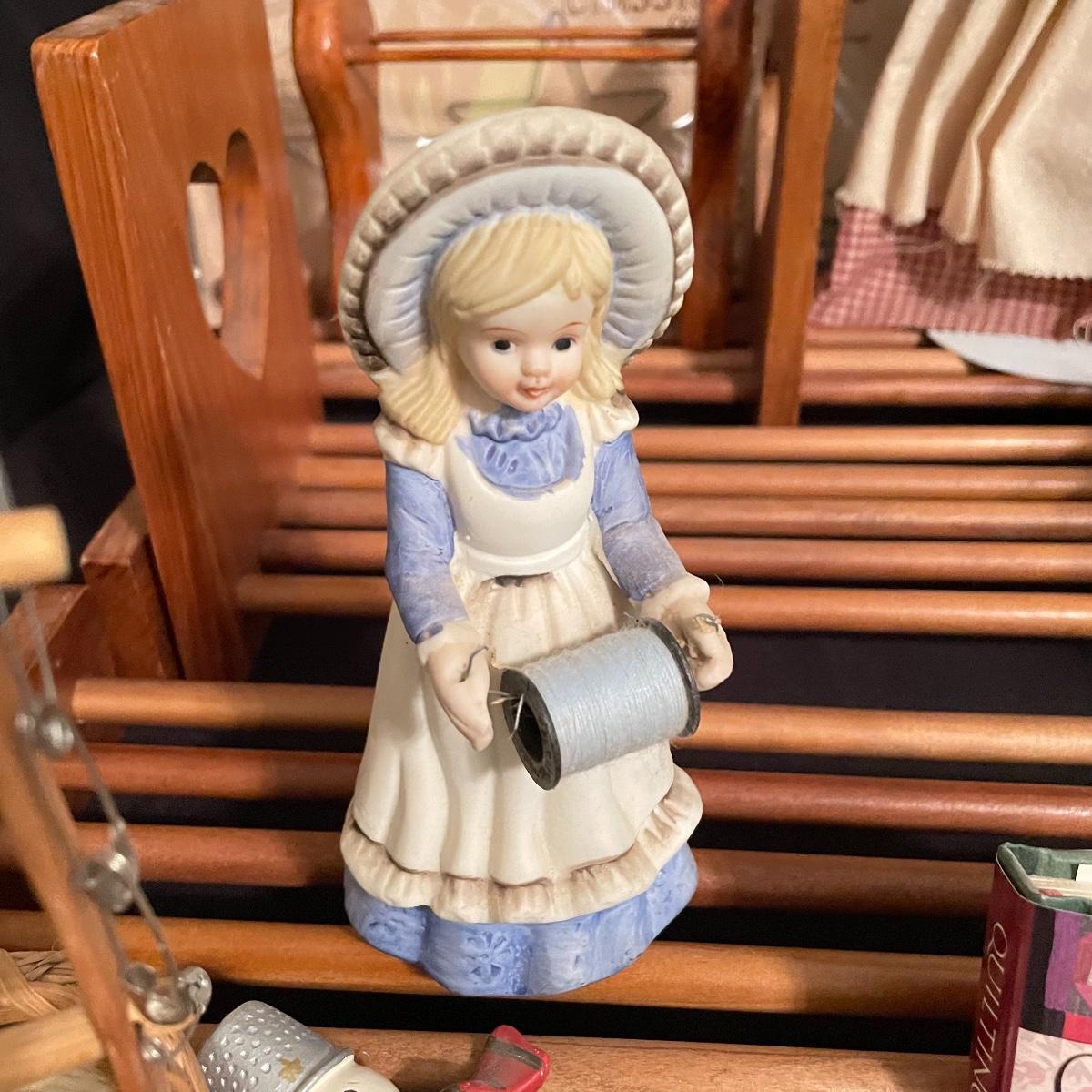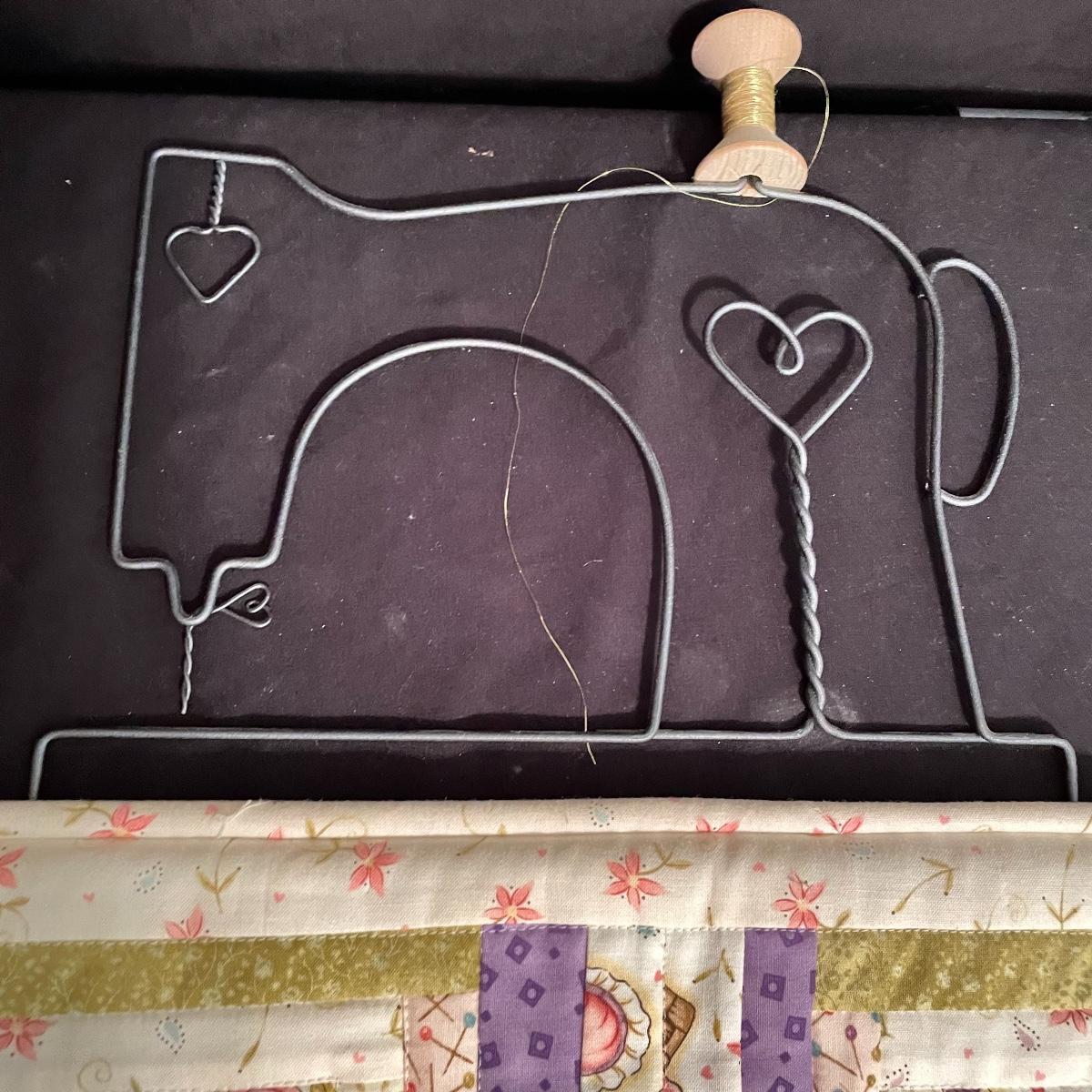 Seven heart shaped wooden racks with sliding ends to organize books, CDs, fabric, yarn or more! Fully extended at 18” x 5.5” x 7”. Lot also features metal racks for displaying art such as quilts or needle work. Dolls, figurines, a signed basket pin cushion and more! The bobbin doll is about 10”. See images. Note that the shelf has a small stain. Local pick up only.