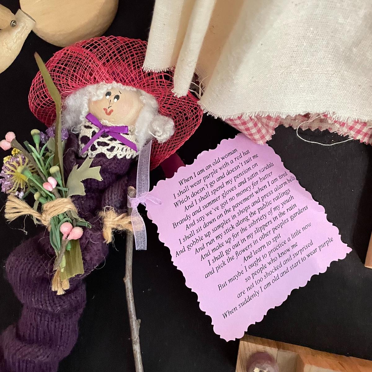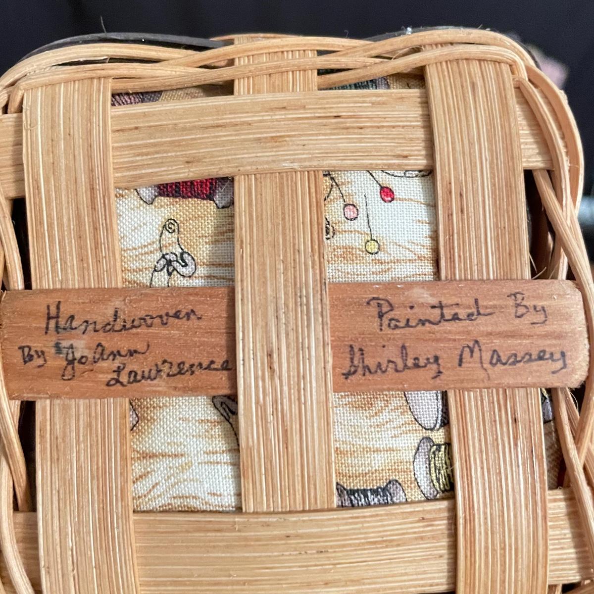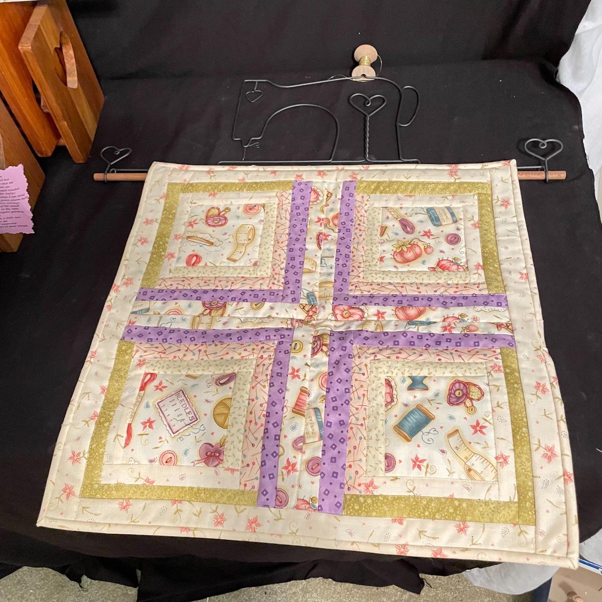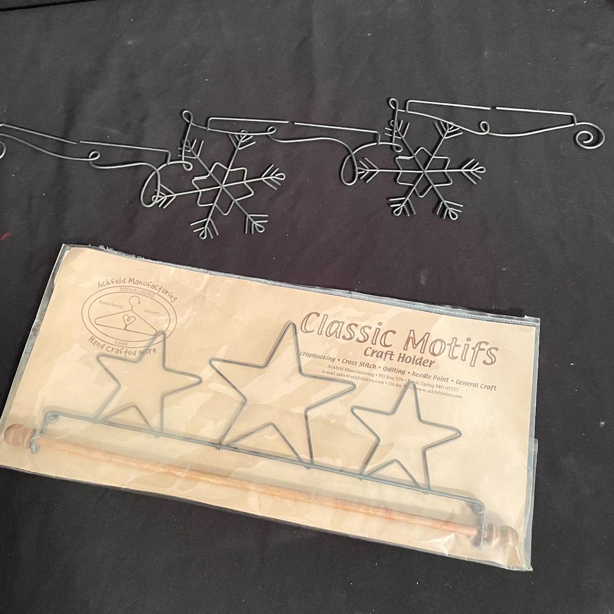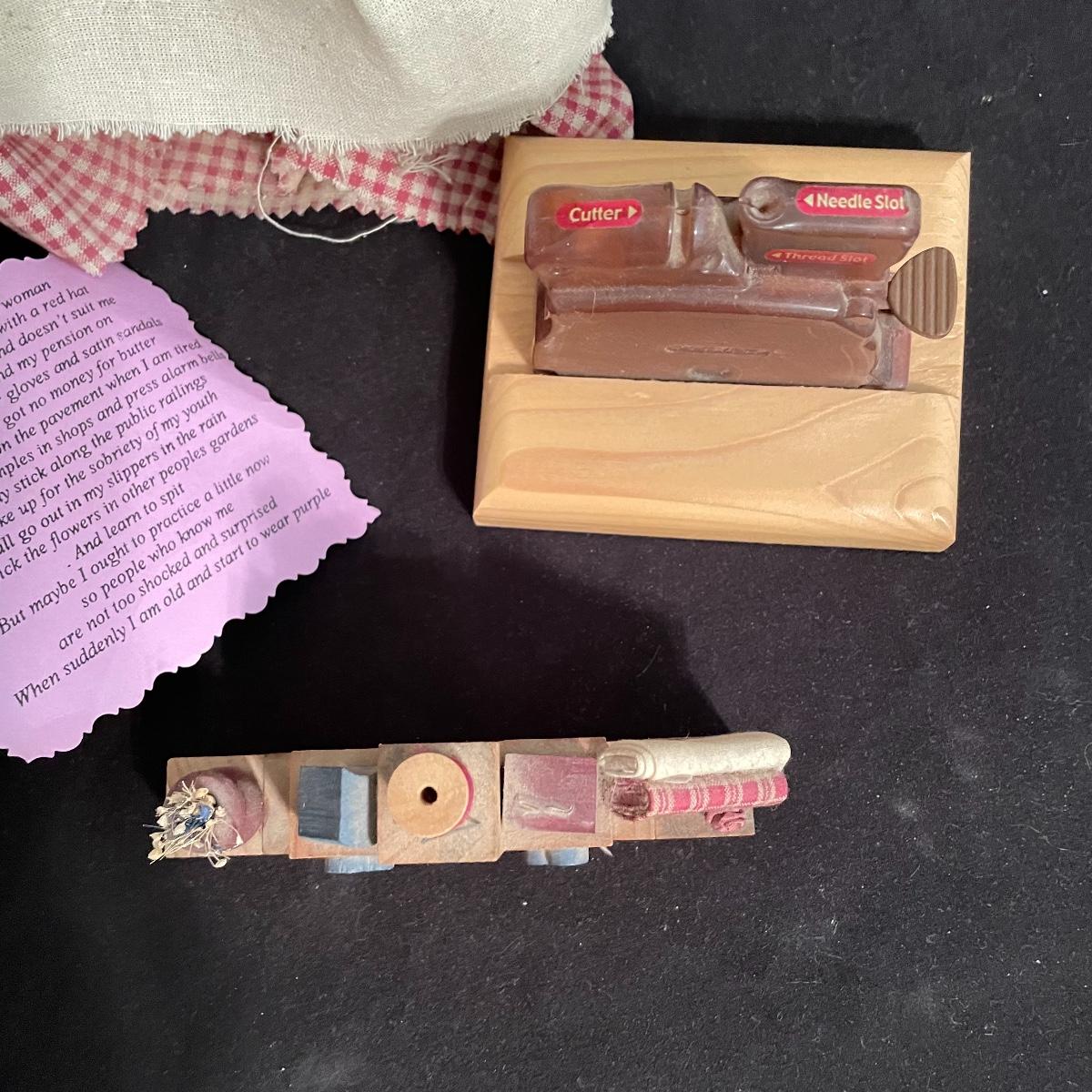 Seven heart shaped wooden racks with sliding ends to organize books, CDs, fabric, yarn or more! Fully extended at 18” x 5.5” x 7”. Lot also features metal racks for displaying art such as quilts or needle work. Dolls, figurines, a signed basket pin cushion and more! The bobbin doll is about 10”. See images. Note that the shelf has a small stain. Local pick up only.