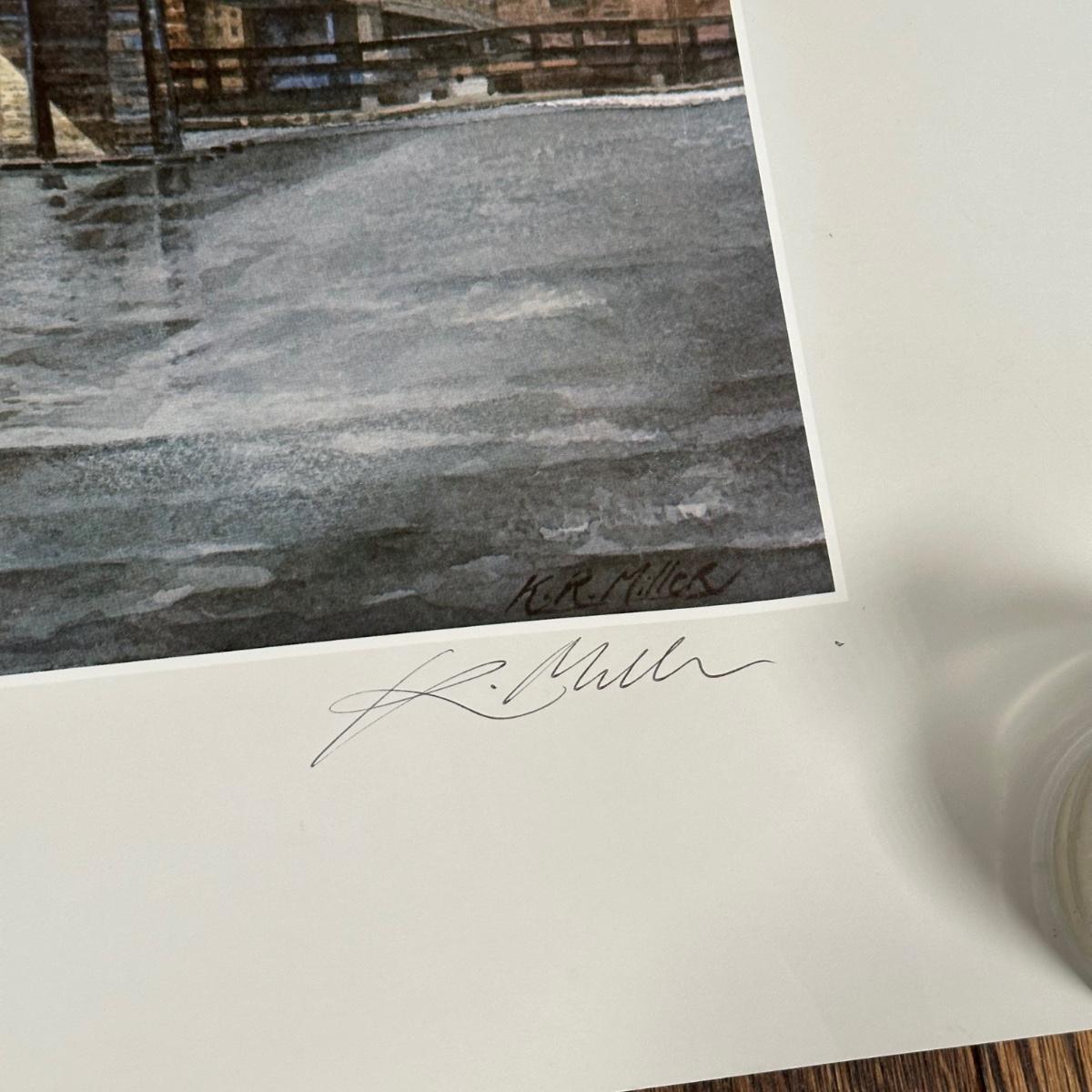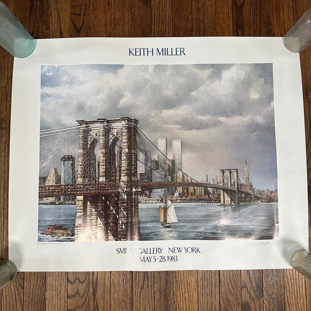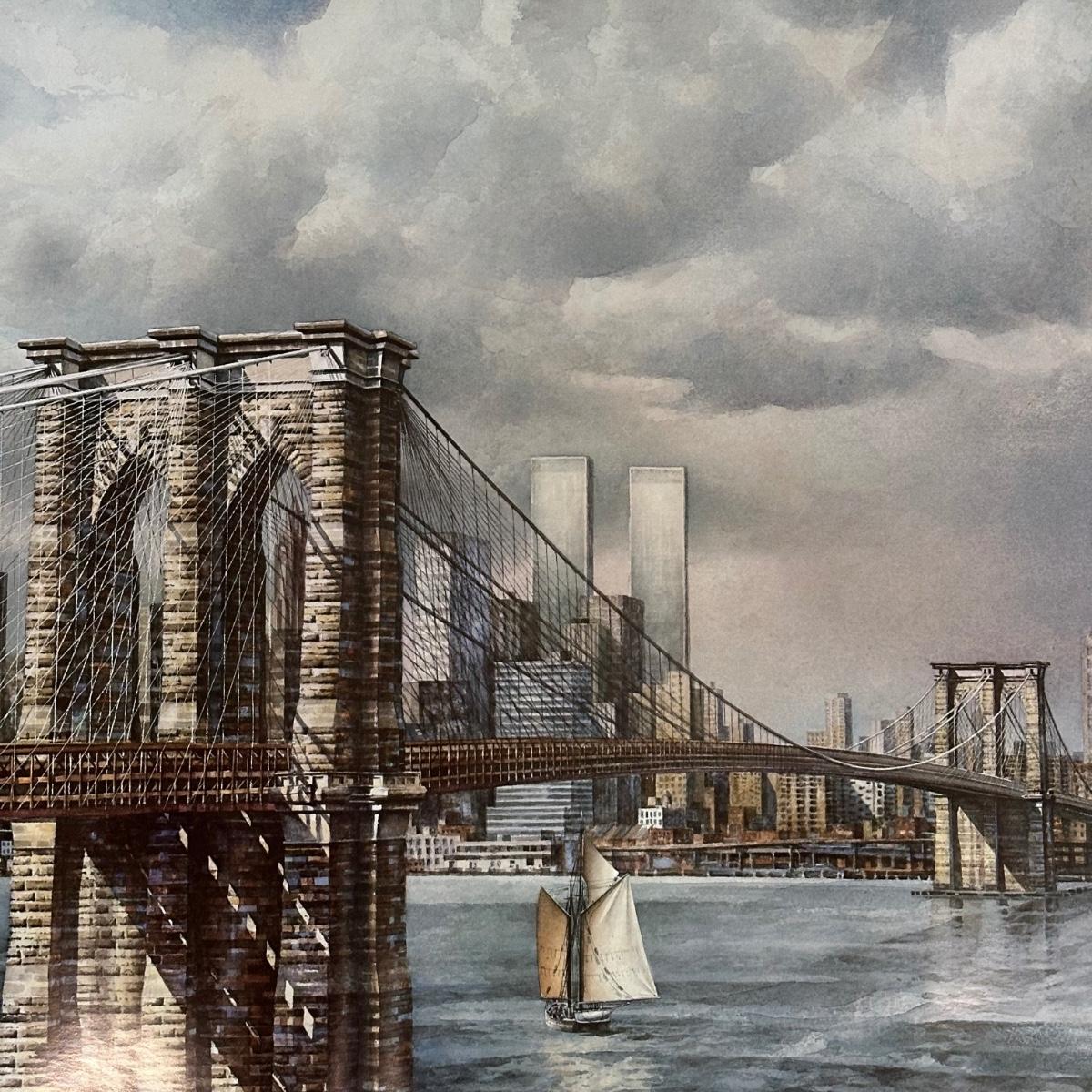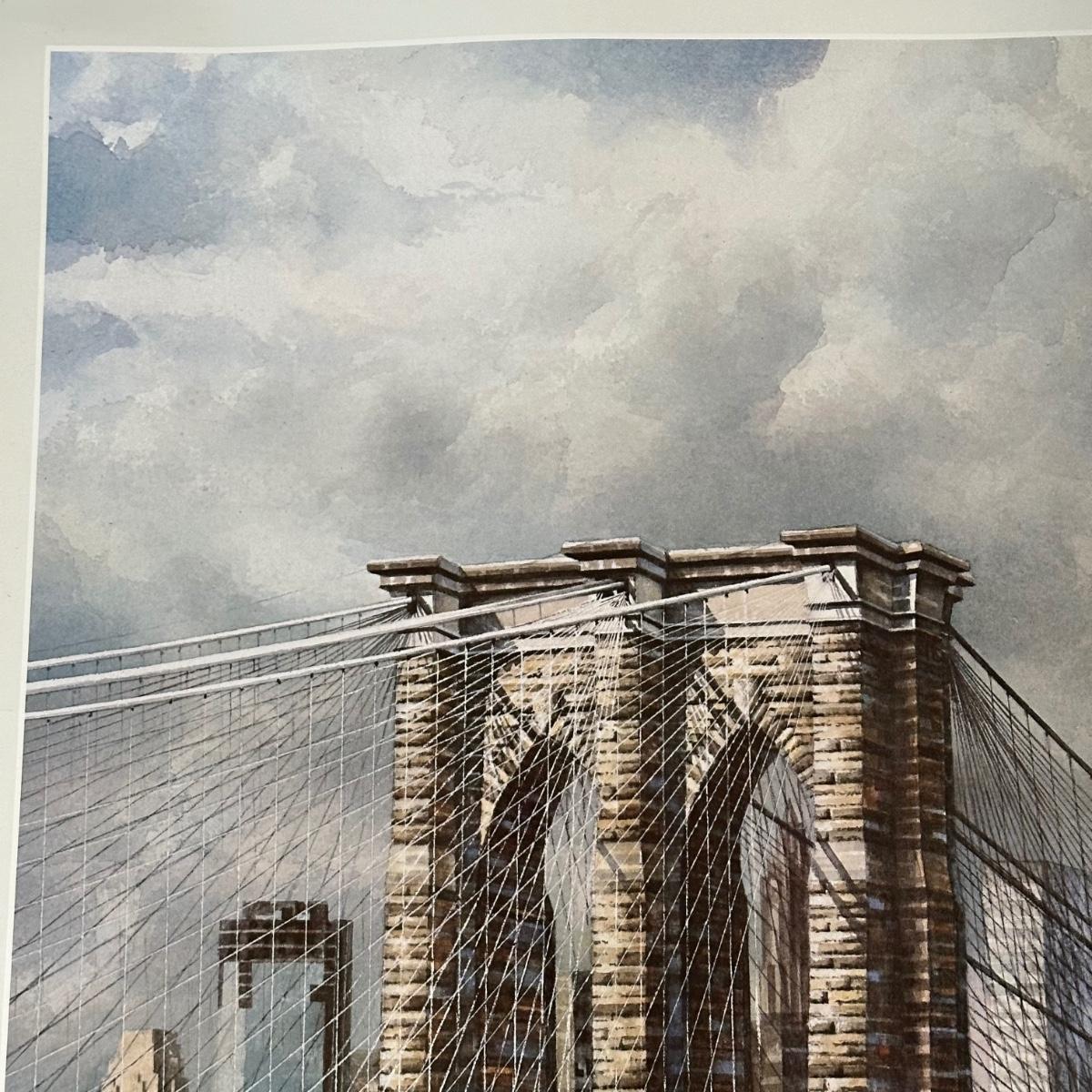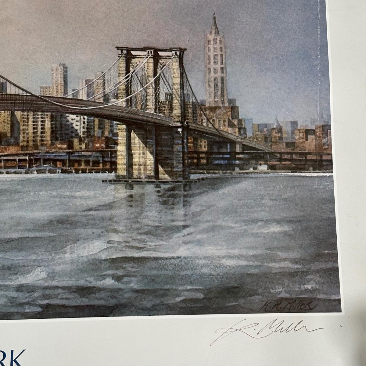 LOT 331Z: Brooklyn Bridge Manhattan Skyline Signed Watercolor Print by Keith Miller RARE