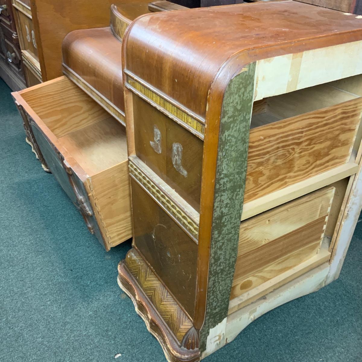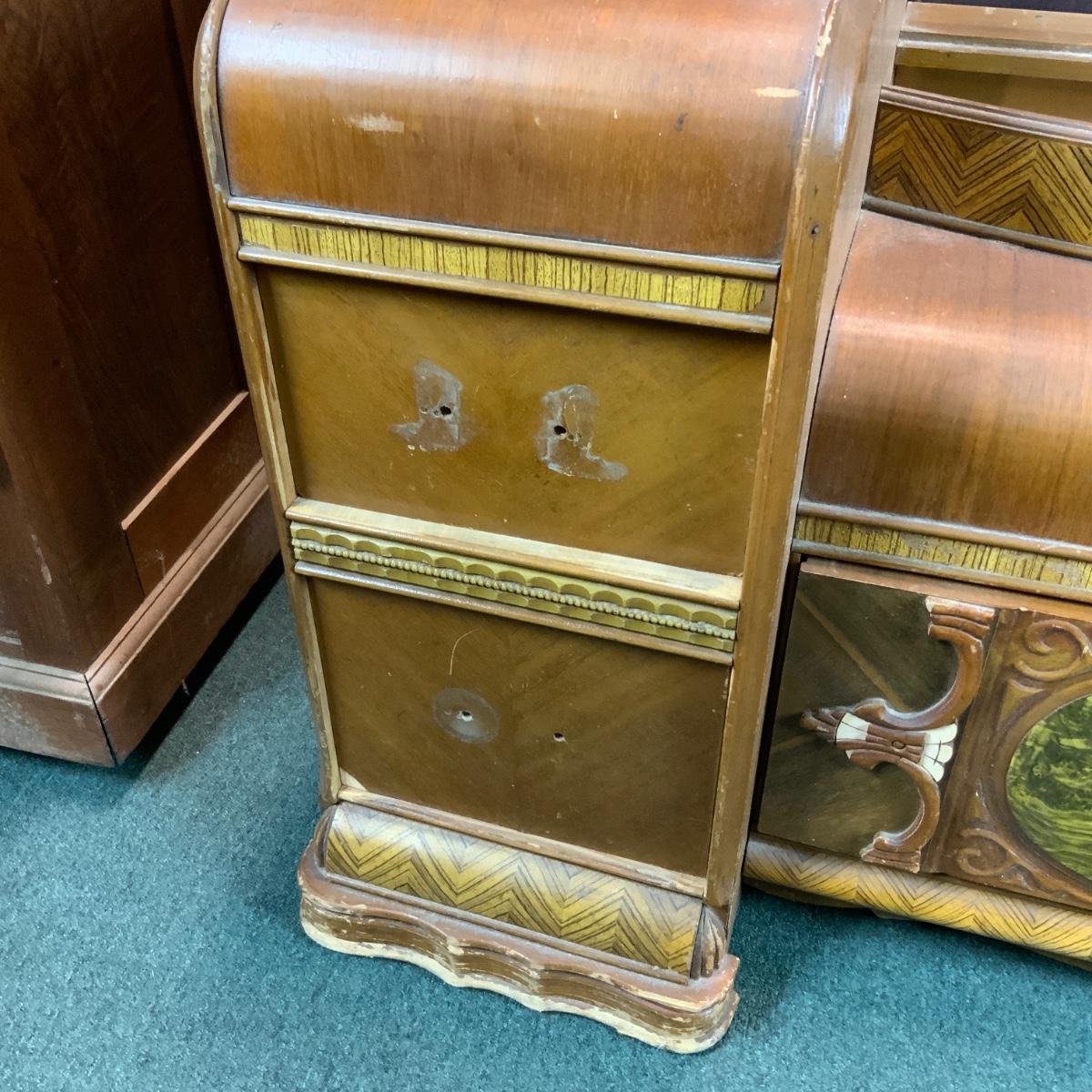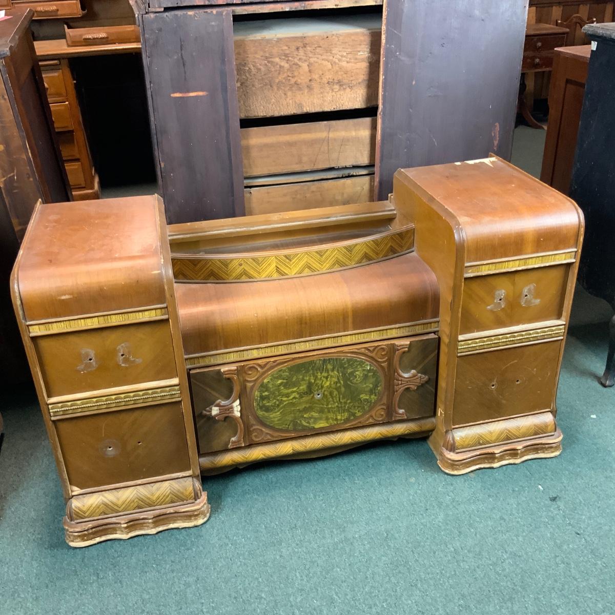 Art Deco Vanity, no hardware. Could easily be converted into two nightstands too! If you need a mirror-we got one for ya! //::\\ Please see photos for details and condition. No attempt has been made to hide any imperfections. All items listed in this auction are warehouse items, and need to be cleaned. A majority of the items need restoration as well. All items are sold AS IS and WITHOUT GUARANTEE. If you are uncertain about an item, DO NOT BID. Due to the nature of this online auction in-person inspection is HIGHLY recommended. All Sales are FINAL. Pick Up Times are FIRM. Please confirm with your own schedule that you can pick up in the scheduled times listed in the Terms and Conditions. Any questions please message the auctioneer. DO NOT Contact The Harp Gallery.