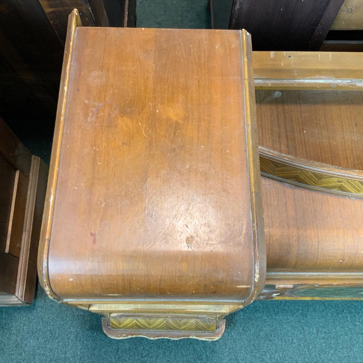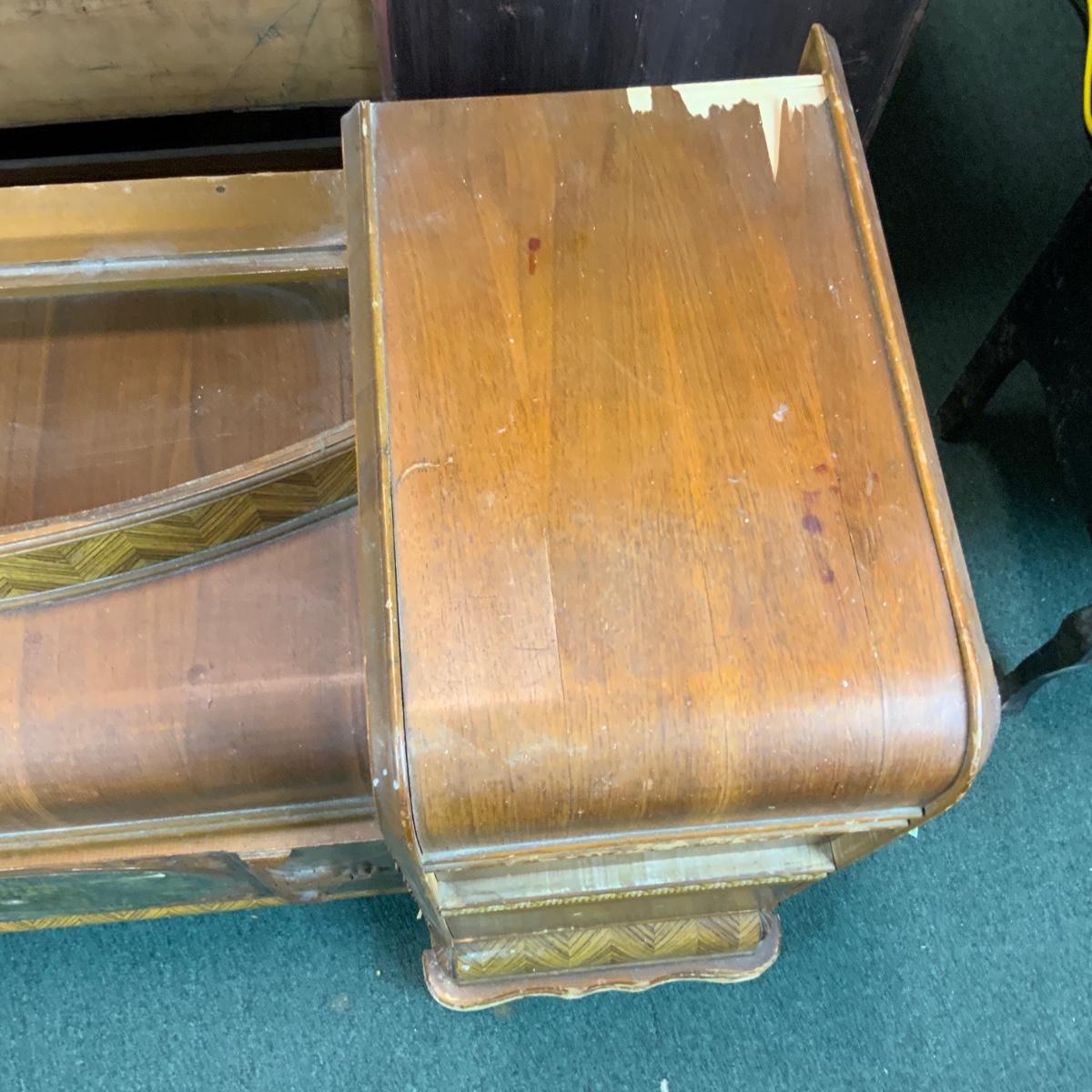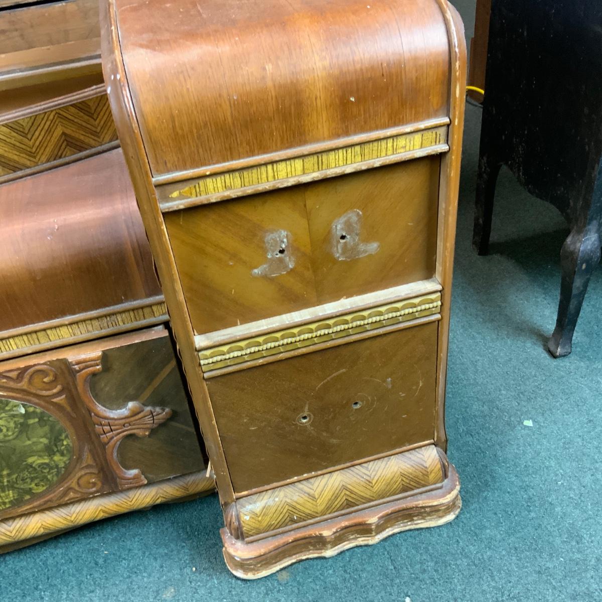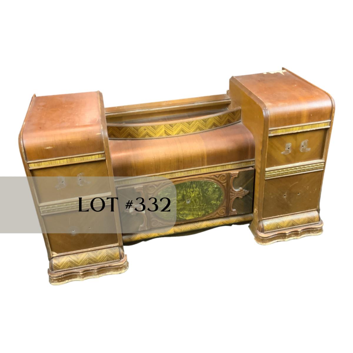 Art Deco Vanity, no hardware. Could easily be converted into two nightstands too! If you need a mirror-we got one for ya! //::\\ Please see photos for details and condition. No attempt has been made to hide any imperfections. All items listed in this auction are warehouse items, and need to be cleaned. A majority of the items need restoration as well. All items are sold AS IS and WITHOUT GUARANTEE. If you are uncertain about an item, DO NOT BID. Due to the nature of this online auction in-person inspection is HIGHLY recommended. All Sales are FINAL. Pick Up Times are FIRM. Please confirm with your own schedule that you can pick up in the scheduled times listed in the Terms and Conditions. Any questions please message the auctioneer. DO NOT Contact The Harp Gallery.