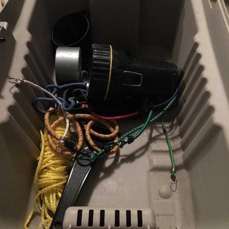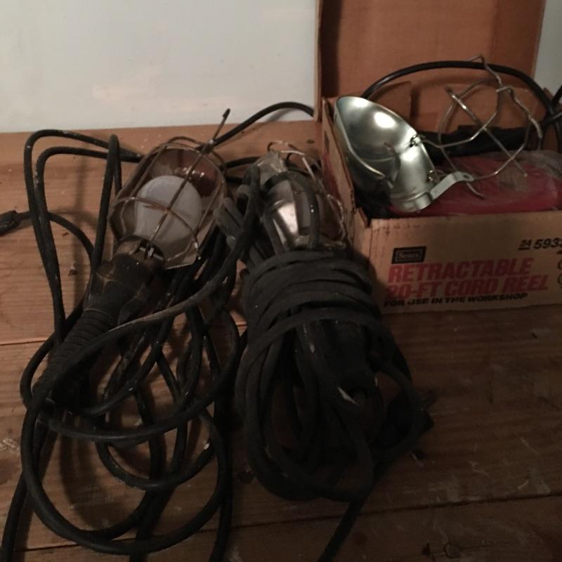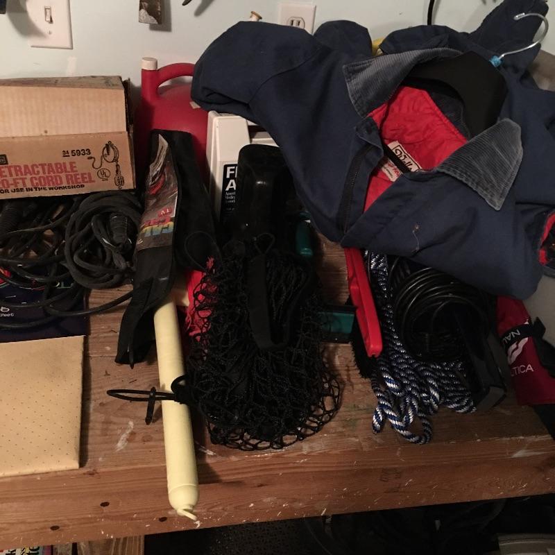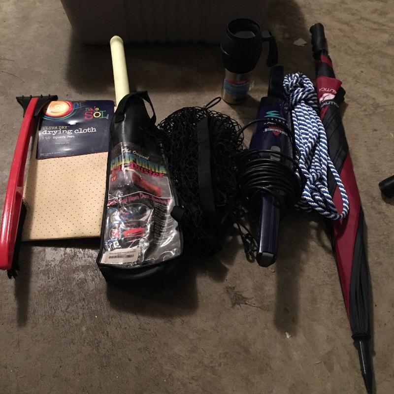 Car lot includes insulated coveralls, vacuum, umbrella, retractable light, gas cans, scraper, first aid kit, rope, car duster and more.