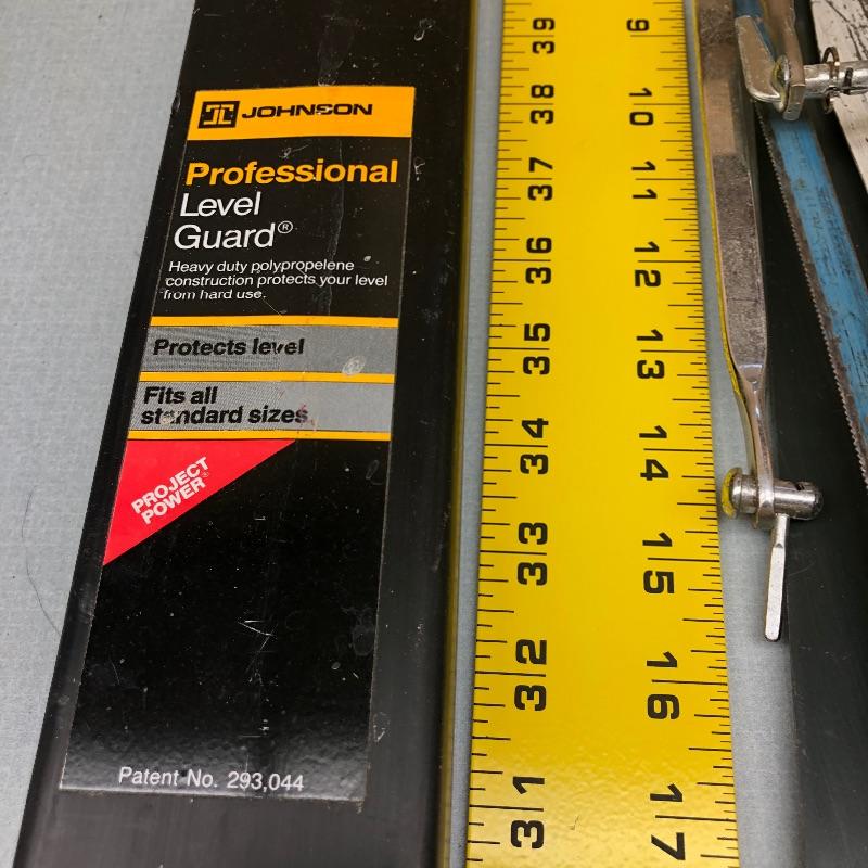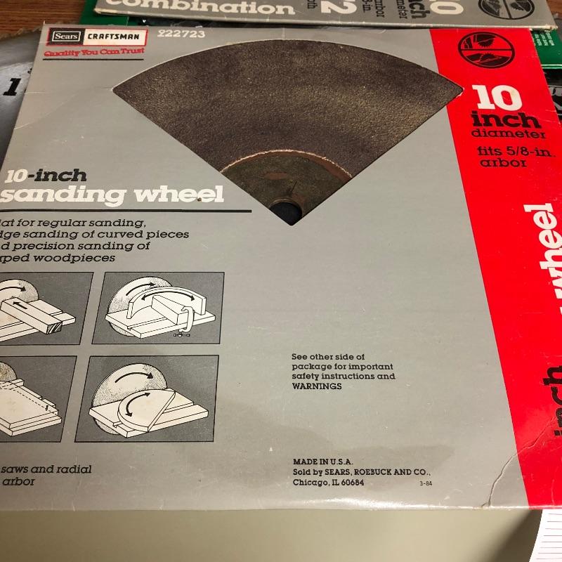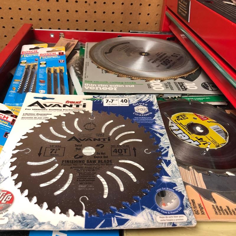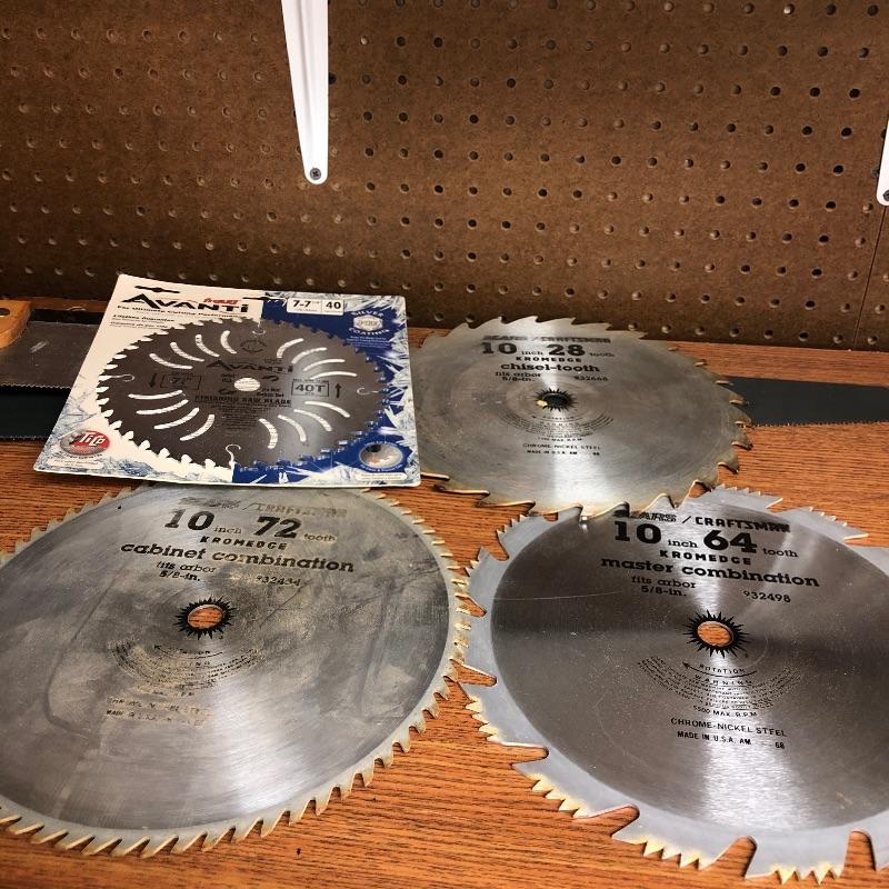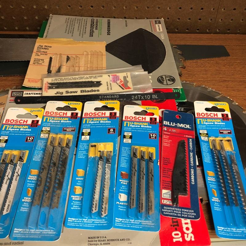 Assortment of hand saws, table saw blades in various sizes, small blades still in packages and a 4ft level in black case. Shipping available
