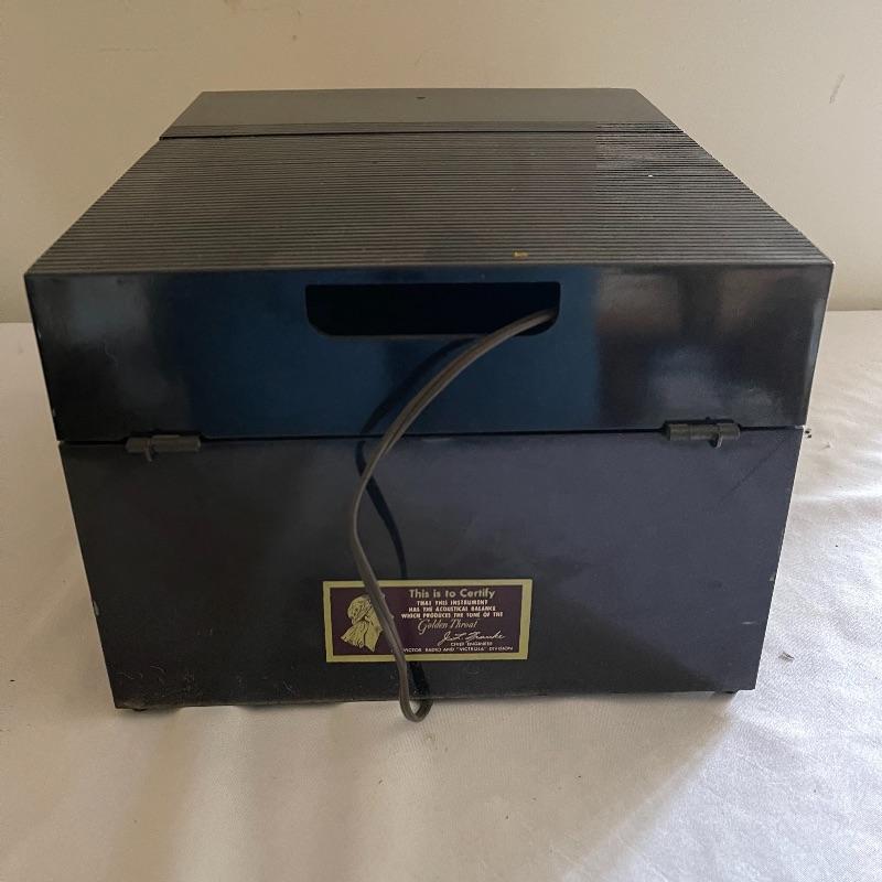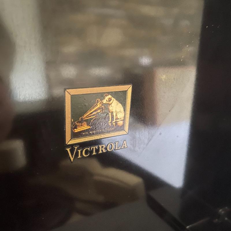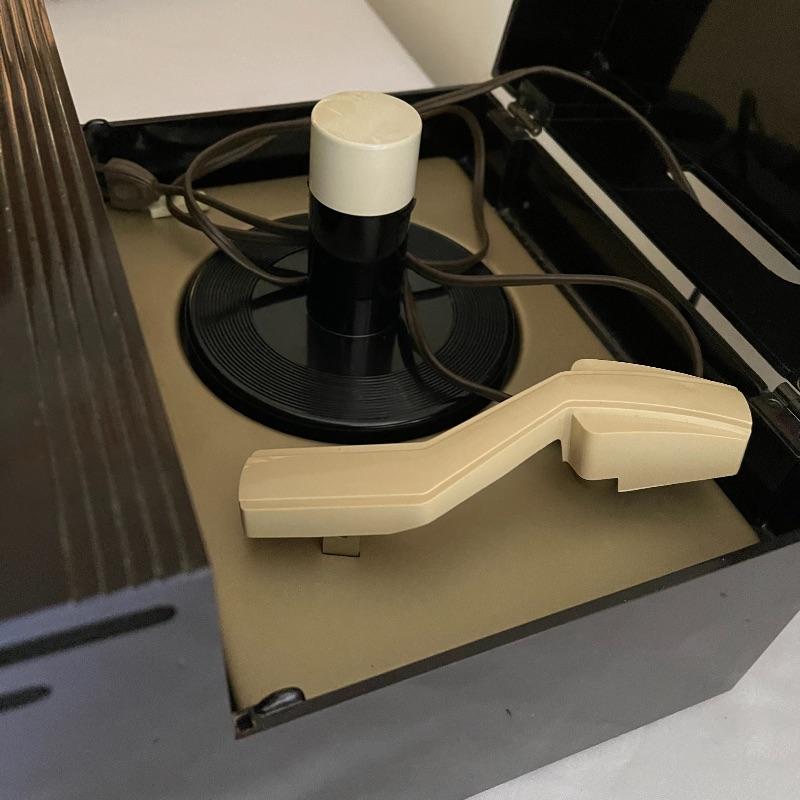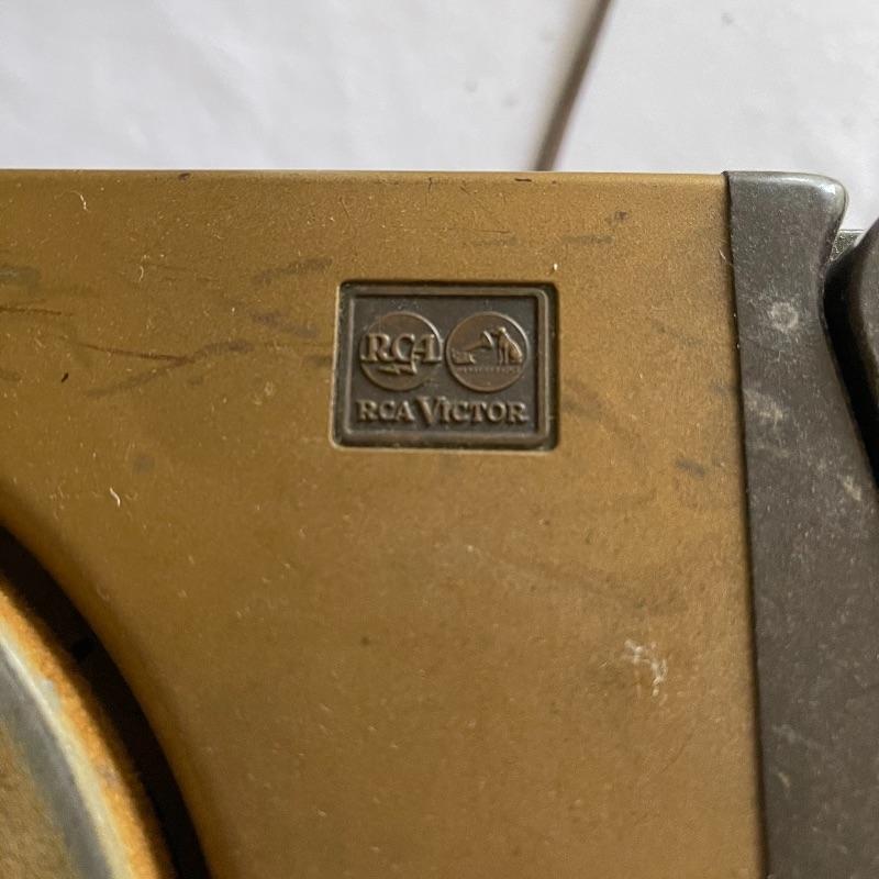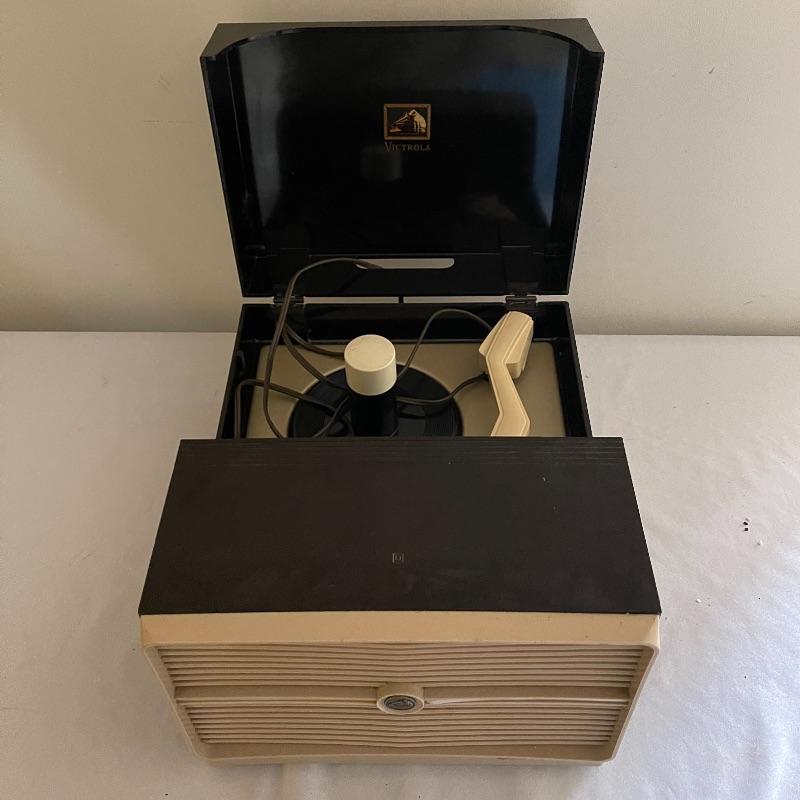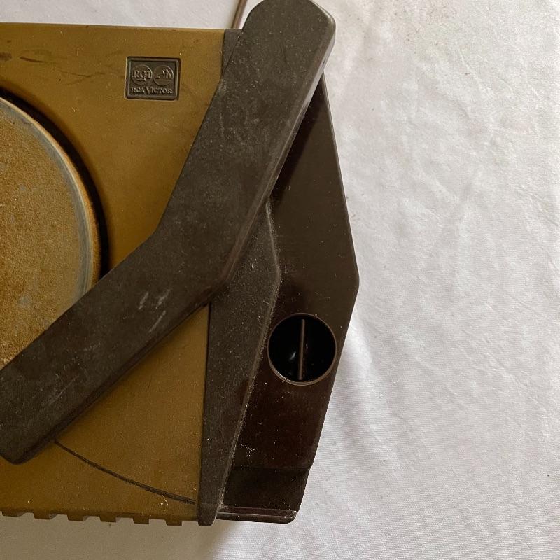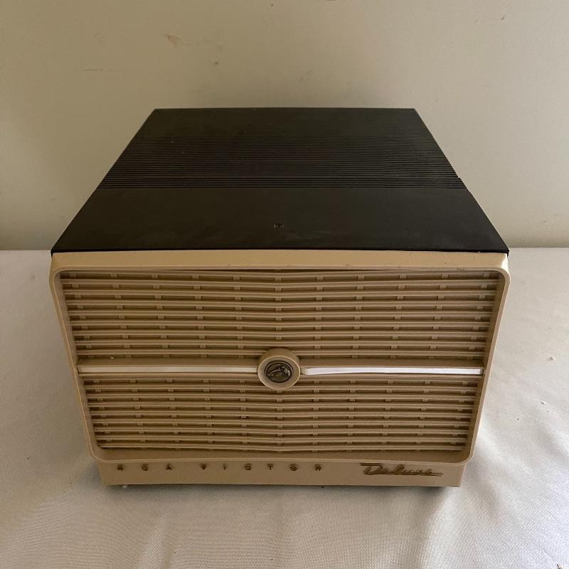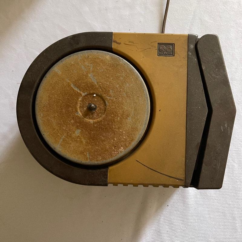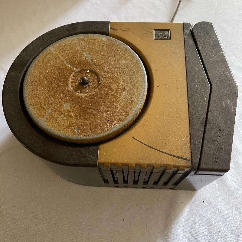 Three RCA Victor 45rpm turntables. One is not connected and it’s a model 45-J-3 Victrola. The largest is an RCA Victor Deluxe. The last is a turntable unit with an arm connected and hidden in the design of the body.