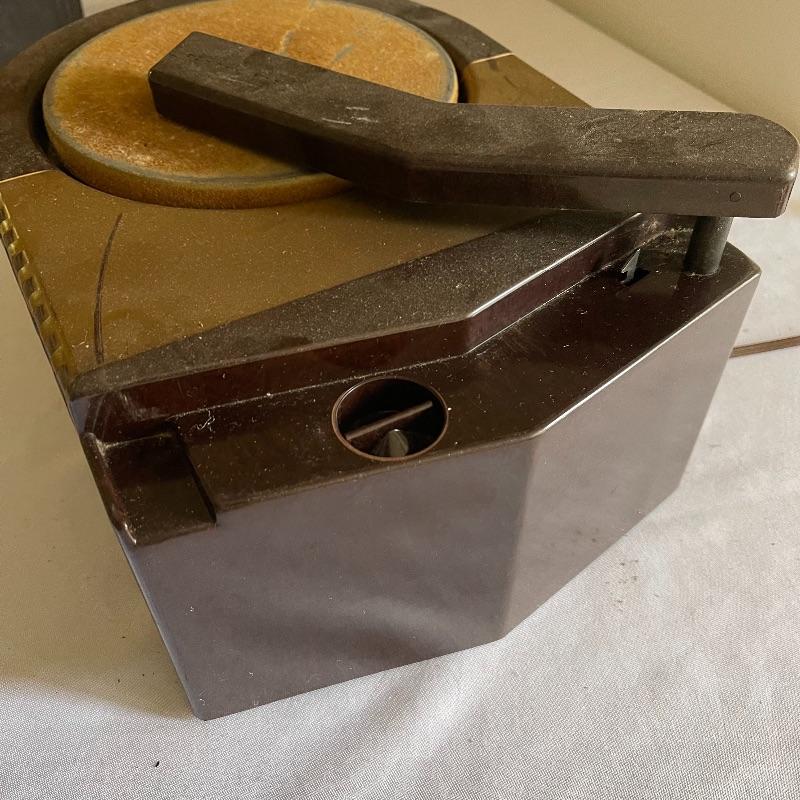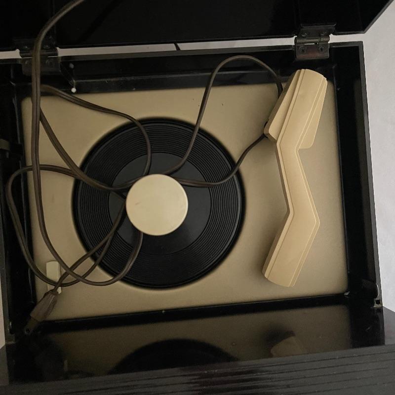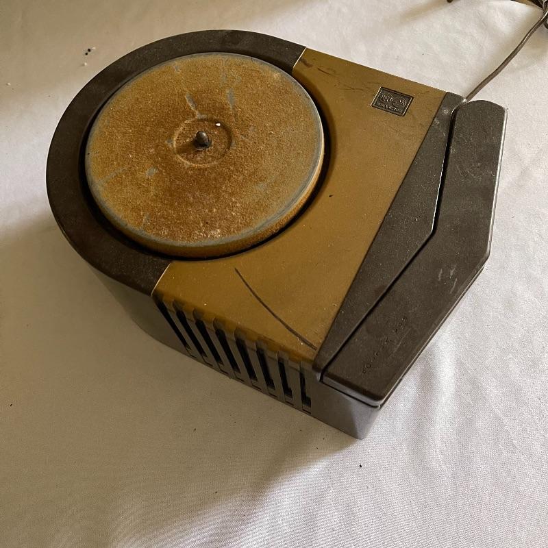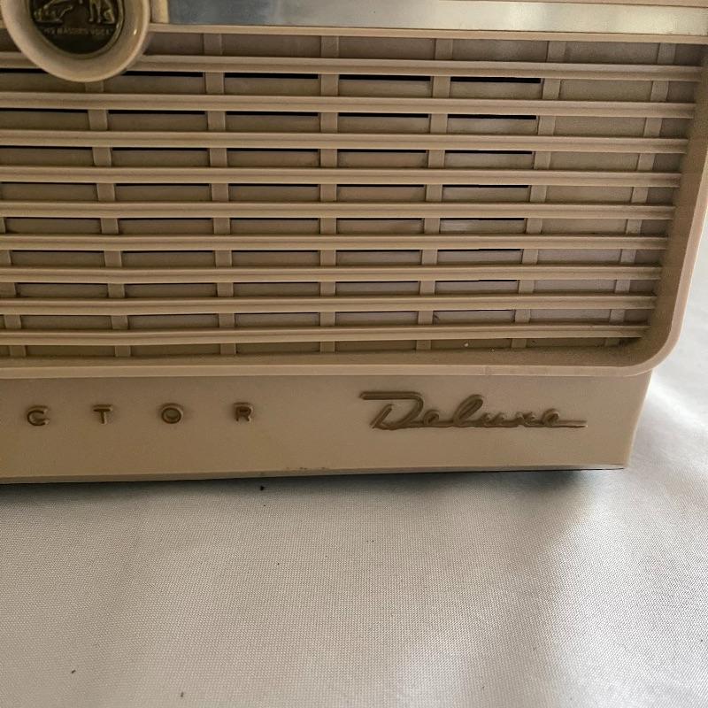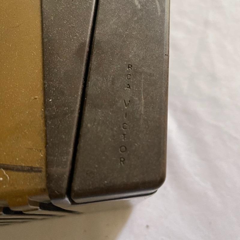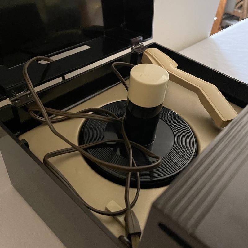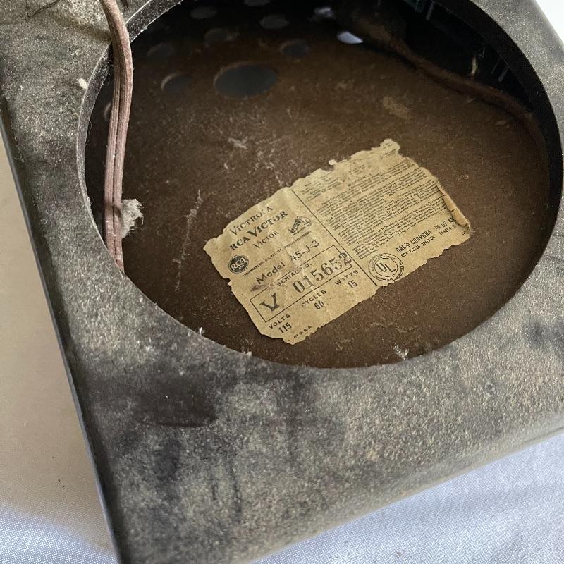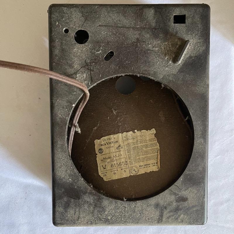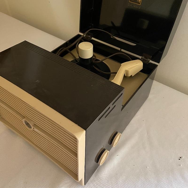 Three RCA Victor 45rpm turntables. One is not connected and it’s a model 45-J-3 Victrola. The largest is an RCA Victor Deluxe. The last is a turntable unit with an arm connected and hidden in the design of the body.
