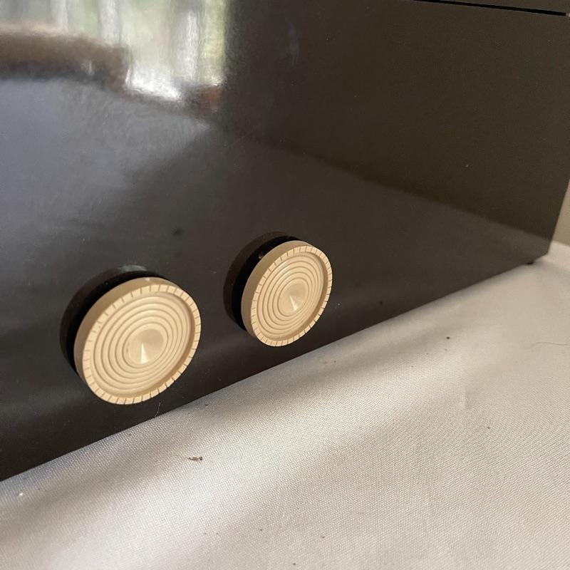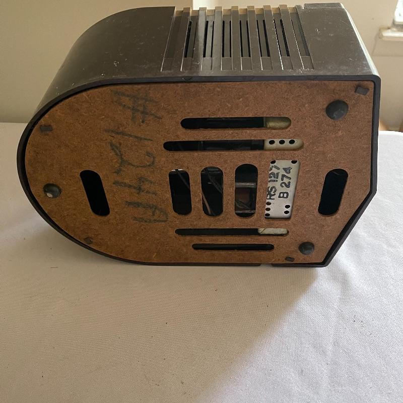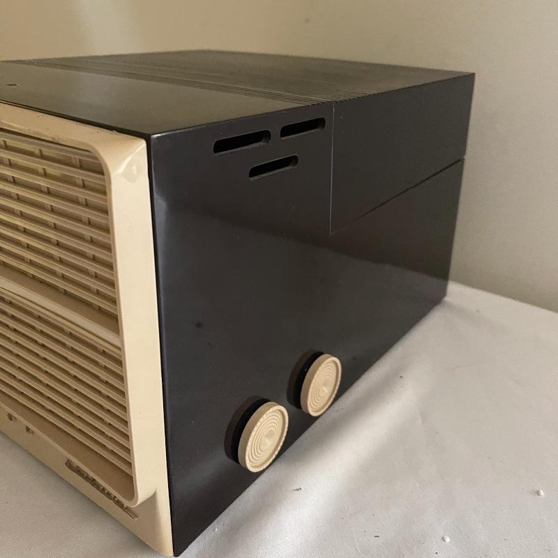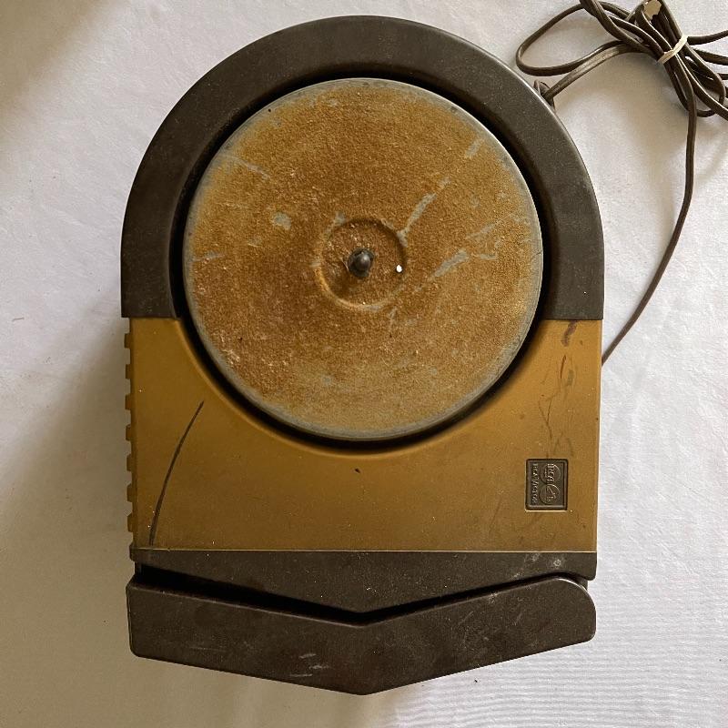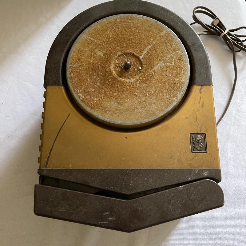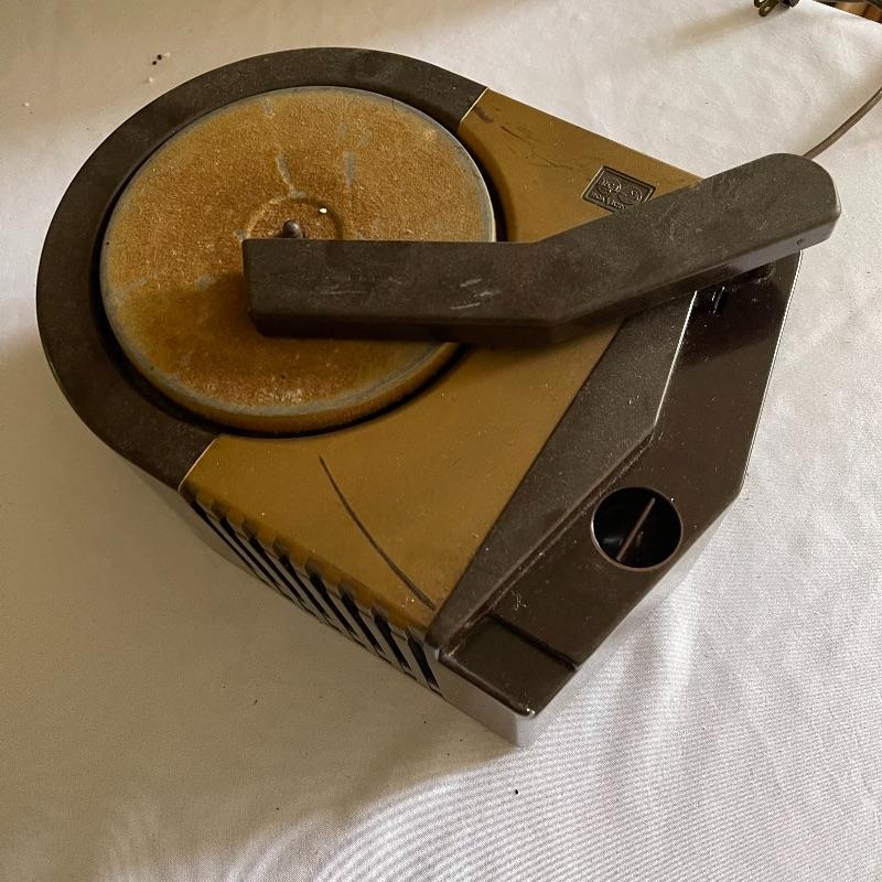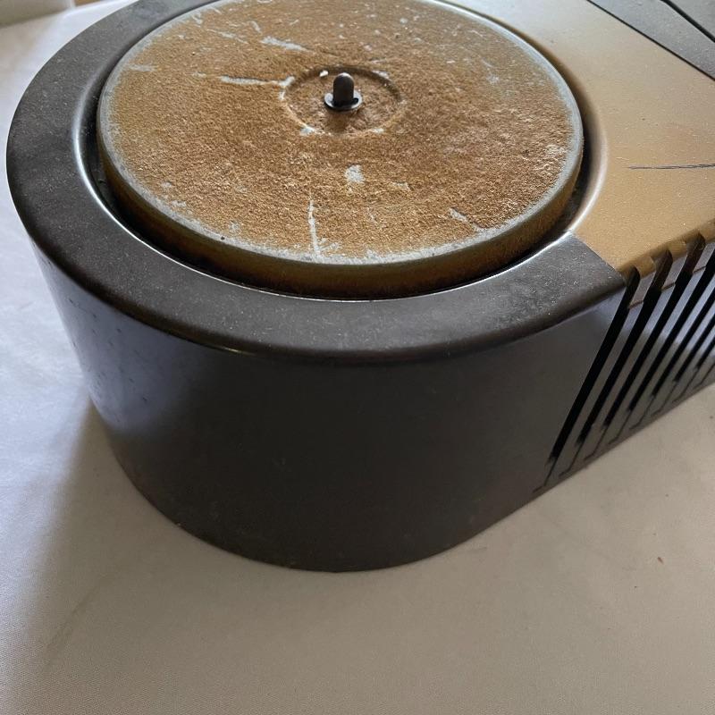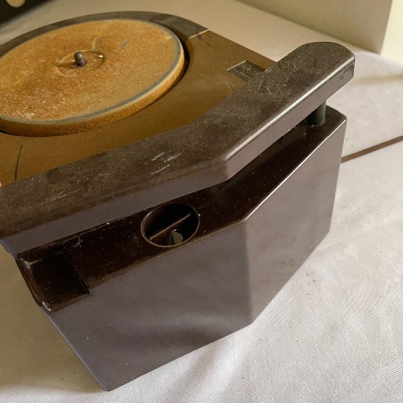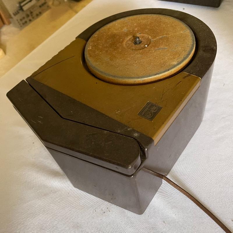 Three RCA Victor 45rpm turntables. One is not connected and it’s a model 45-J-3 Victrola. The largest is an RCA Victor Deluxe. The last is a turntable unit with an arm connected and hidden in the design of the body.