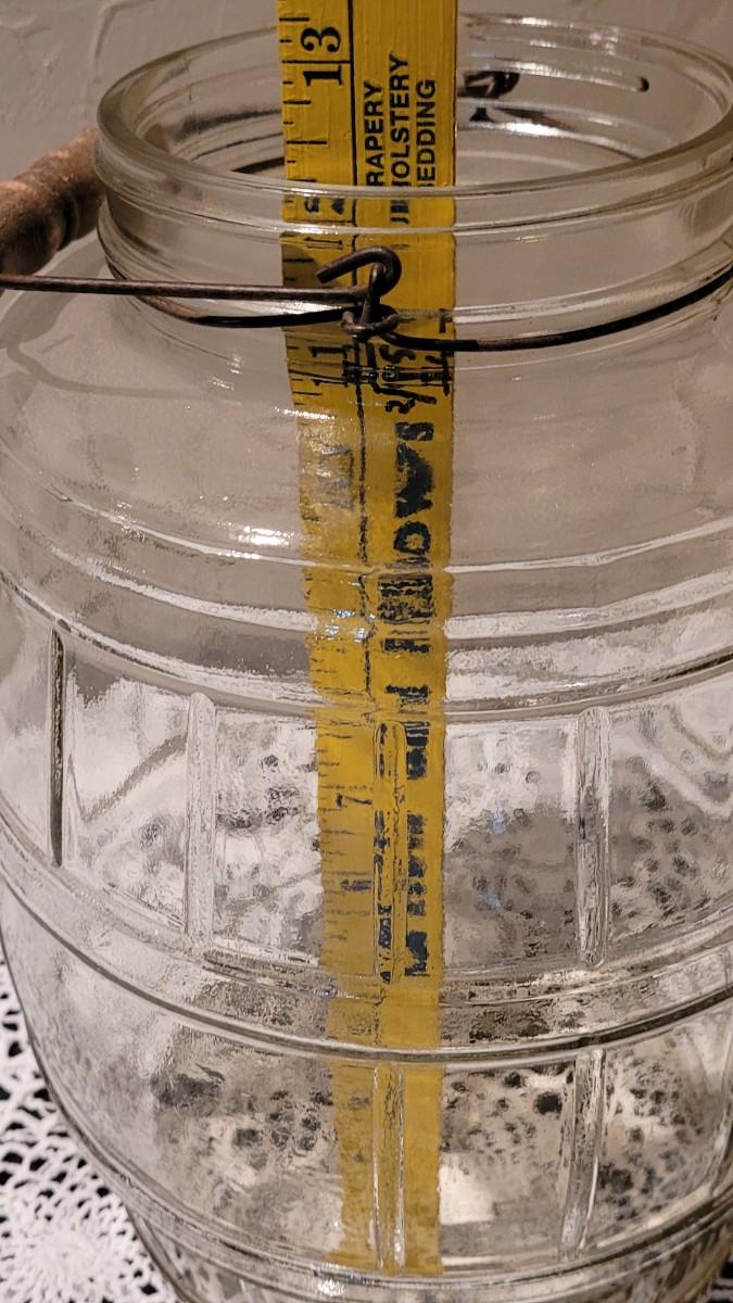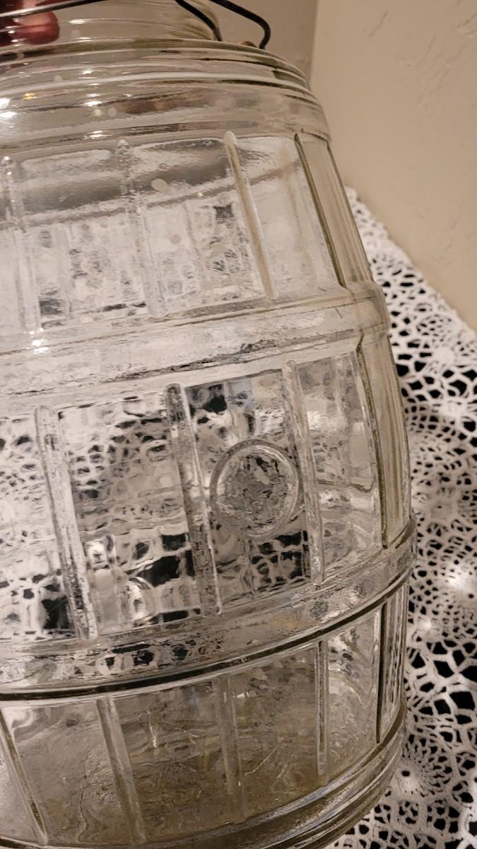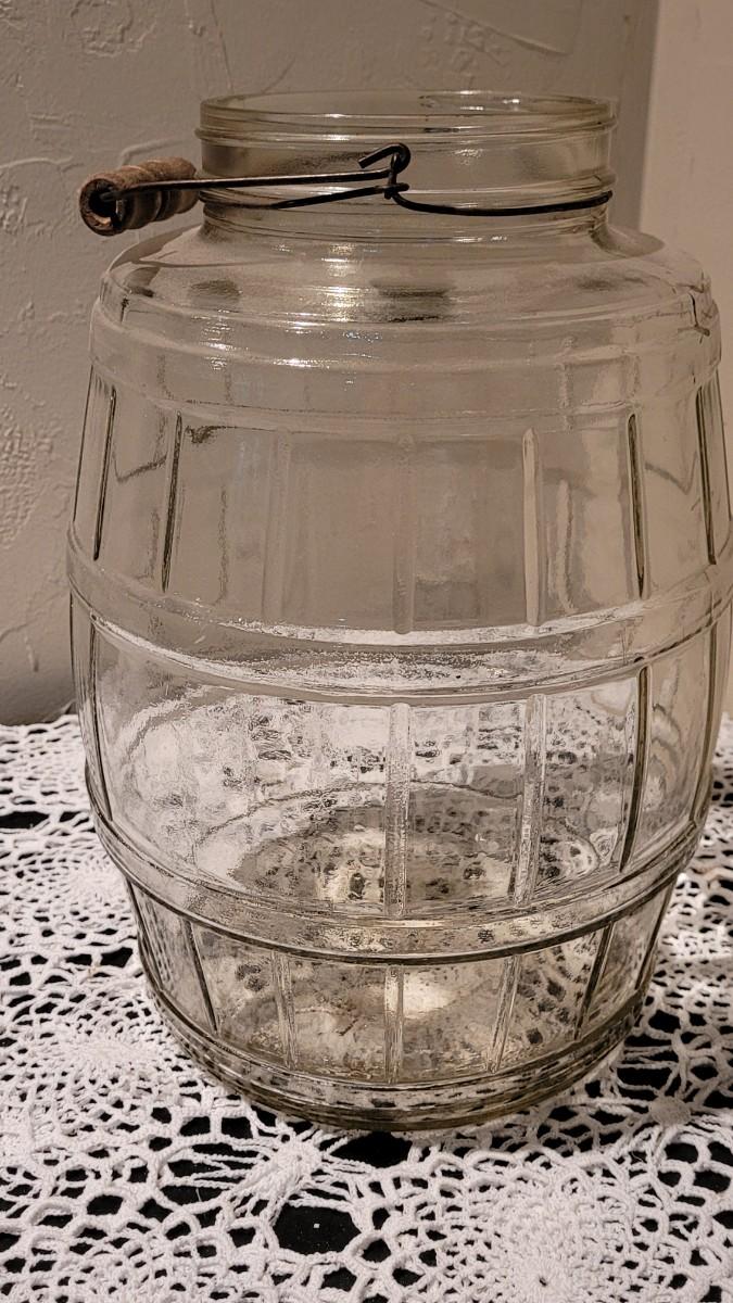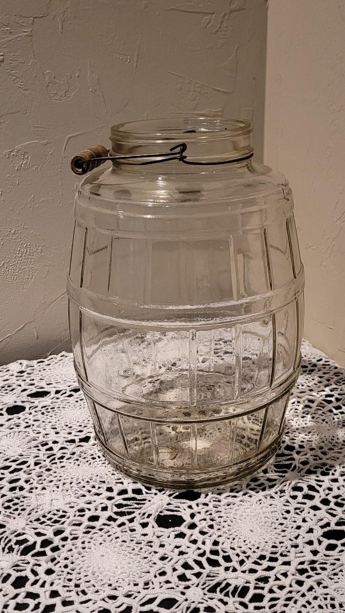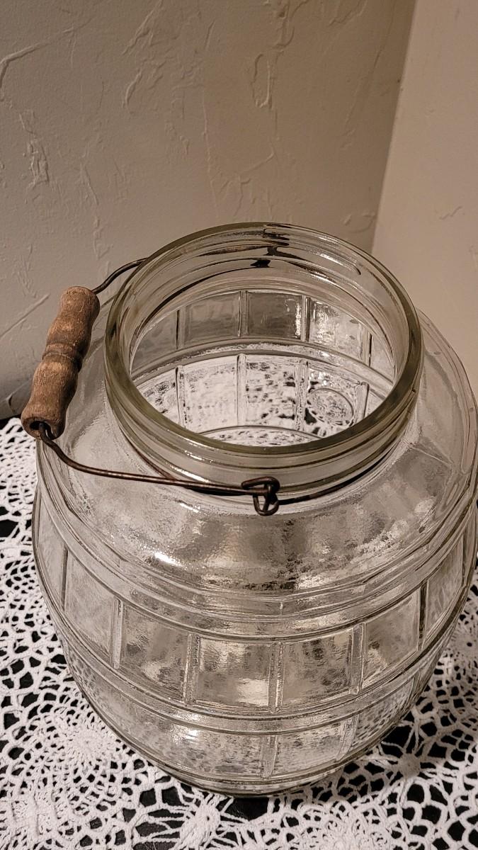 Lot 333: Antique Glass Pickle Barrel Jar with Wood Handle