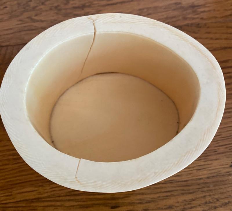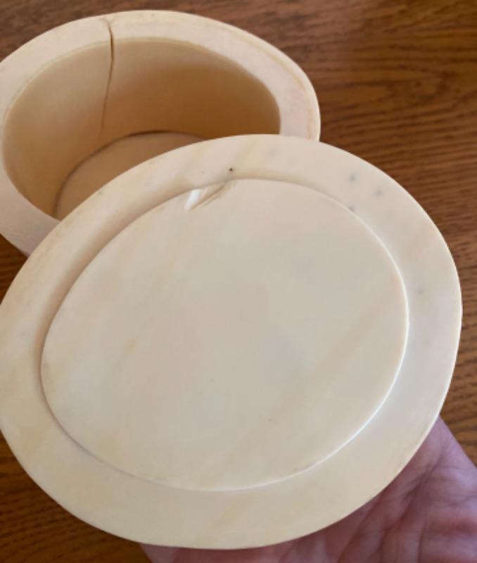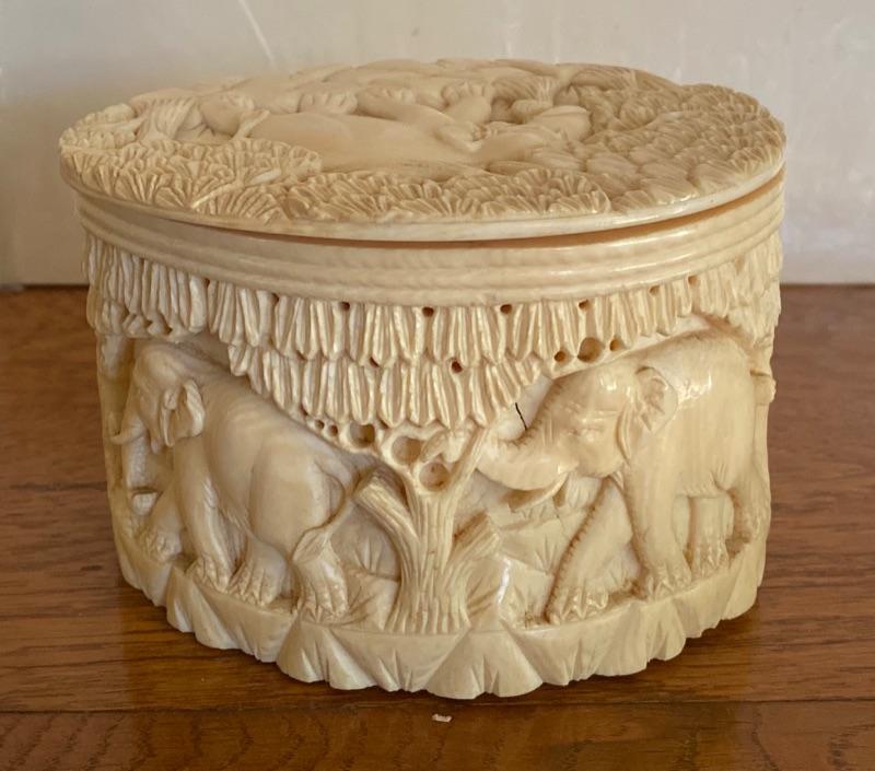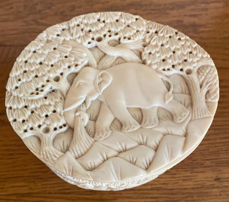 Carved bone elephant box measures 5” long 4” wide and 3-1/2” deep
