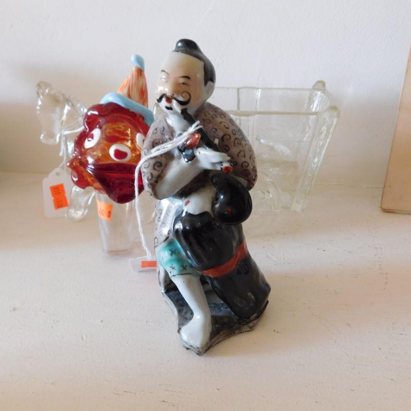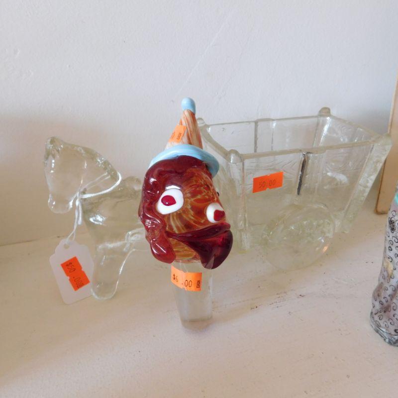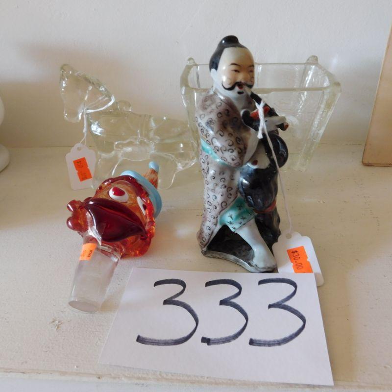 Lot 333 Chinese figurine glass clown bottle topper and glass horse with wagon