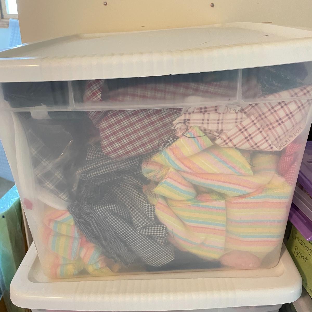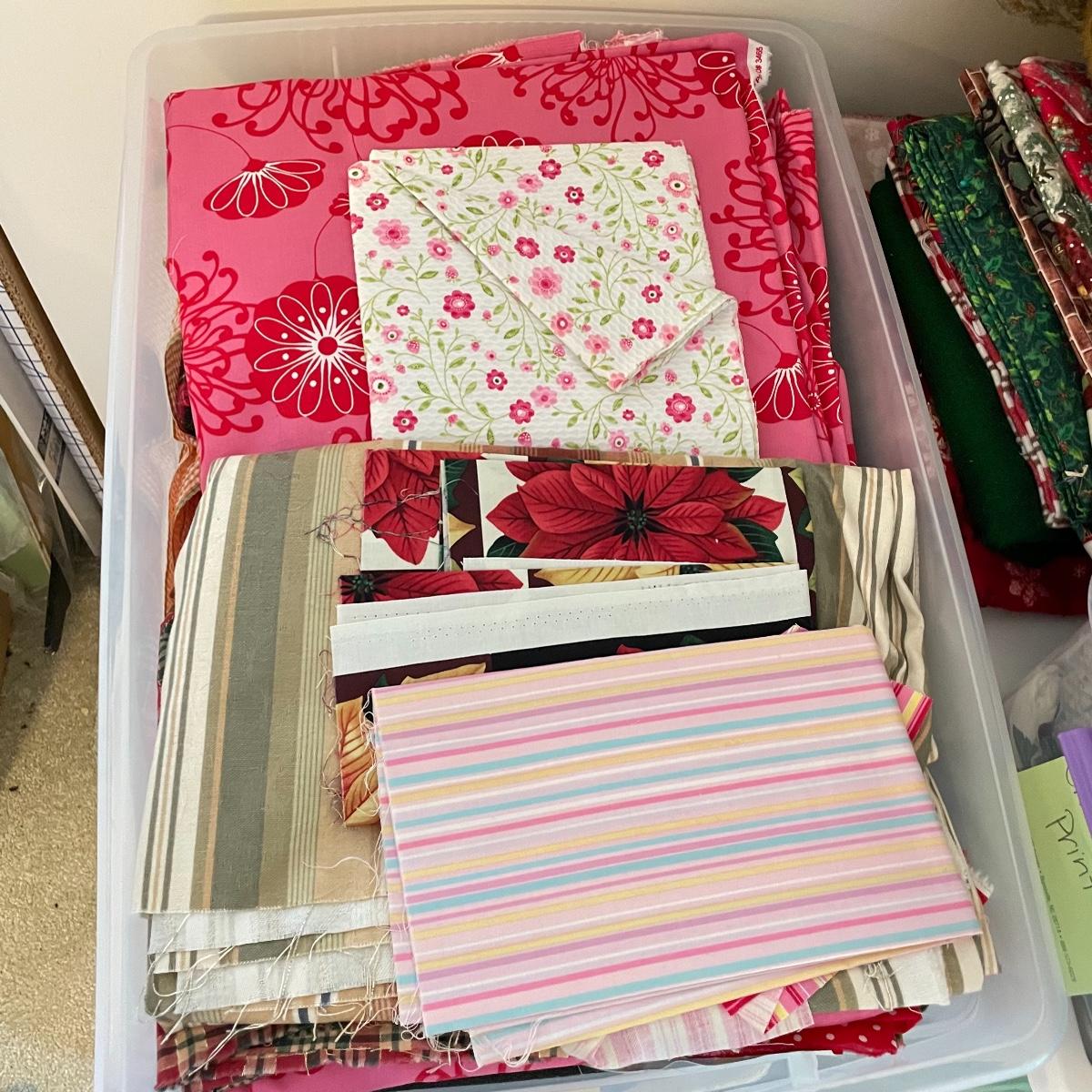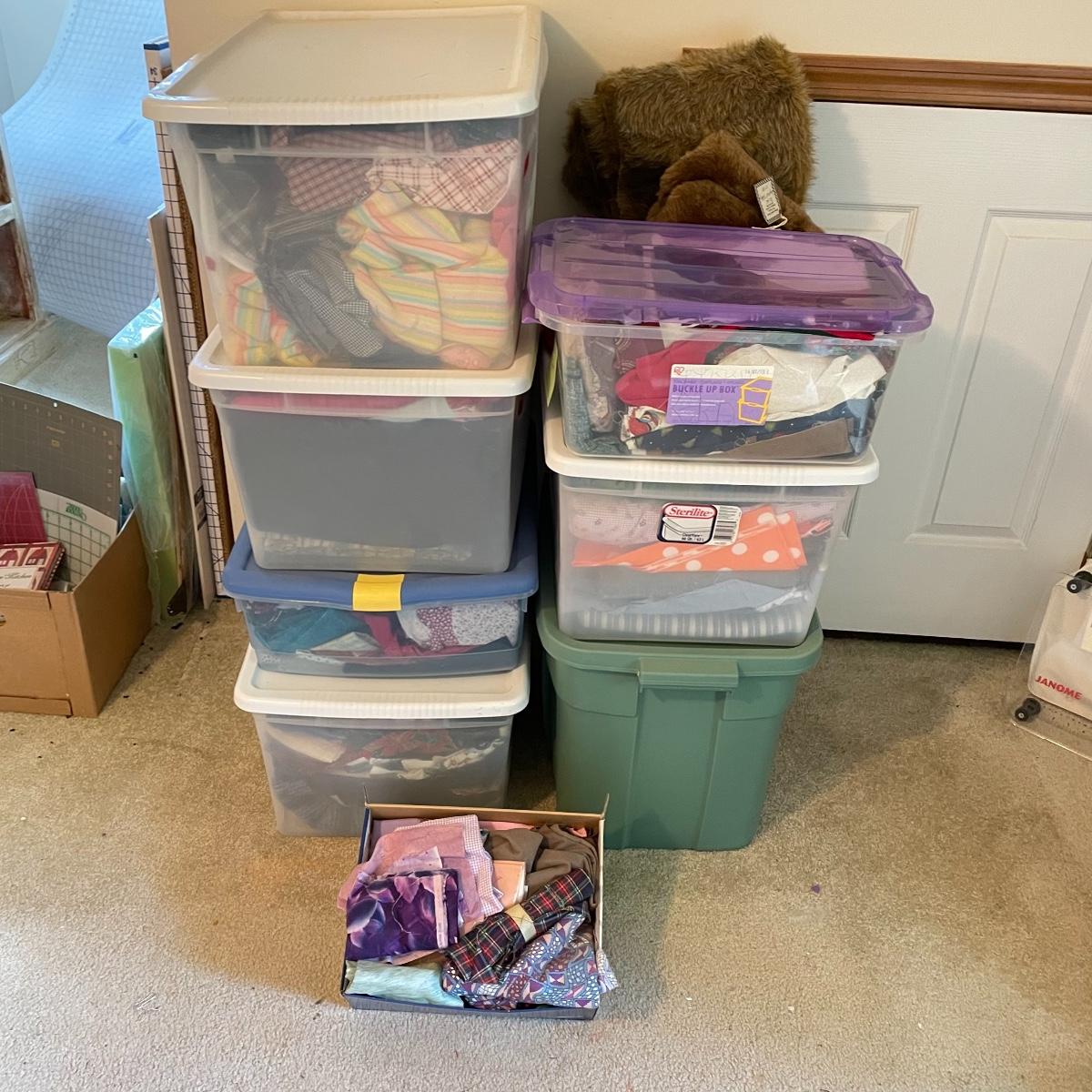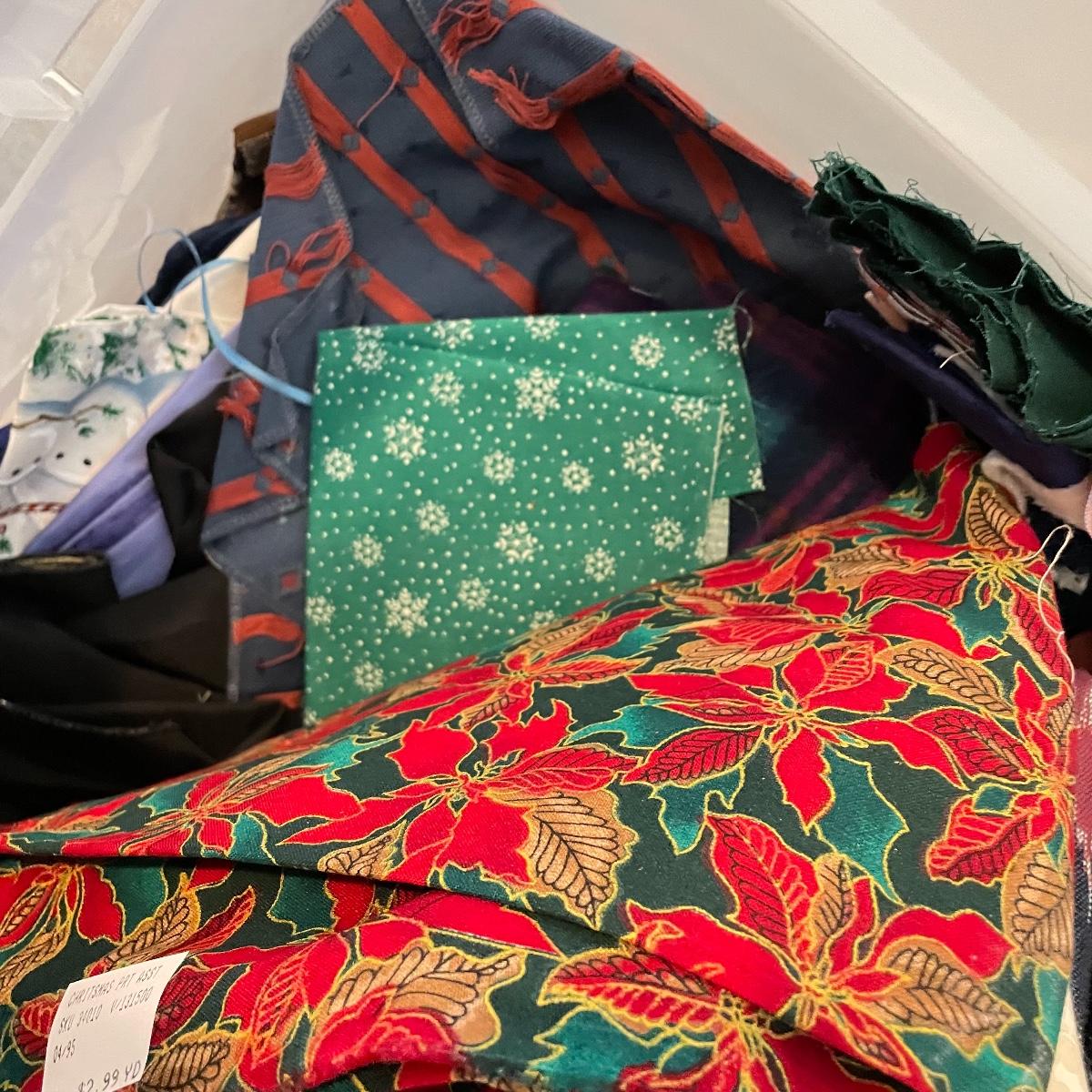 Four 63 L Sterilite bins plus Rubbermaid 68 L and more smaller bins full of fabric! Fabric varies widely with holiday prints, flowers, plaids, faux furs and so much more. See images. Local pick up only.