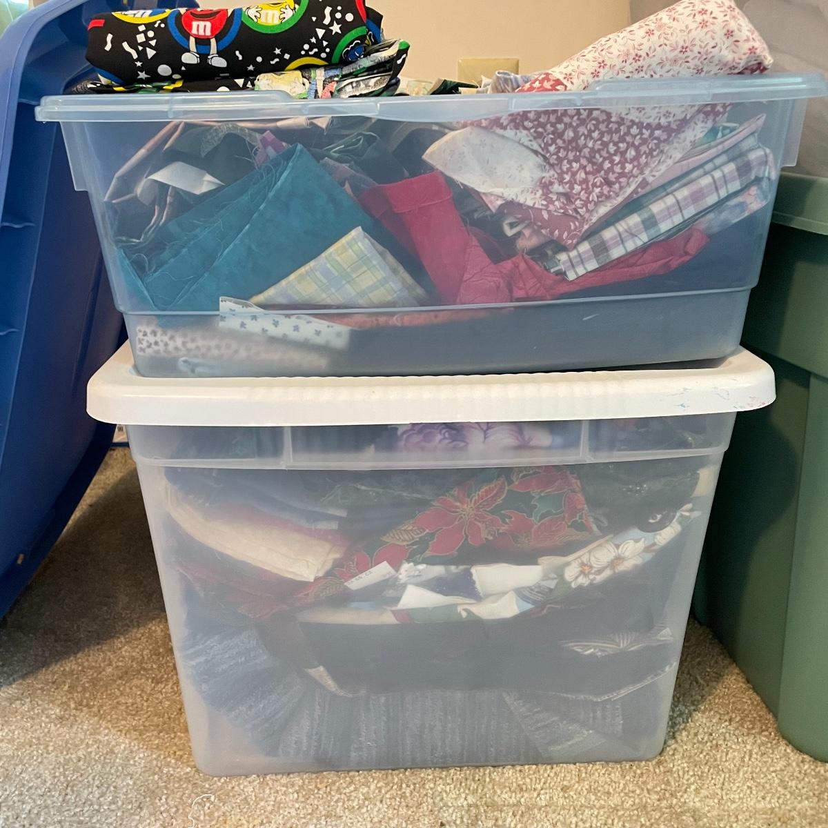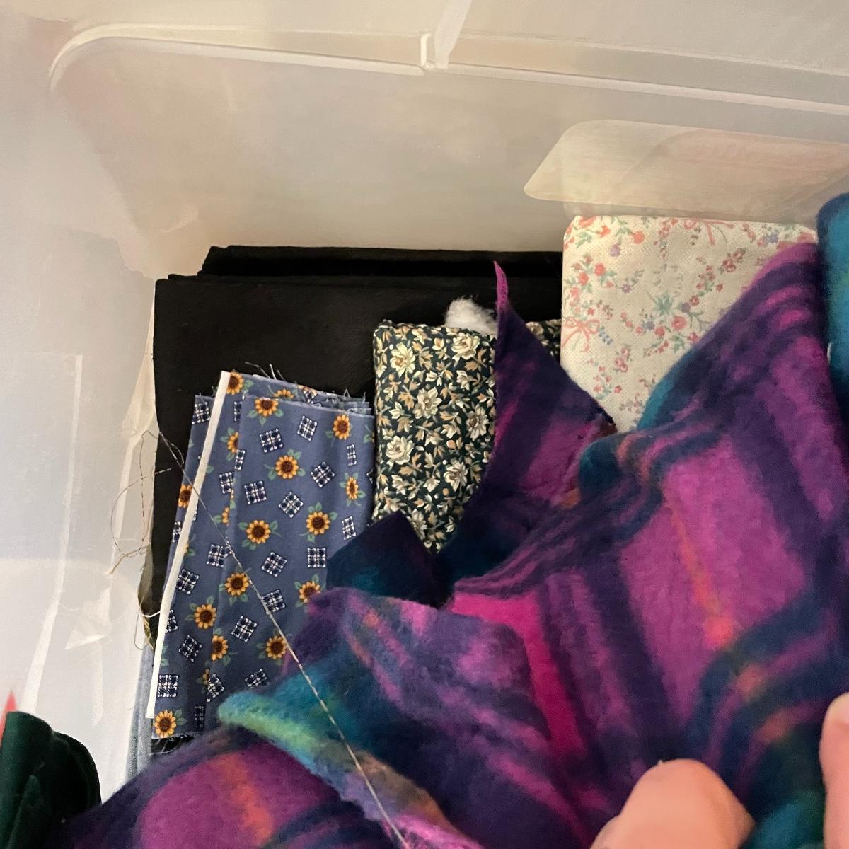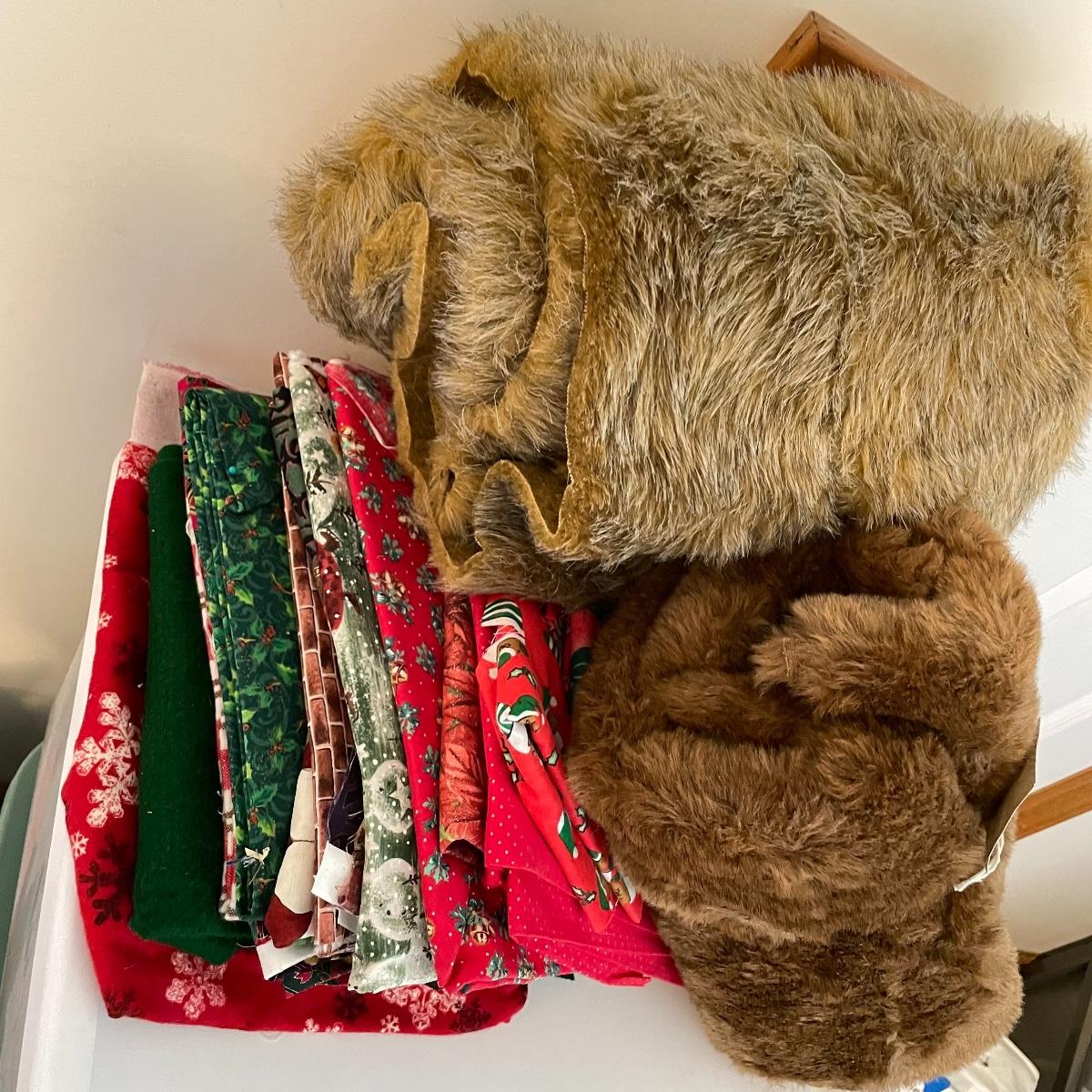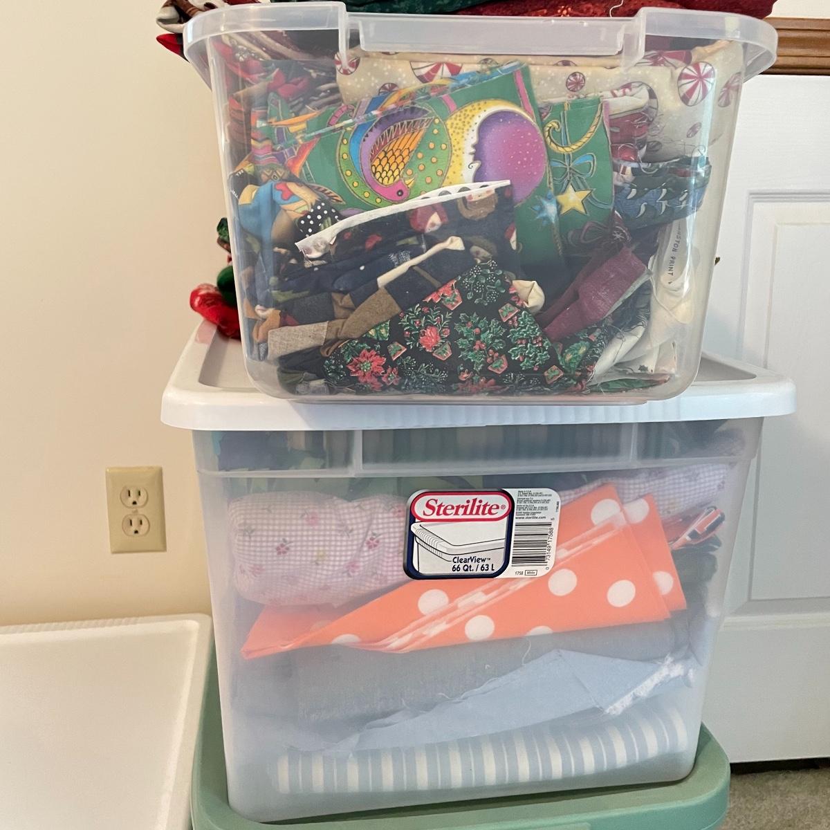 Four 63 L Sterilite bins plus Rubbermaid 68 L and more smaller bins full of fabric! Fabric varies widely with holiday prints, flowers, plaids, faux furs and so much more. See images. Local pick up only.