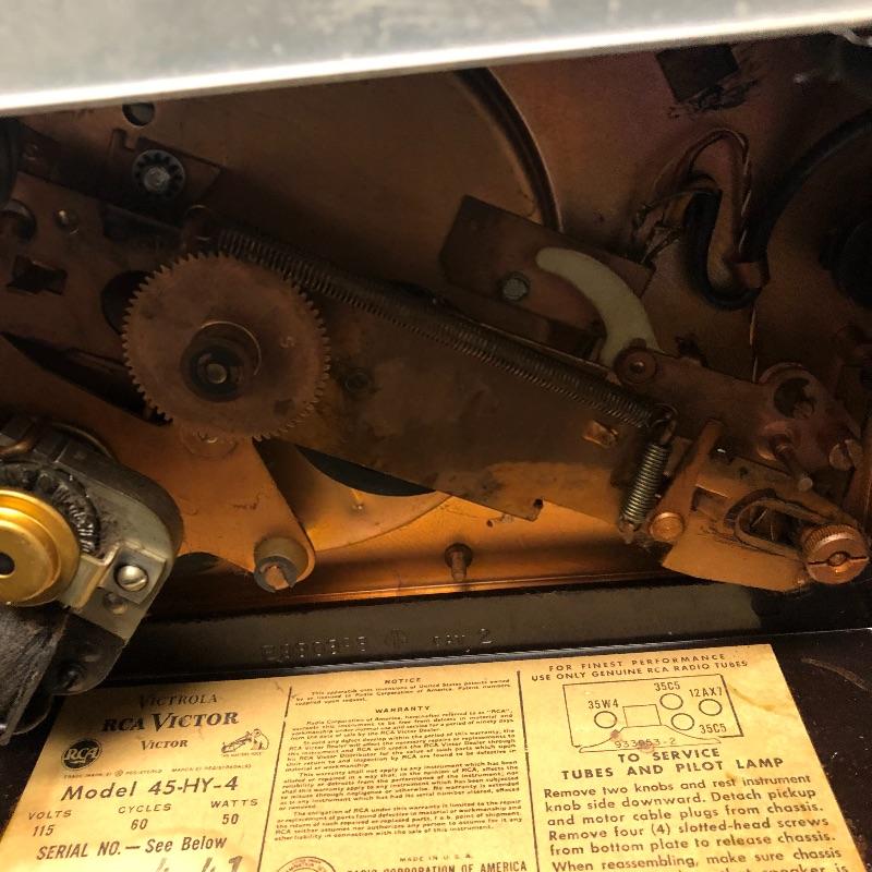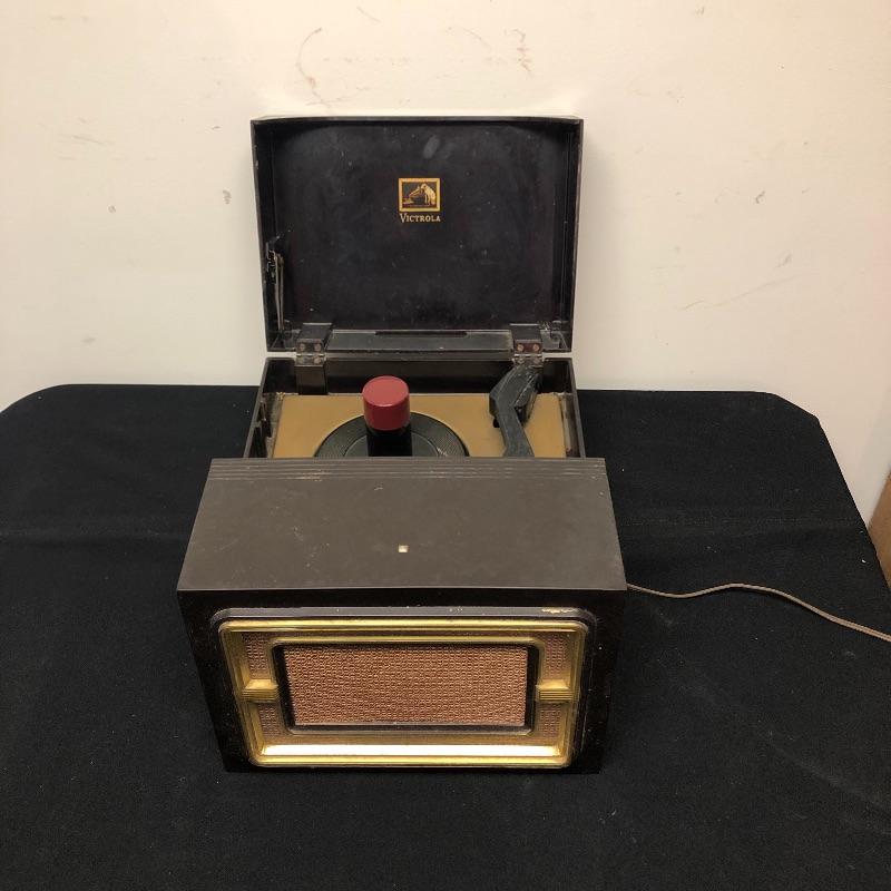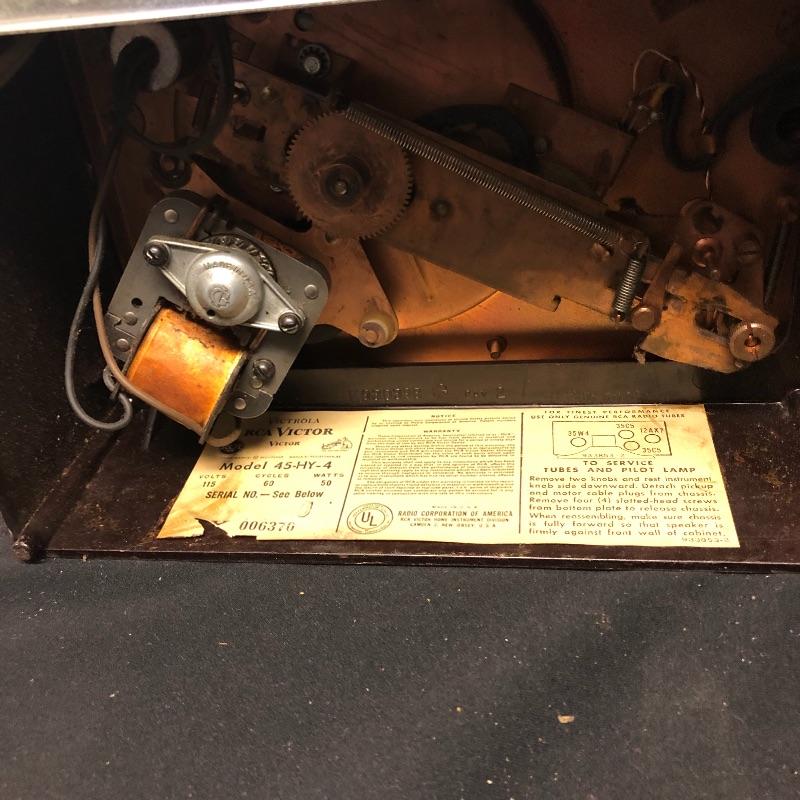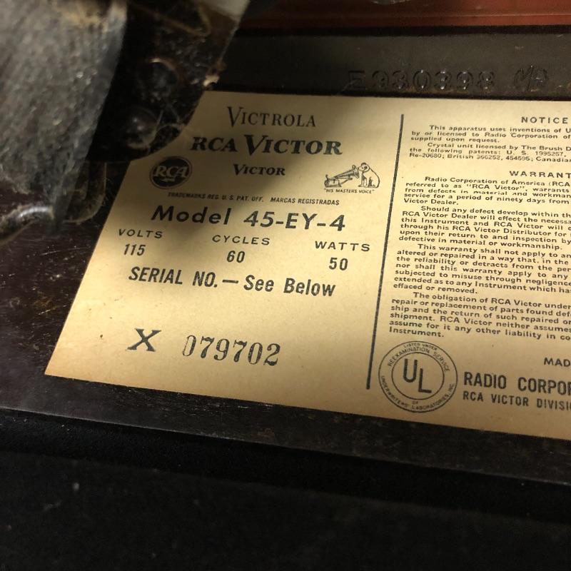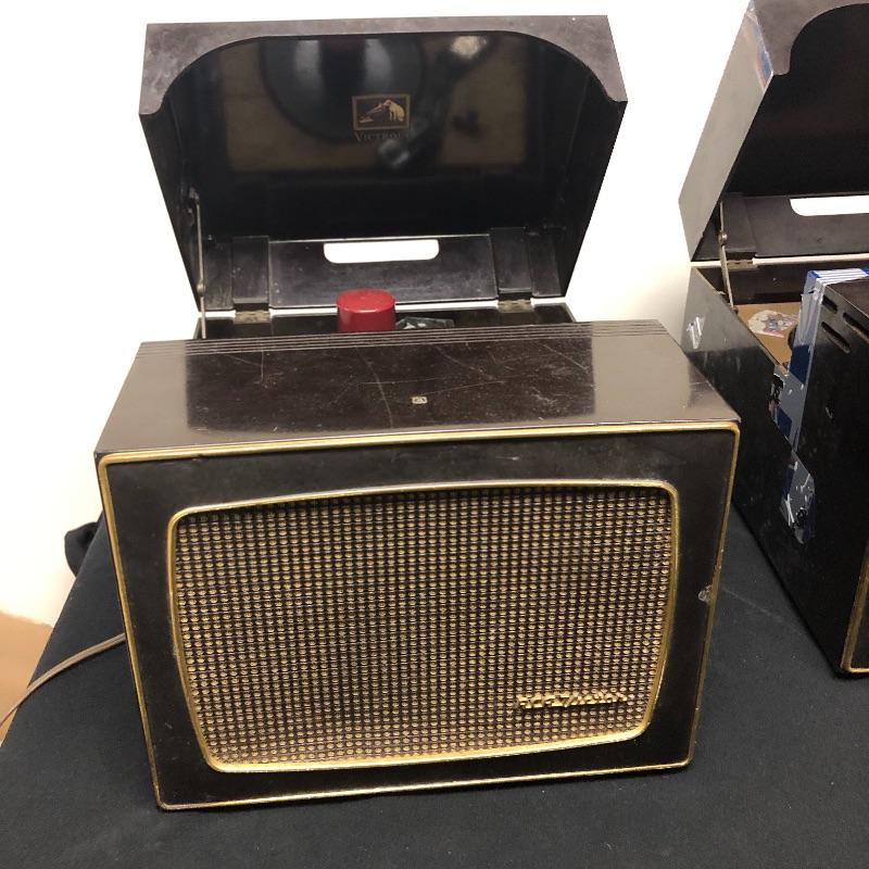 This lot includes three Victrola RCA Victor 45 record players. The model 45-EY-4 has sound when plugged in yet the turntable did not spin. The 45-HY-4 model with prior mail tape has sound when plugged in and its’ turntable did not turn. The last unit 45-HY-4 hums when plugged in and its’ turntable did not turn.