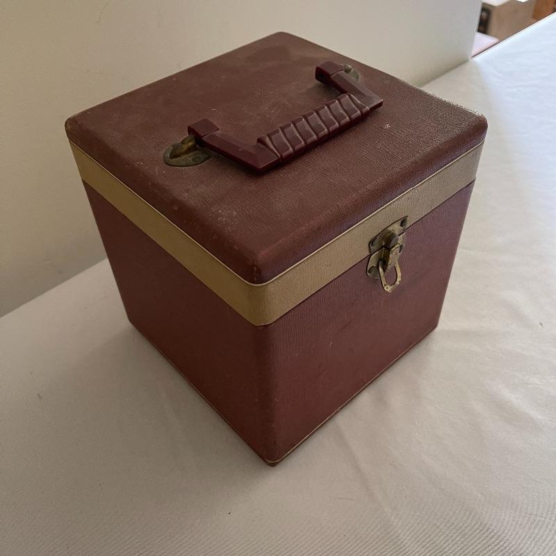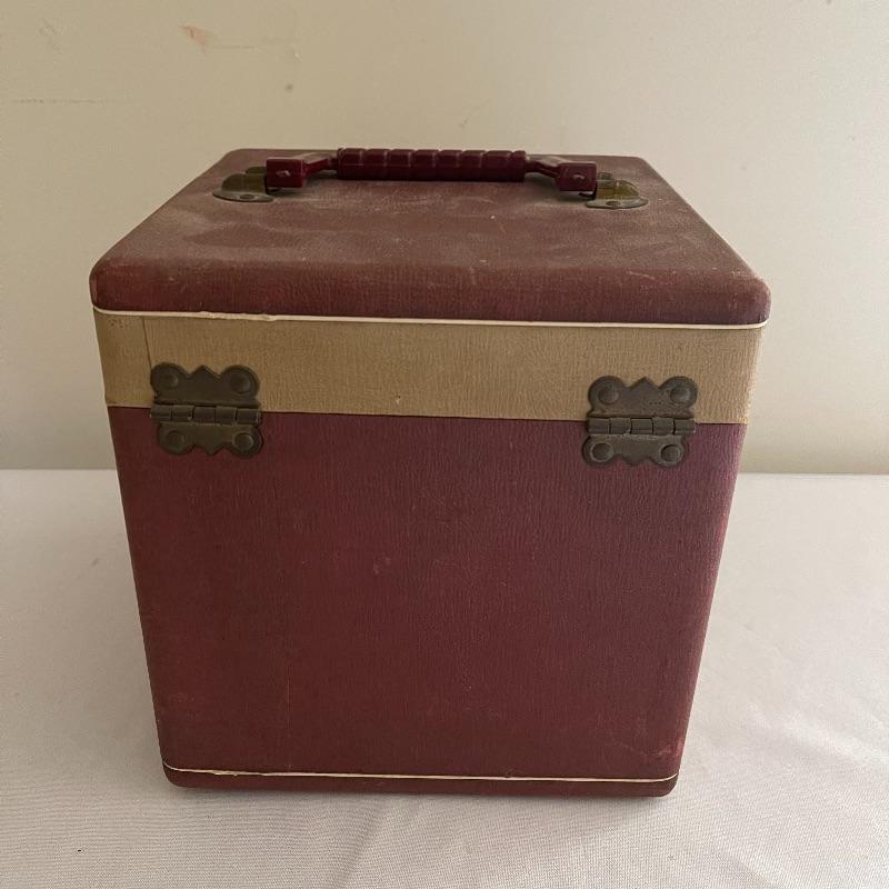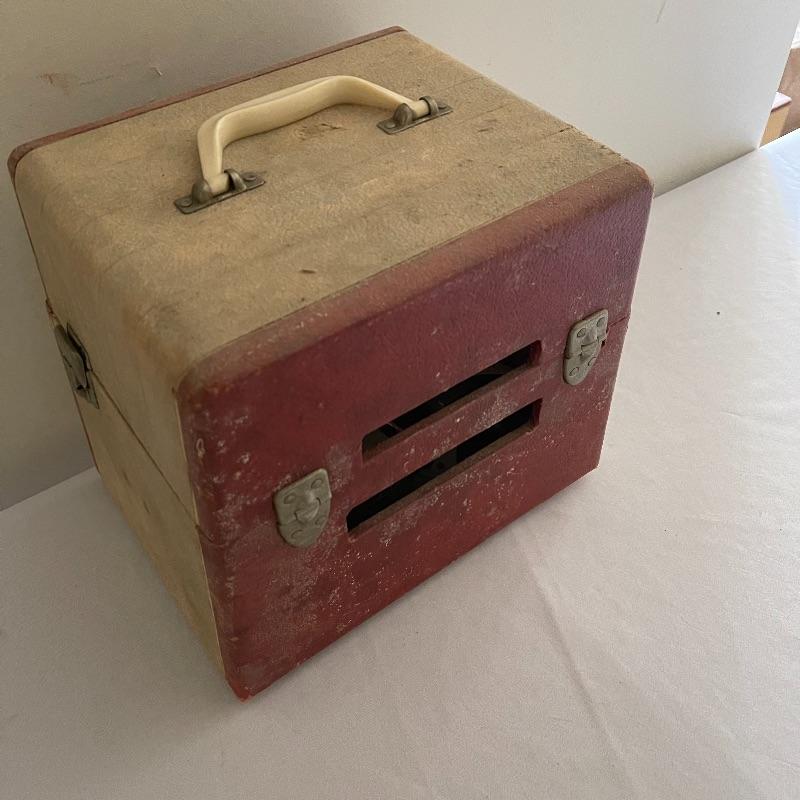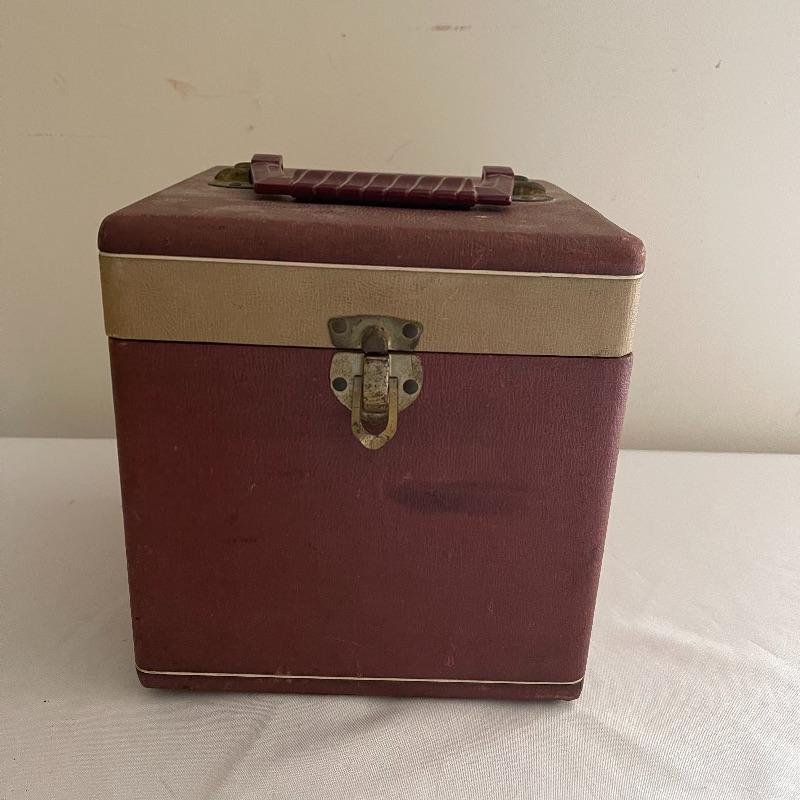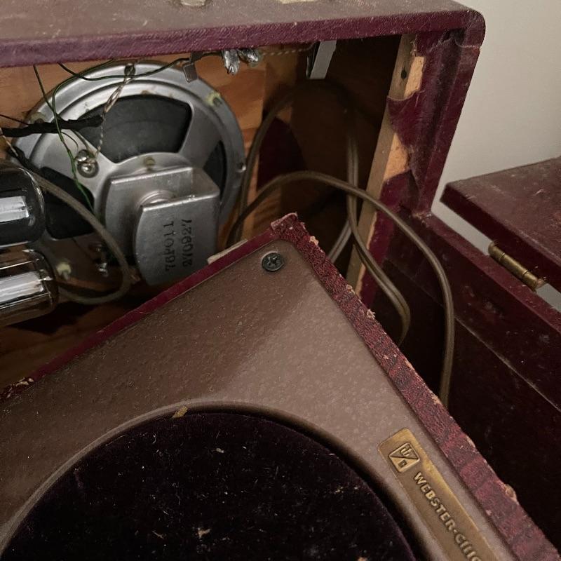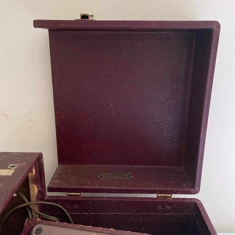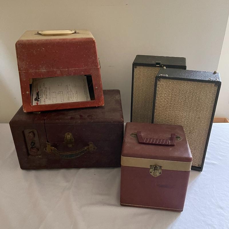 Webster Chicago 762 45 record player, record player cases, and more. There are two standing speakers and two empty cases. Two turntables are in portable cases, the clasps close and secure on both.