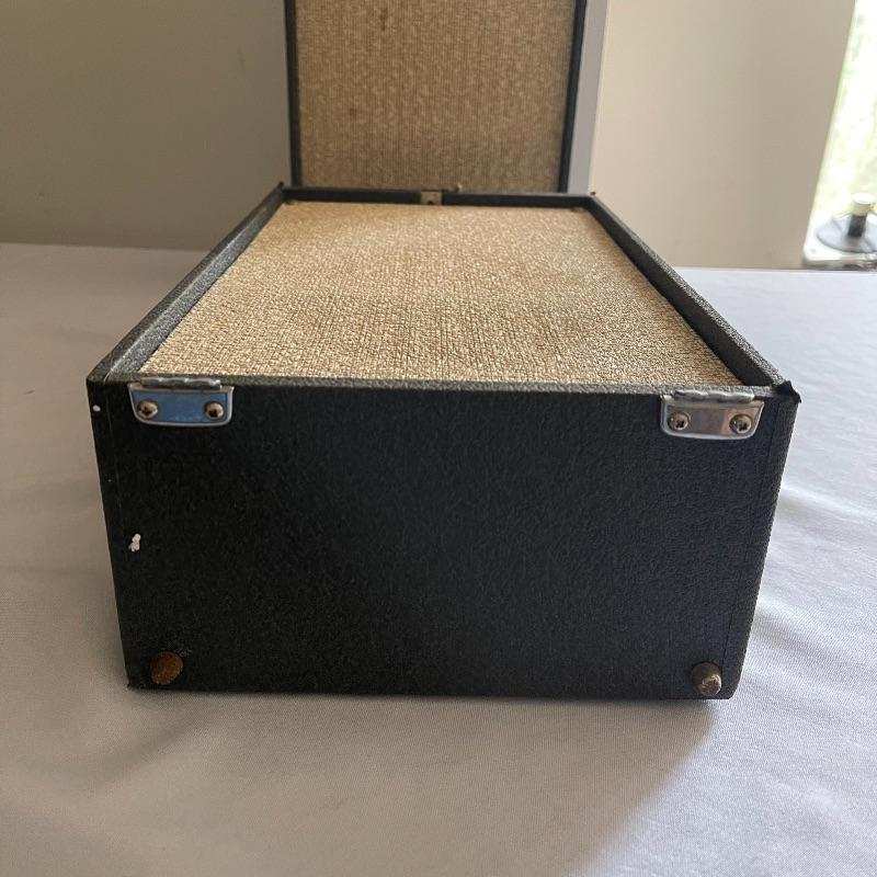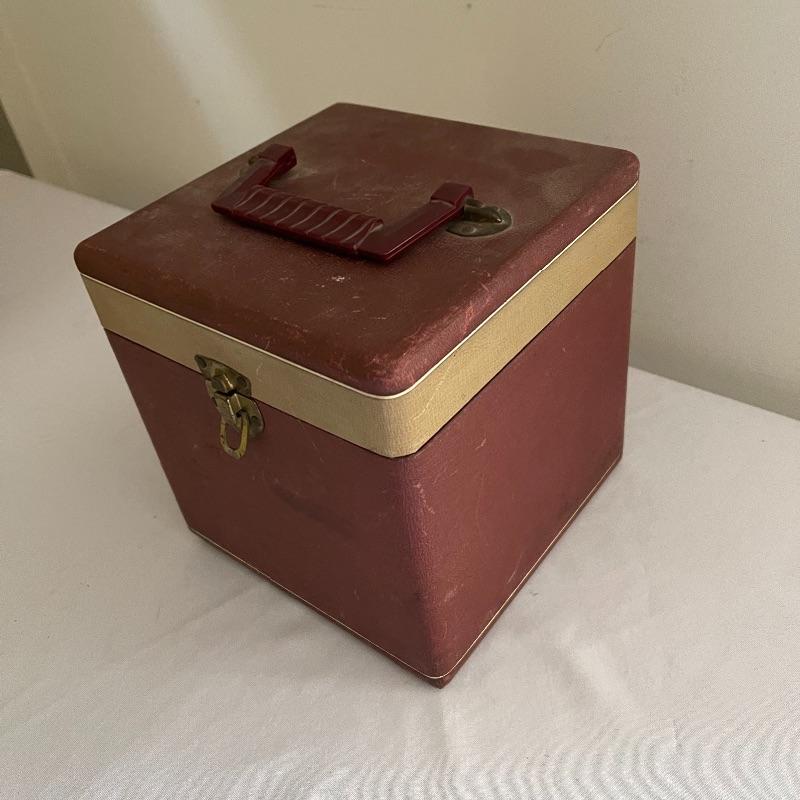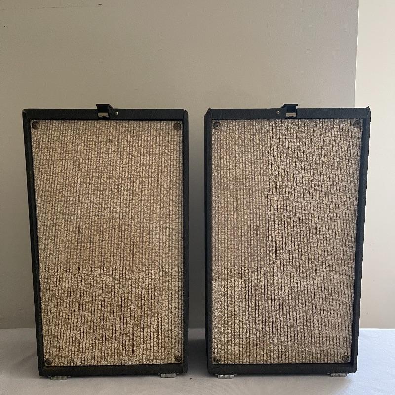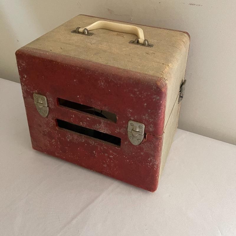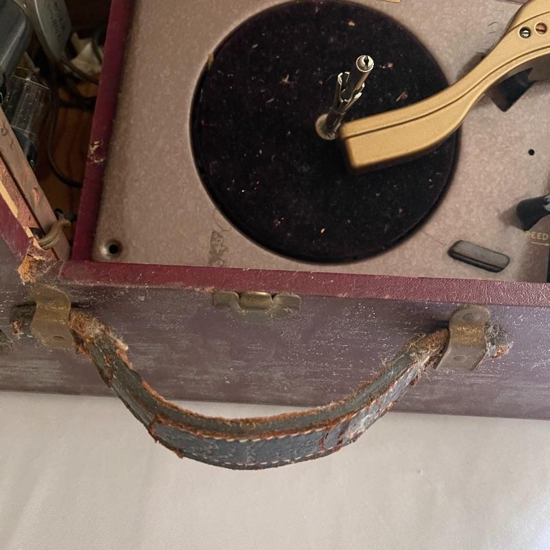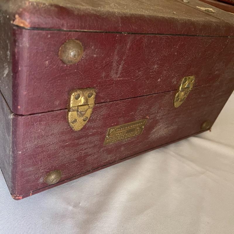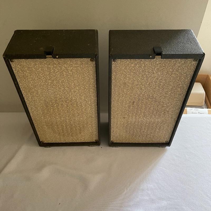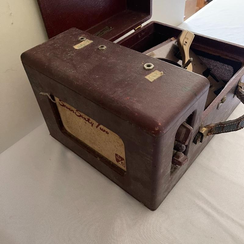 Webster Chicago 762 45 record player, record player cases, and more. There are two standing speakers and two empty cases. Two turntables are in portable cases, the clasps close and secure on both.