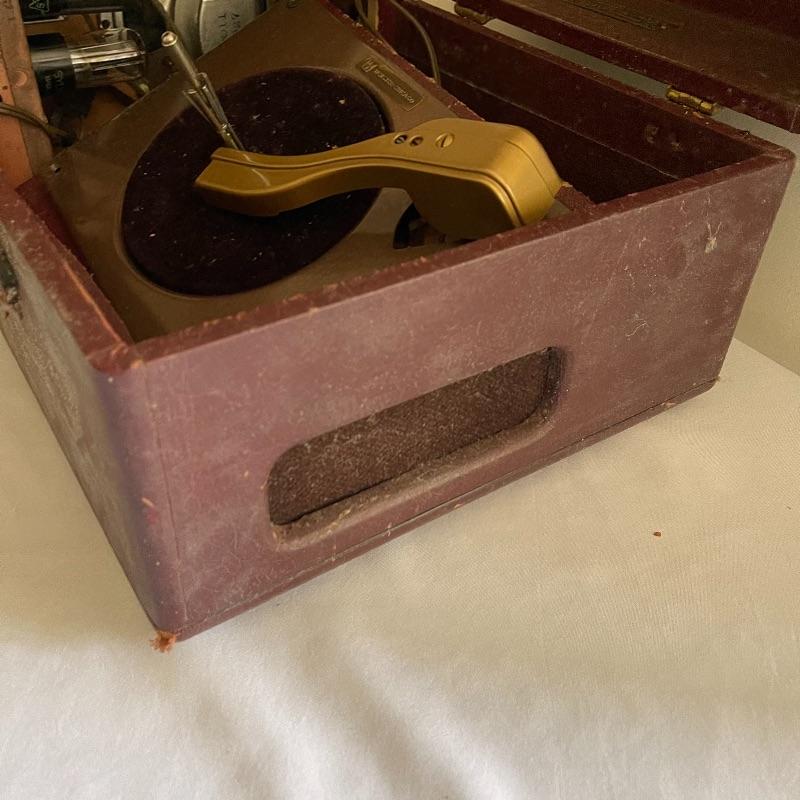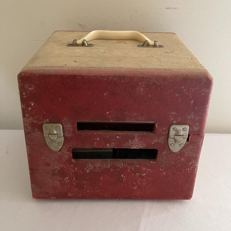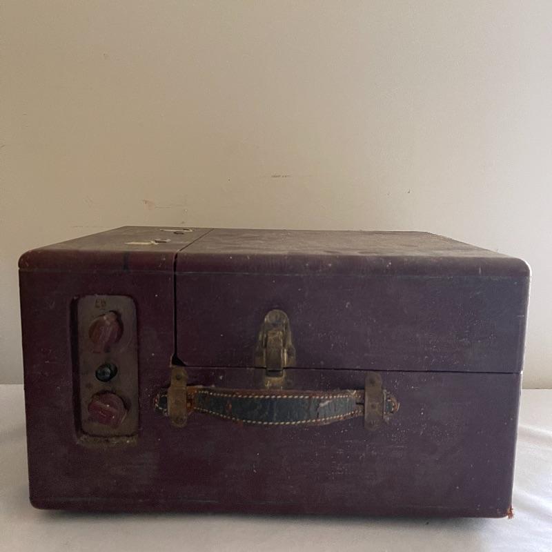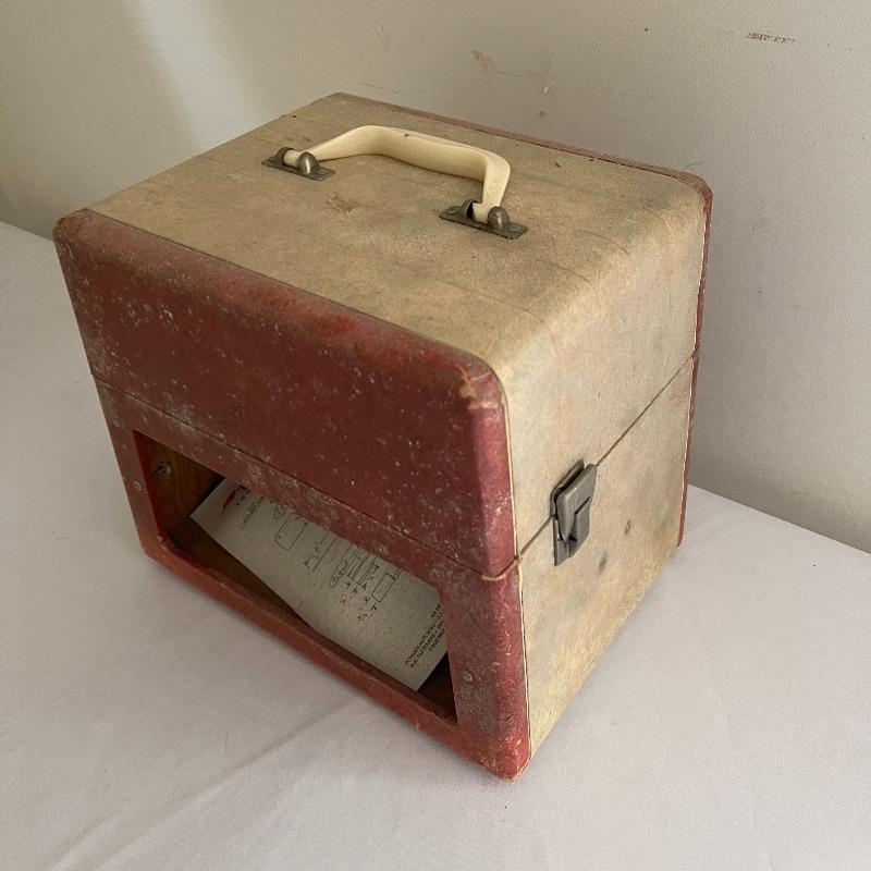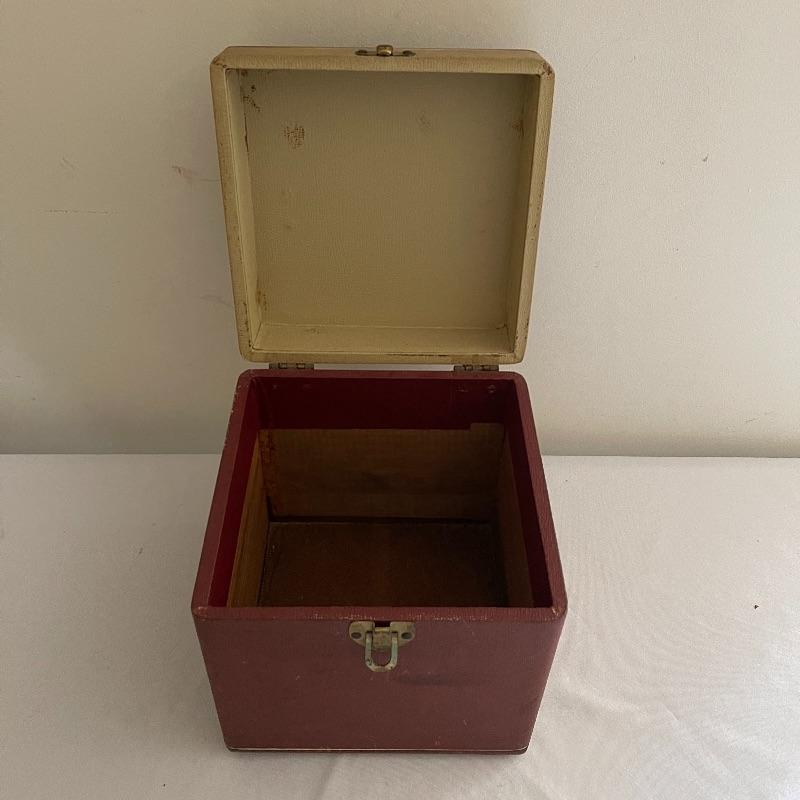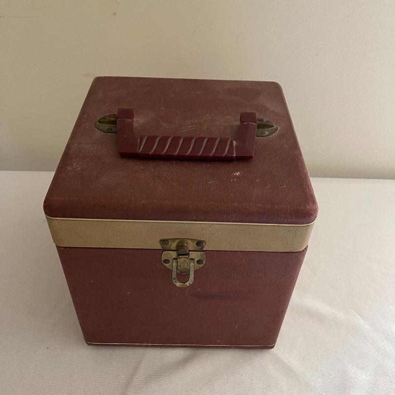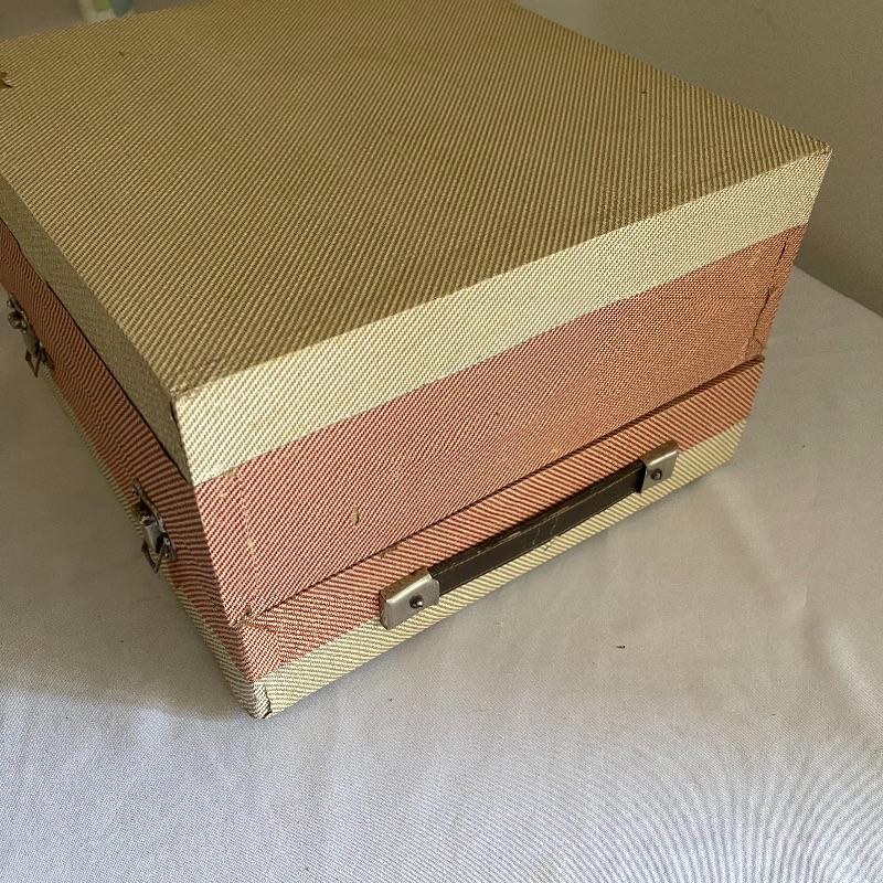Webster Chicago 762 45 record player, record player cases, and more. There are two standing speakers and two empty cases. Two turntables are in portable cases, the clasps close and secure on both.