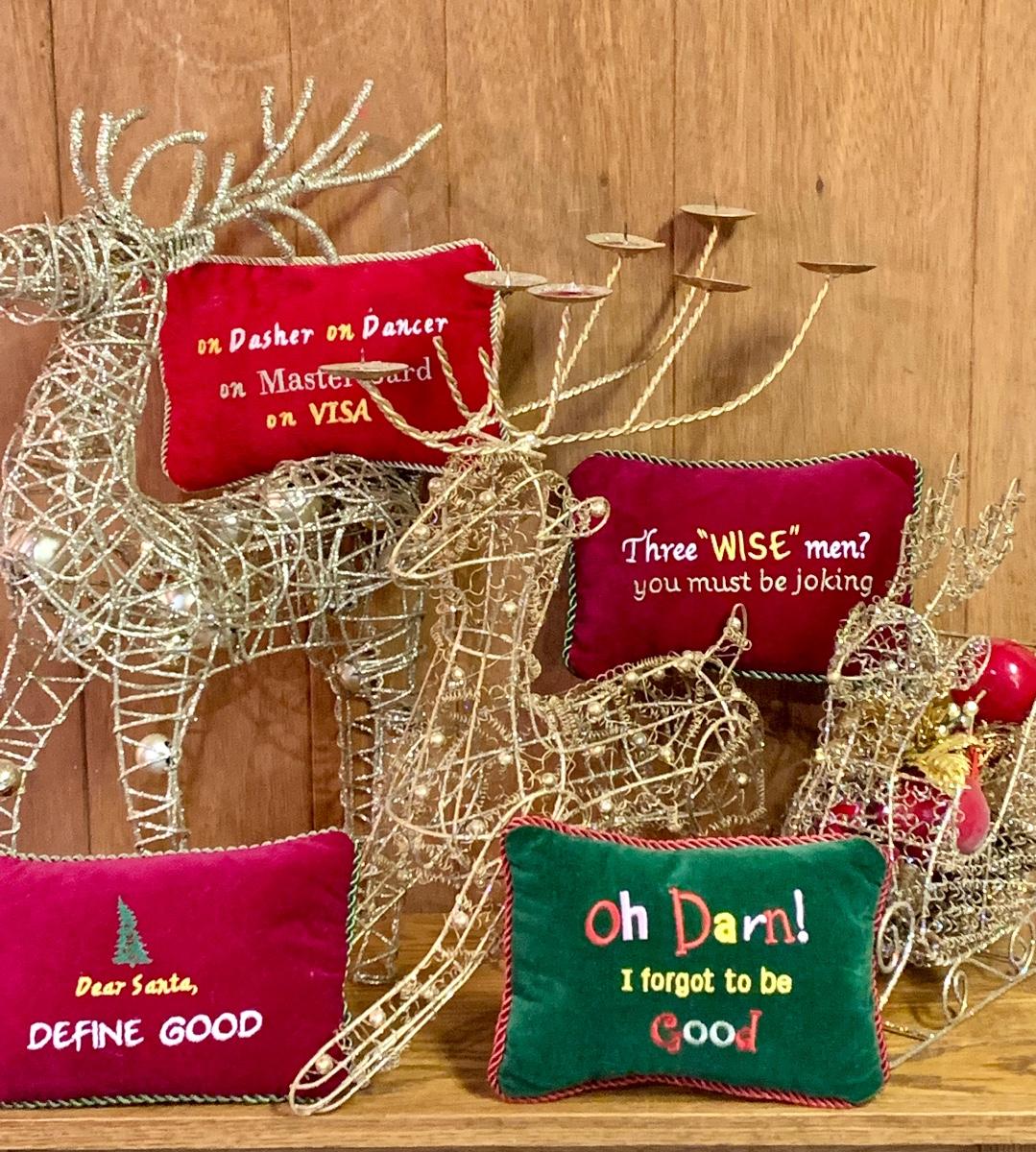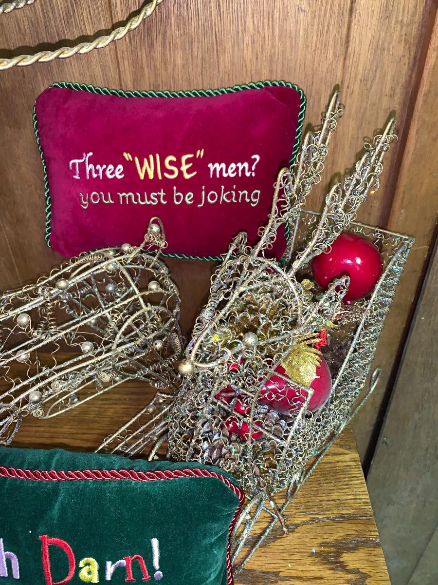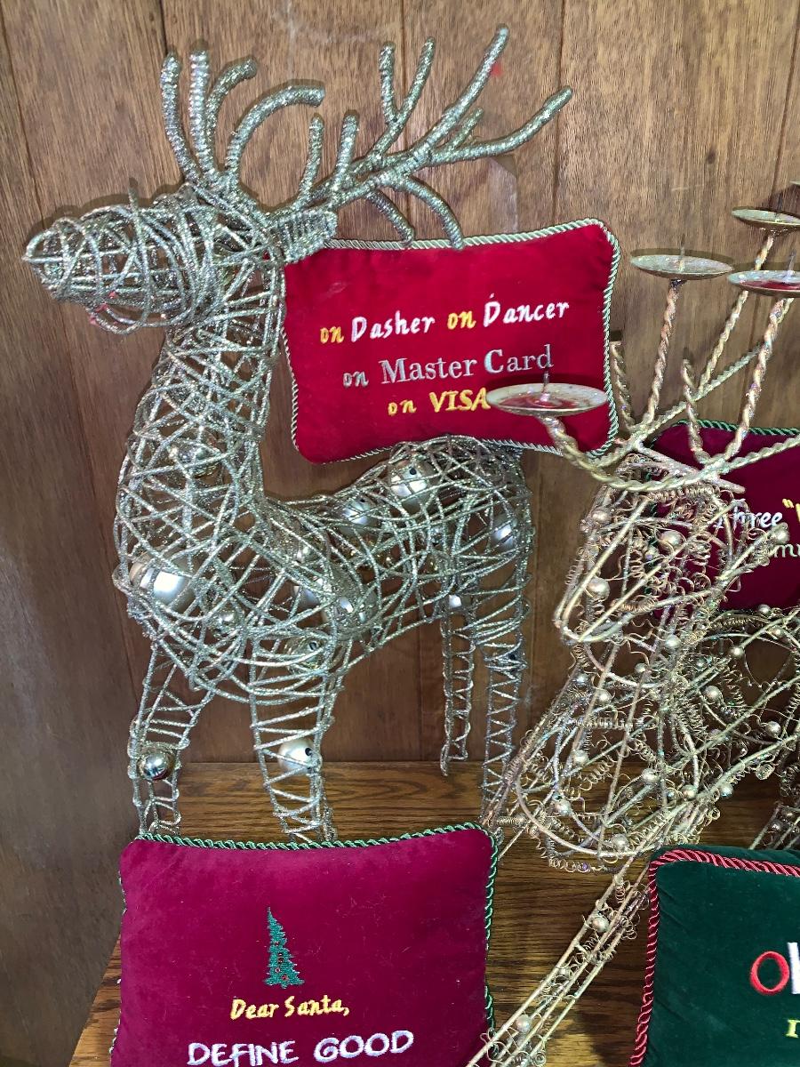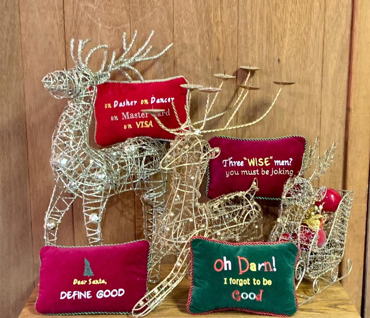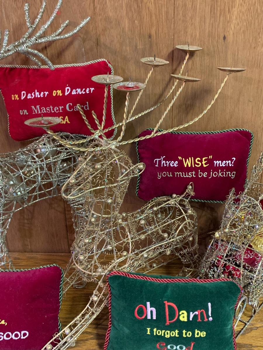 Comical saying on miniature pillows along with gold tone wire reindeer candleholder, basket and standing. Could be made any decor color.