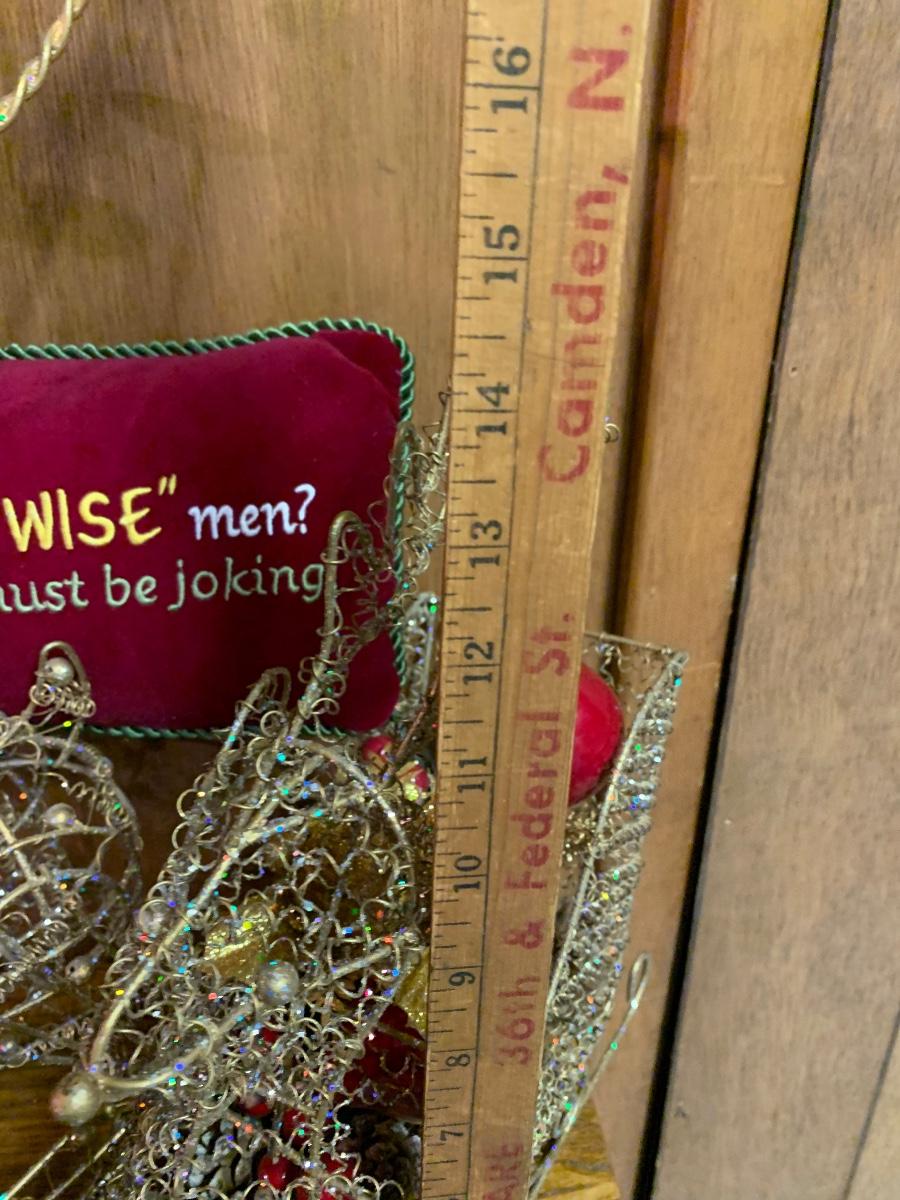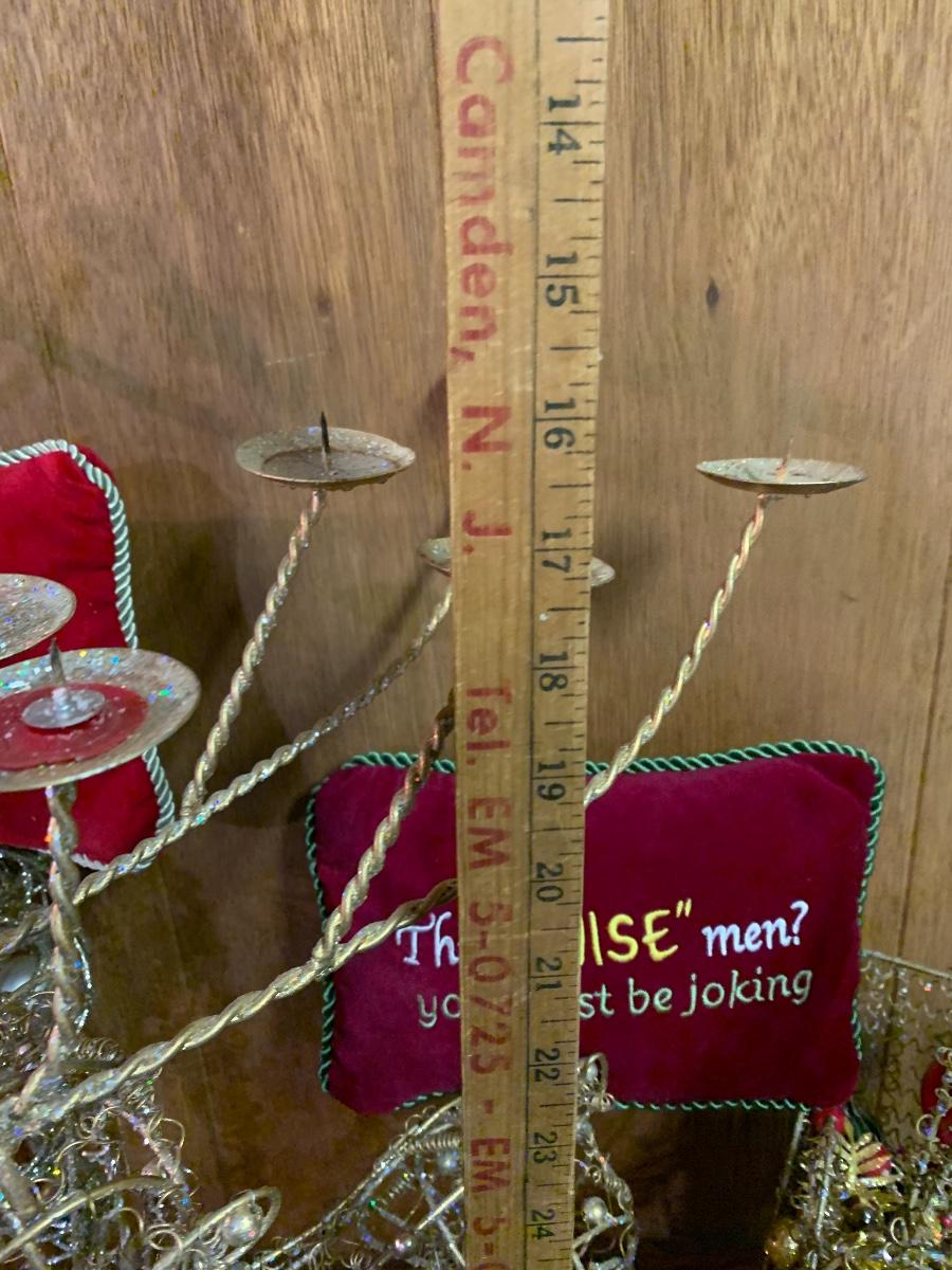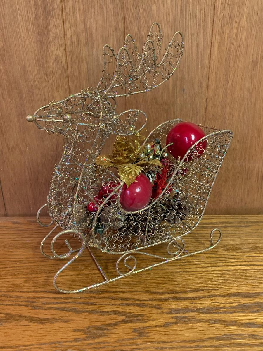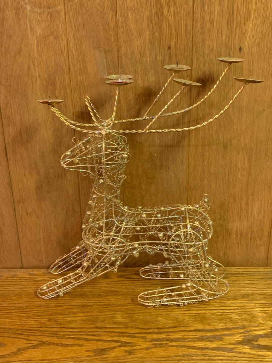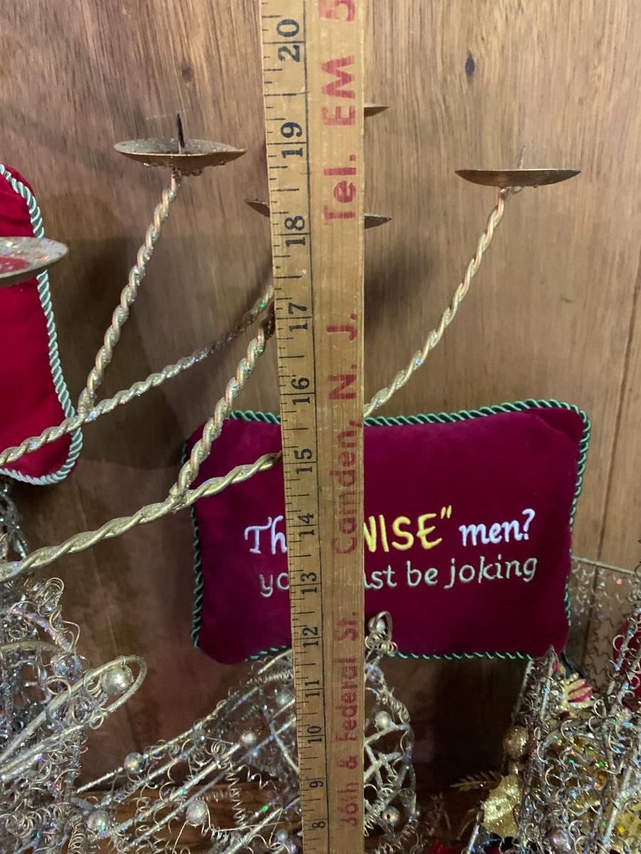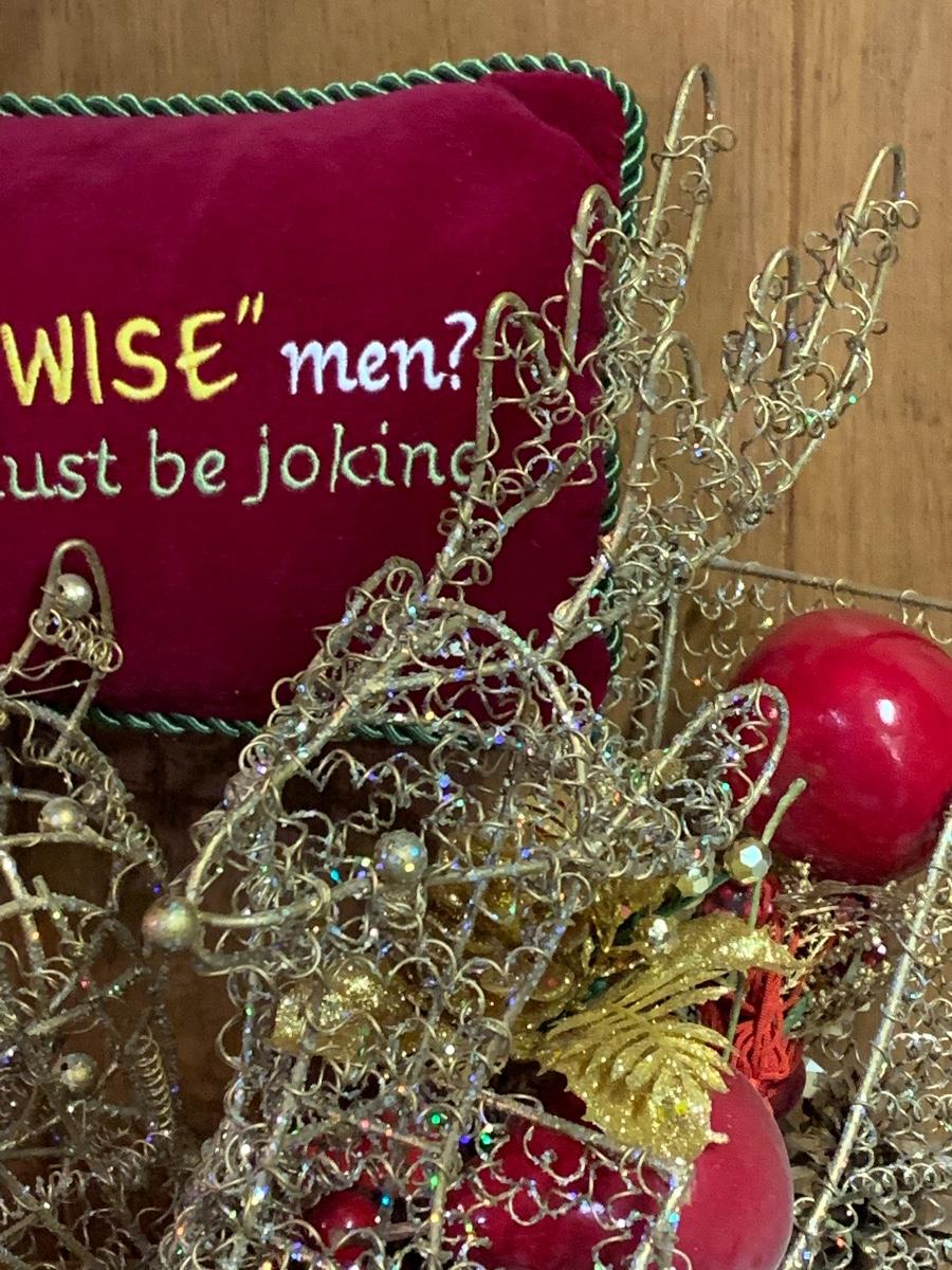 Comical saying on miniature pillows along with gold tone wire reindeer candleholder, basket and standing. Could be made any decor color.