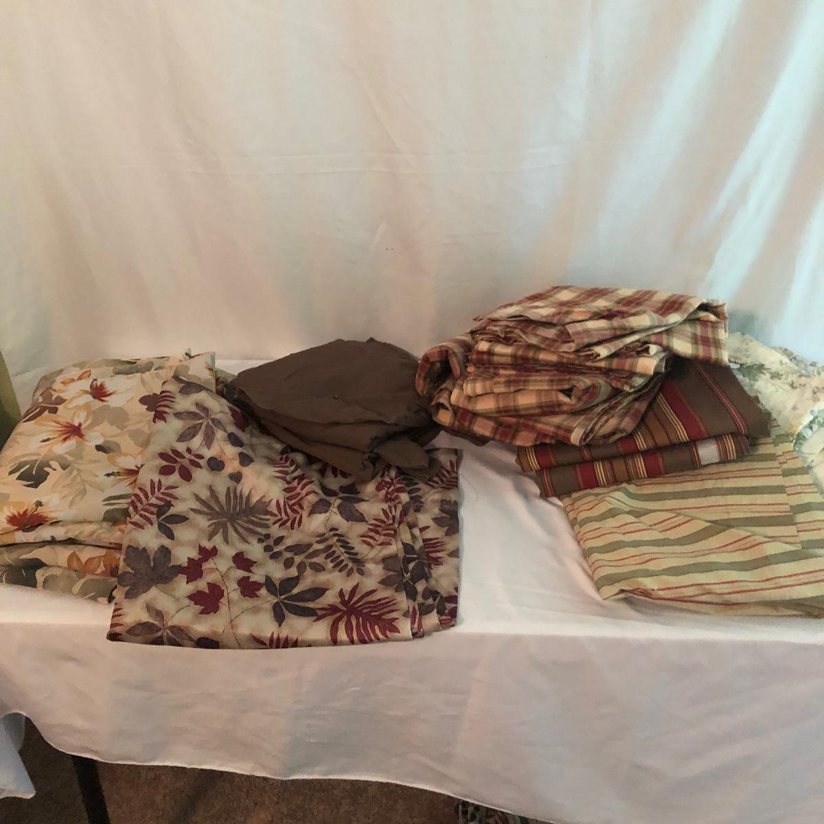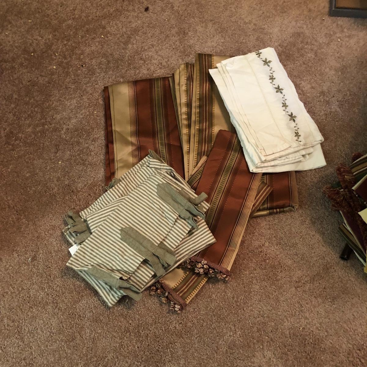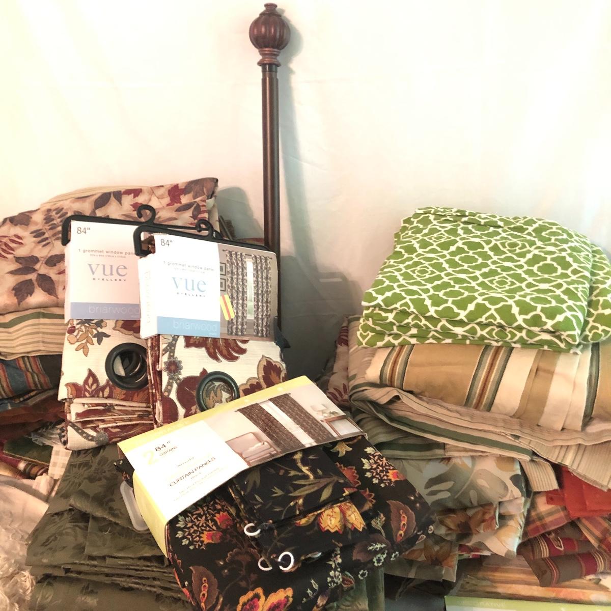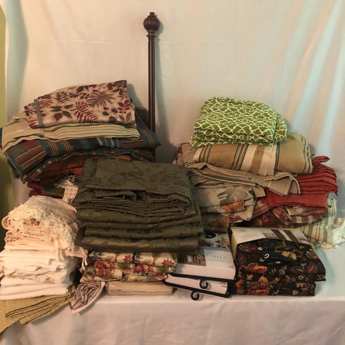 There are plenty of options for you in this lot that contains literally well over 40 Curtains, 1 adjustable aged Bronze colored curtain rod and a handful of valances. A good amount of these curtains are still in their packaging. Tab top and rod drapes make up the majority of them. The set of six green damask curtains each measure 42” x 50” and are designed to have a rod inserted.