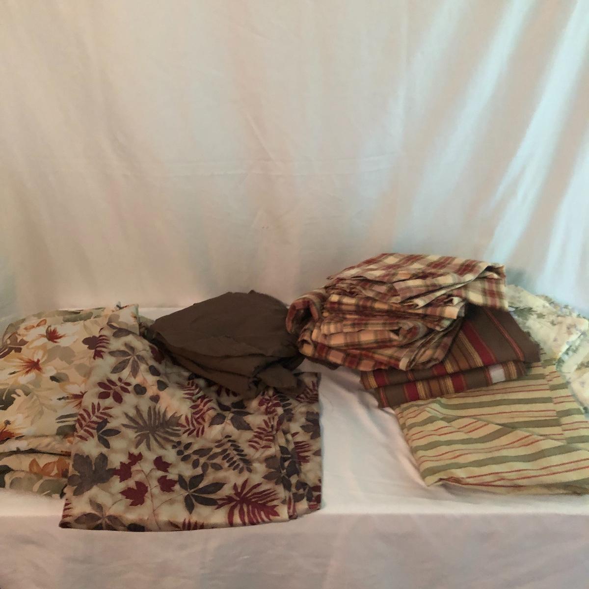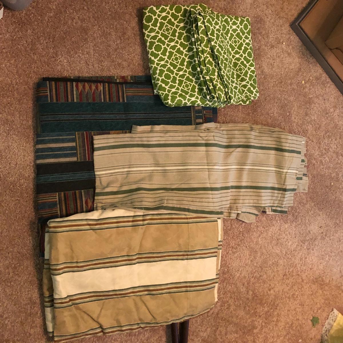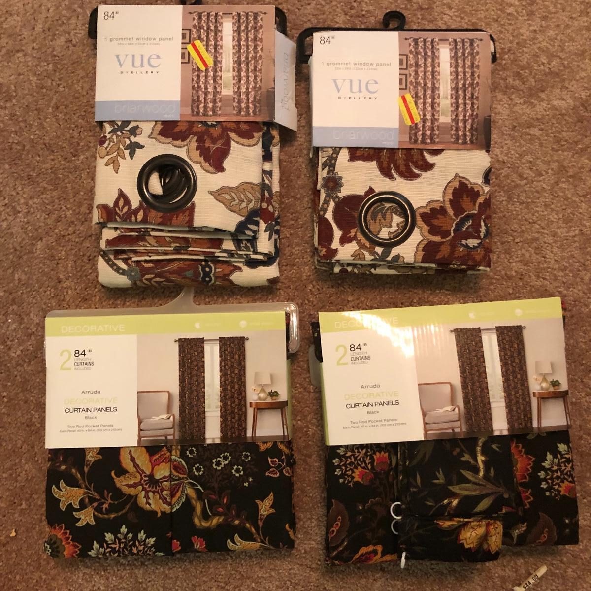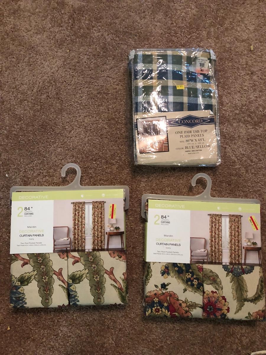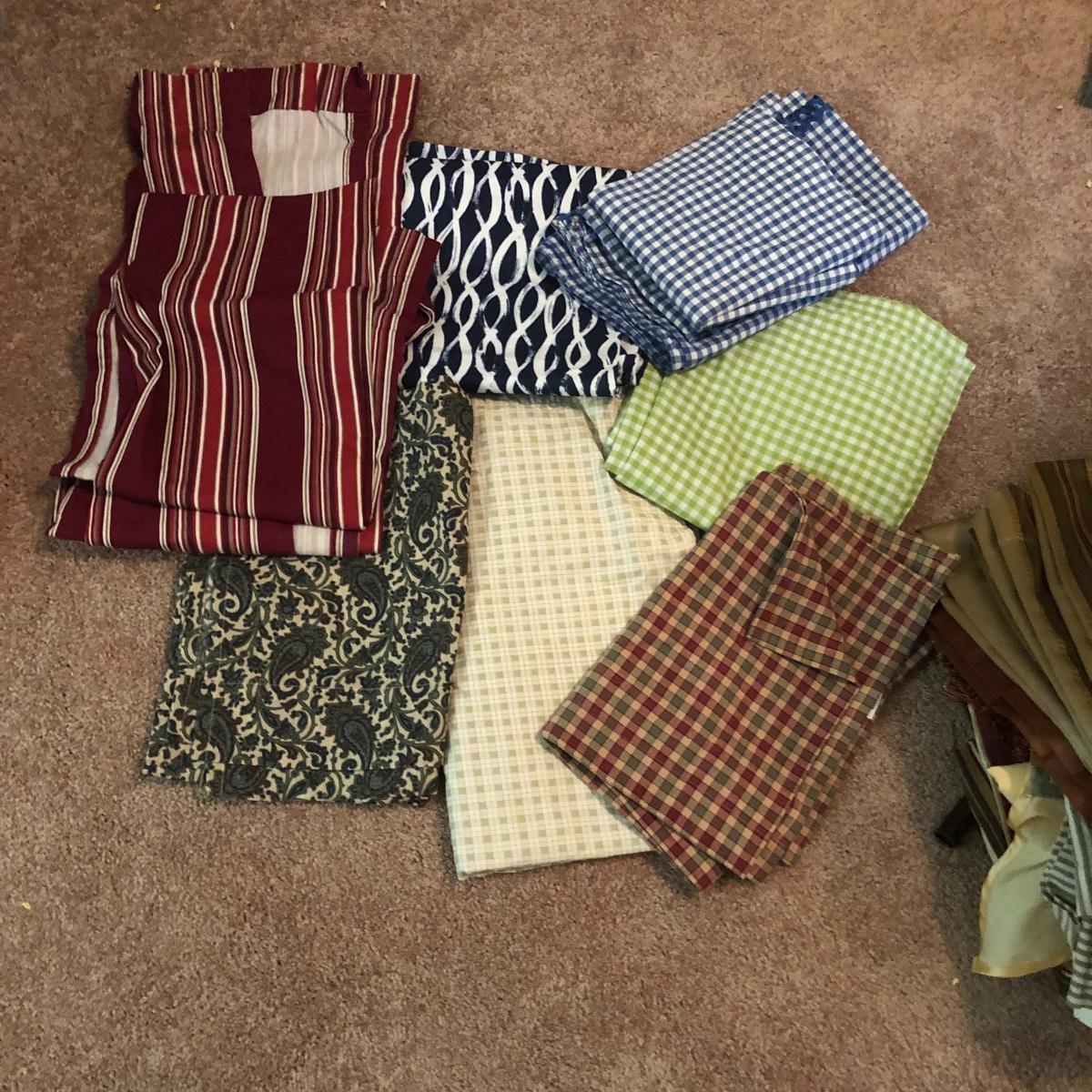 There are plenty of options for you in this lot that contains literally well over 40 Curtains, 1 adjustable aged Bronze colored curtain rod and a handful of valances. A good amount of these curtains are still in their packaging. Tab top and rod drapes make up the majority of them. The set of six green damask curtains each measure 42” x 50” and are designed to have a rod inserted.