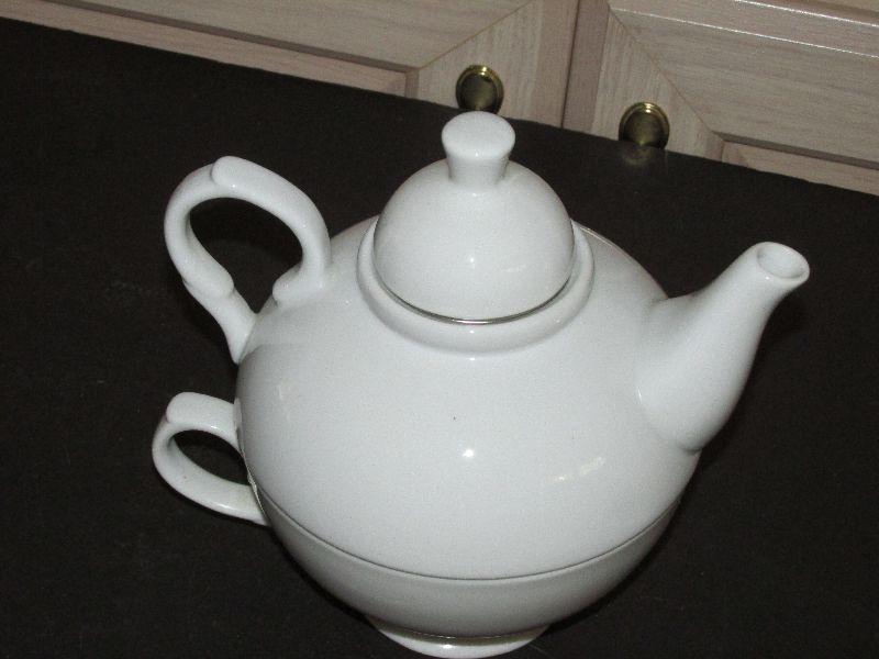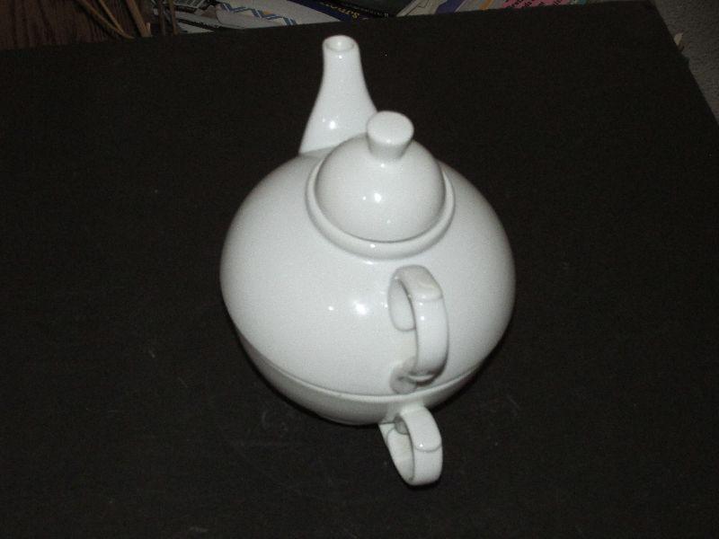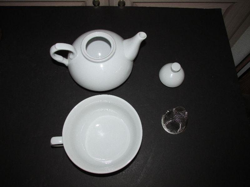 White two part ceramic teapot and cup with mess insert from World Market. No chips and cracks.