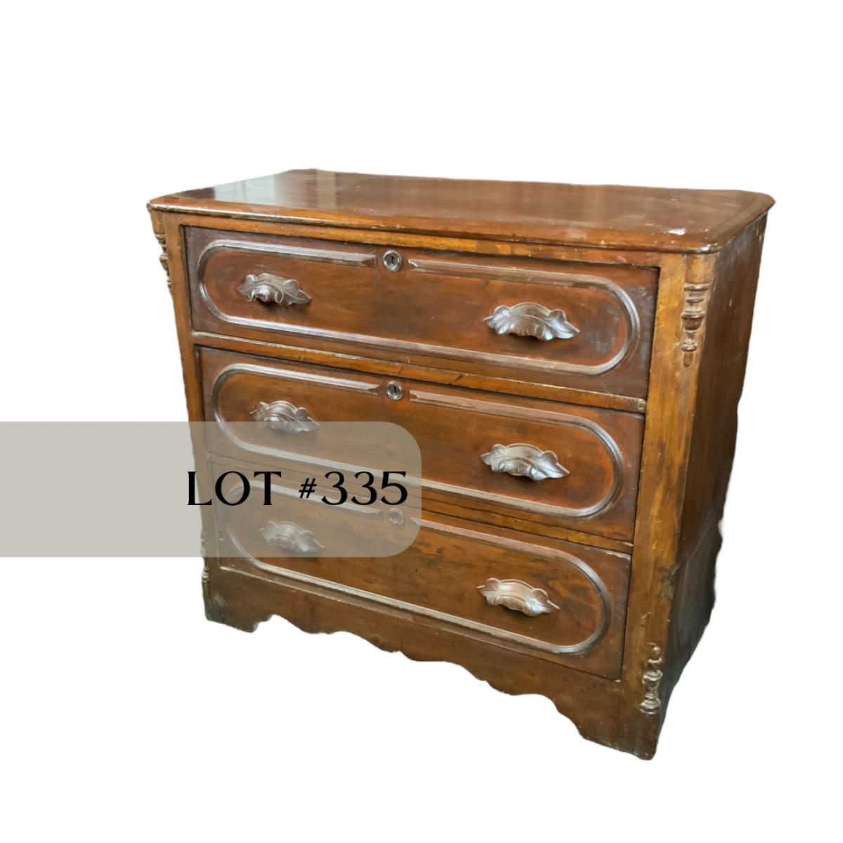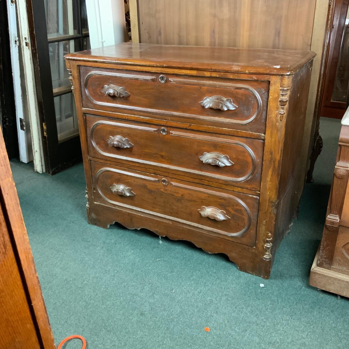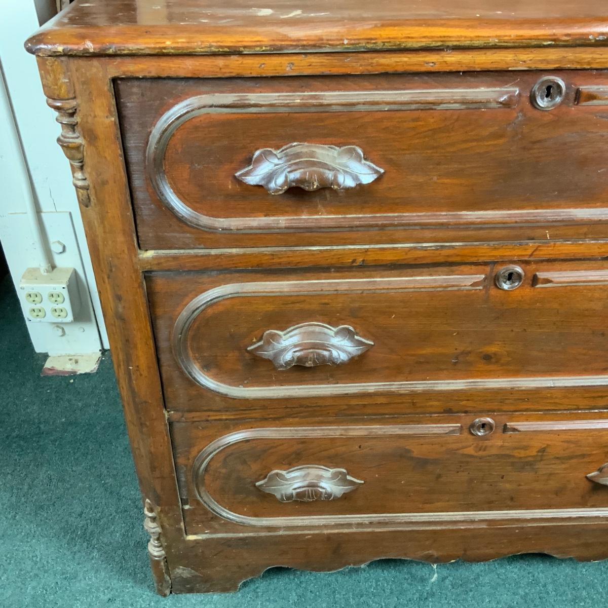 Three drawer dresser, solid piece. //::\\ Please see photos for details and condition. No attempt has been made to hide any imperfections. All items listed in this auction are warehouse items, and need to be cleaned. A majority of the items need restoration as well. All items are sold AS IS and WITHOUT GUARANTEE. If you are uncertain about an item, DO NOT BID. Due to the nature of this online auction in-person inspection is HIGHLY recommended. All Sales are FINAL. Pick Up Times are FIRM. Please confirm with your own schedule that you can pick up in the scheduled times listed in the Terms and Conditions. Any questions please message the auctioneer. DO NOT Contact The Harp Gallery.