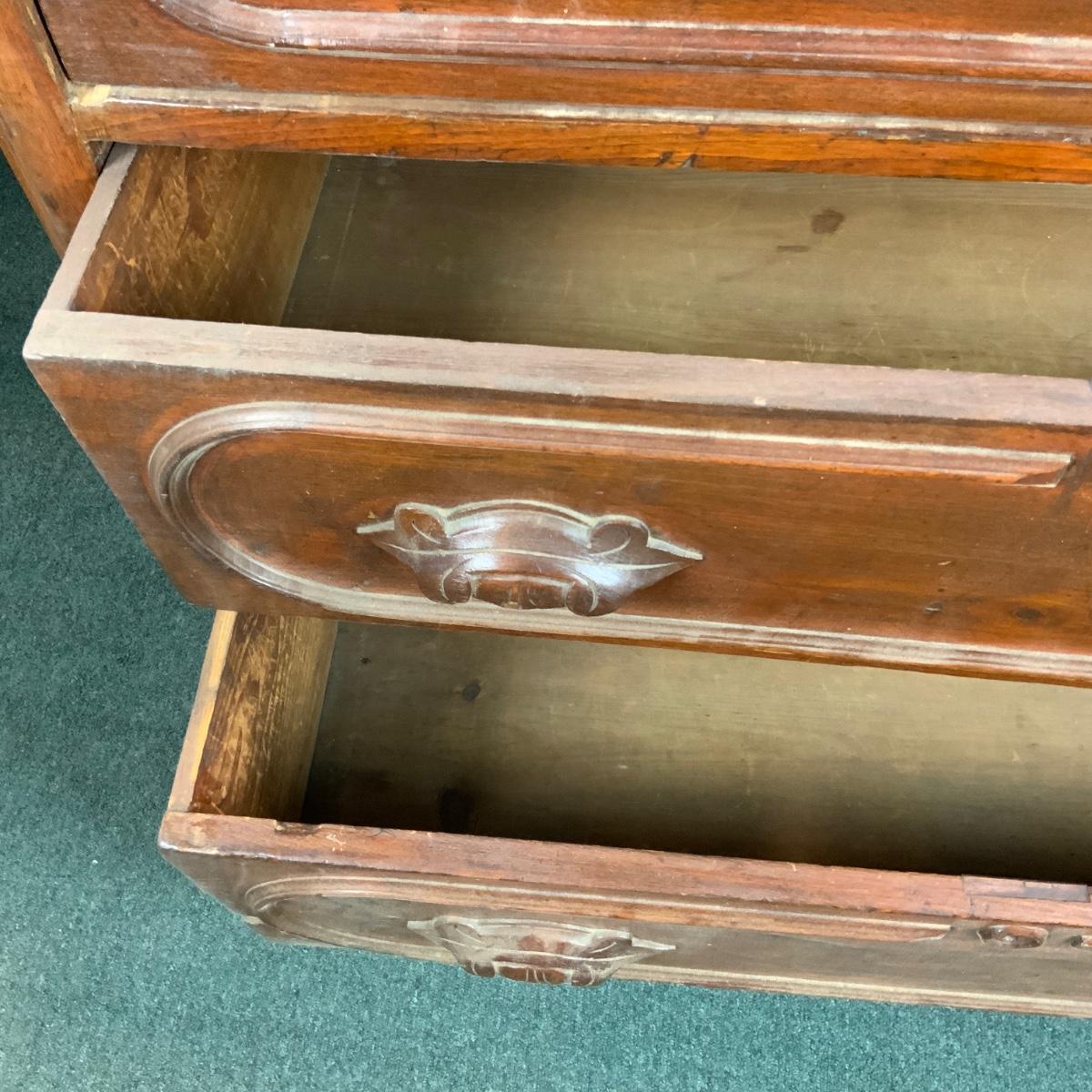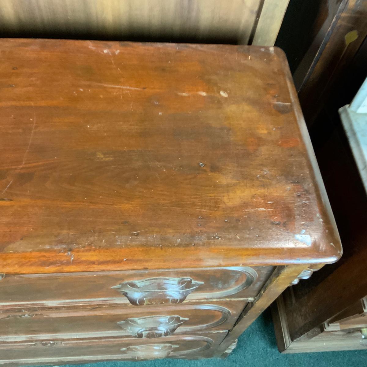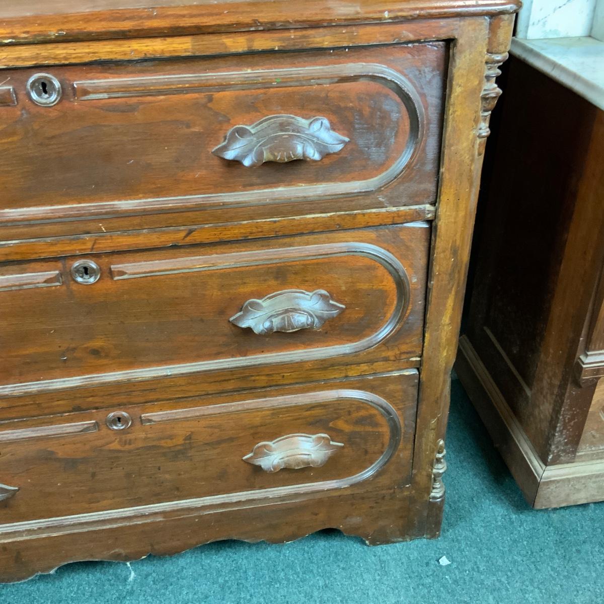 Three drawer dresser, solid piece. //::\\ Please see photos for details and condition. No attempt has been made to hide any imperfections. All items listed in this auction are warehouse items, and need to be cleaned. A majority of the items need restoration as well. All items are sold AS IS and WITHOUT GUARANTEE. If you are uncertain about an item, DO NOT BID. Due to the nature of this online auction in-person inspection is HIGHLY recommended. All Sales are FINAL. Pick Up Times are FIRM. Please confirm with your own schedule that you can pick up in the scheduled times listed in the Terms and Conditions. Any questions please message the auctioneer. DO NOT Contact The Harp Gallery.