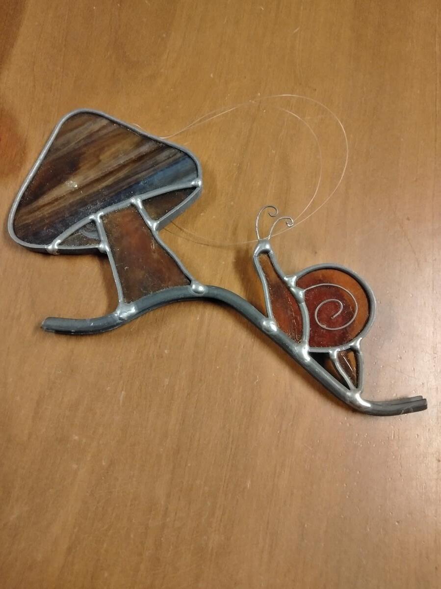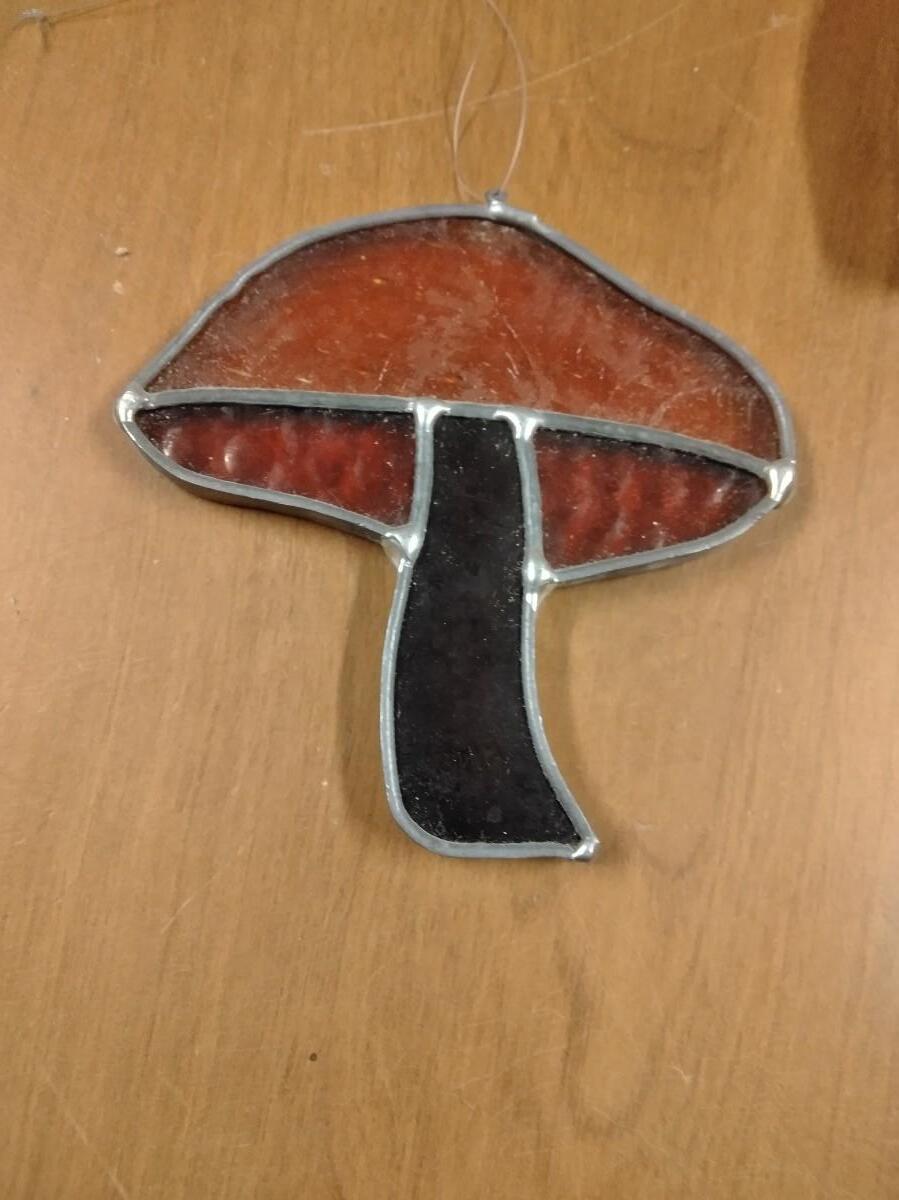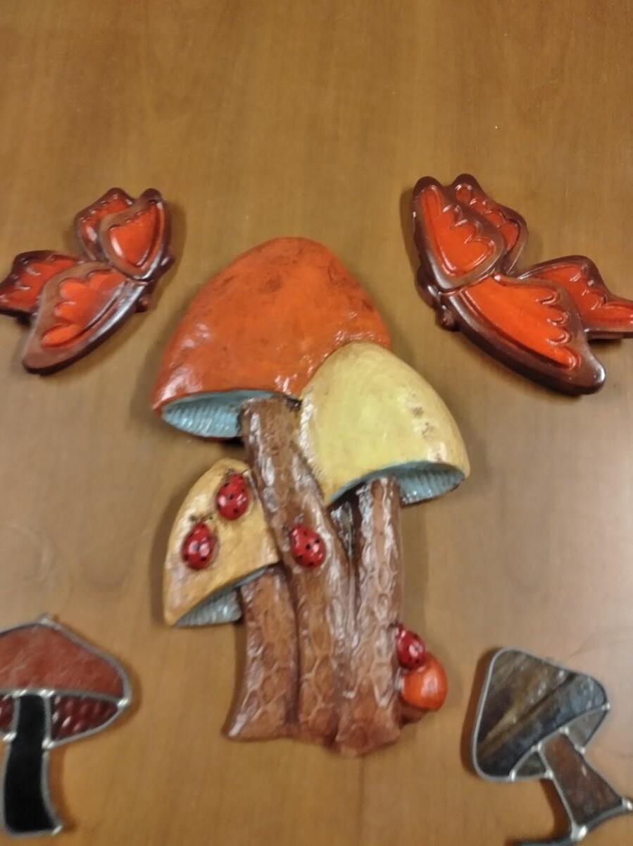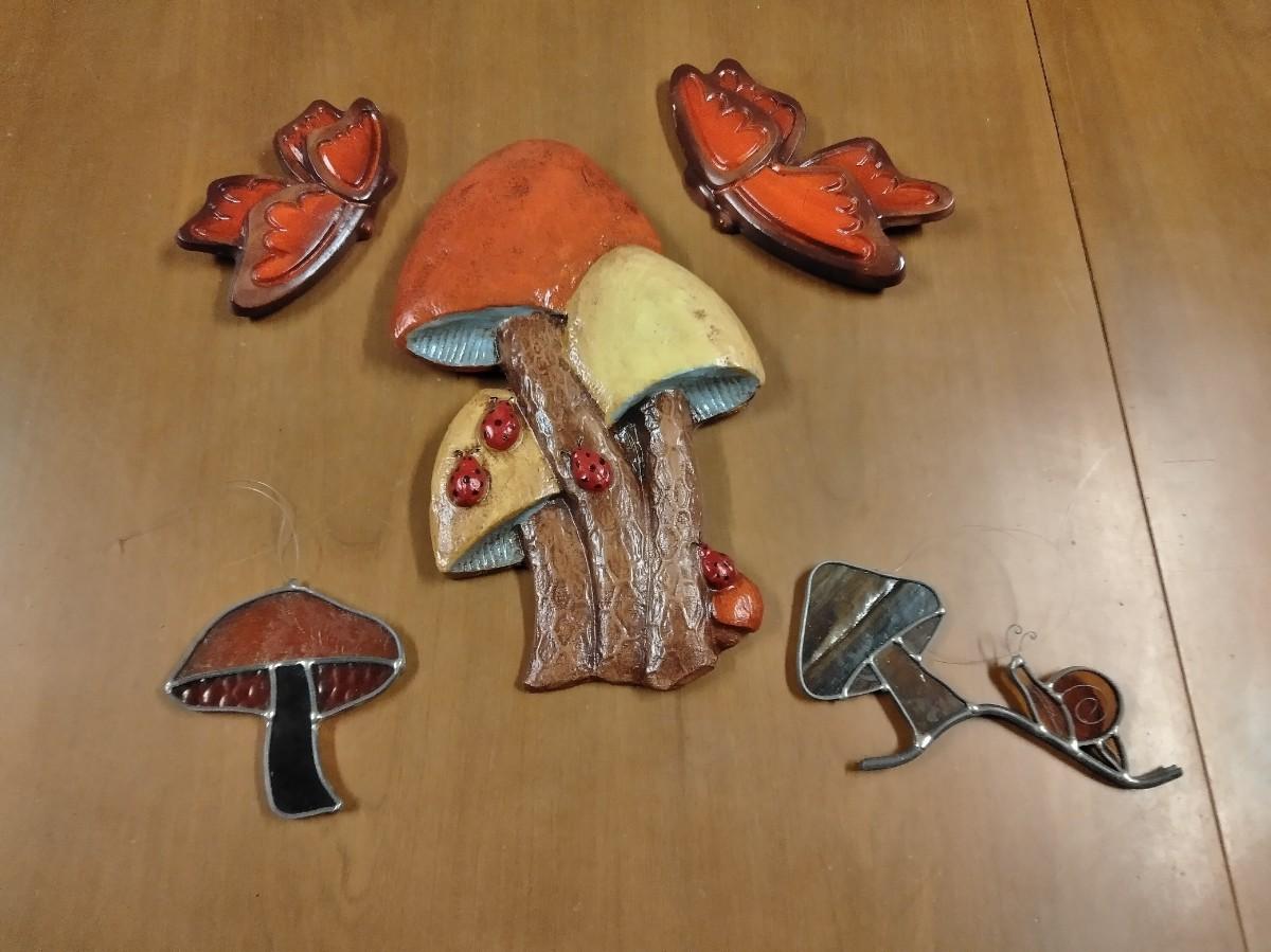 CHALKWARE MUSHROOMS AND BUTTERFLIES, AND TWO STAINED GLASS MUSHROOMS