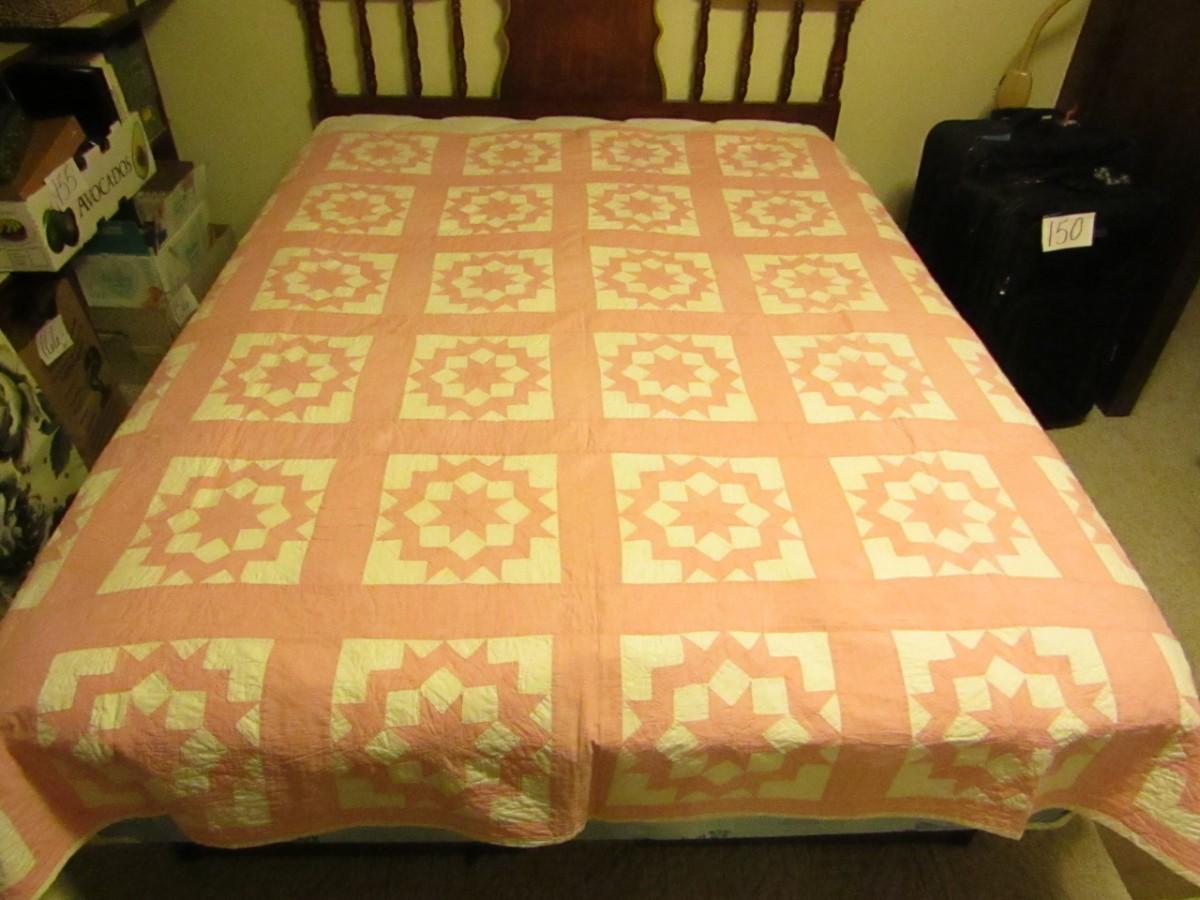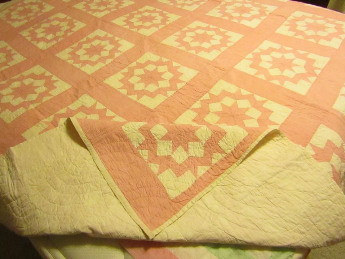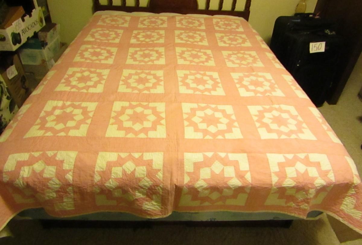 GORGEOUS PINK AND CREAM COLORED HAND STITCHED QUEEN SIZE QUILT IN GREAT SHAPE