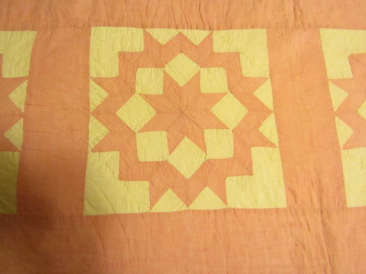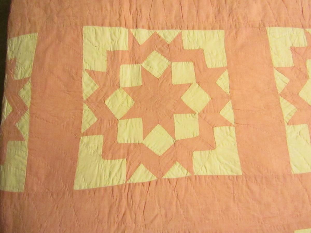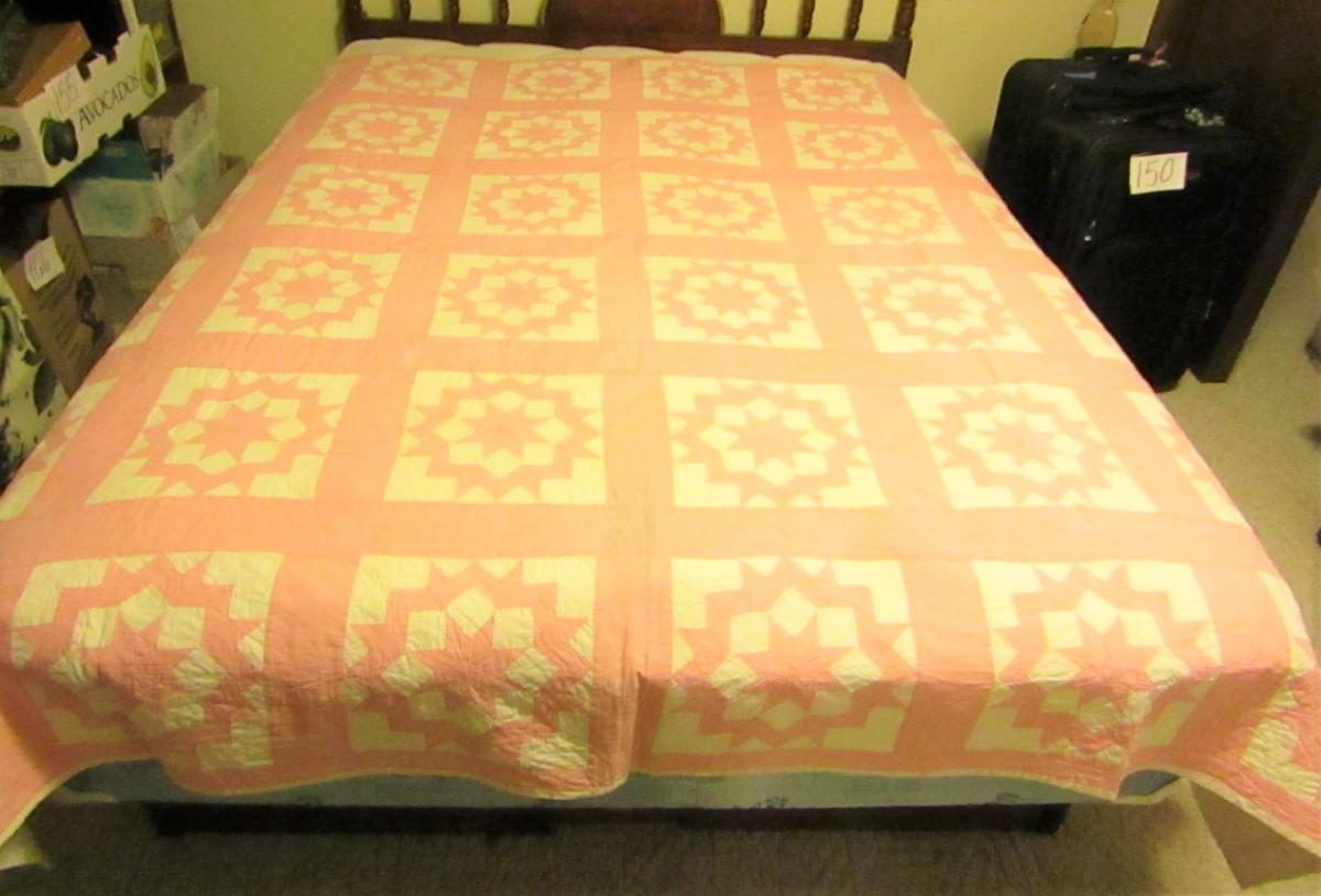 GORGEOUS PINK AND CREAM COLORED HAND STITCHED QUEEN SIZE QUILT IN GREAT SHAPE