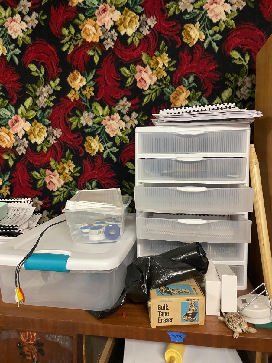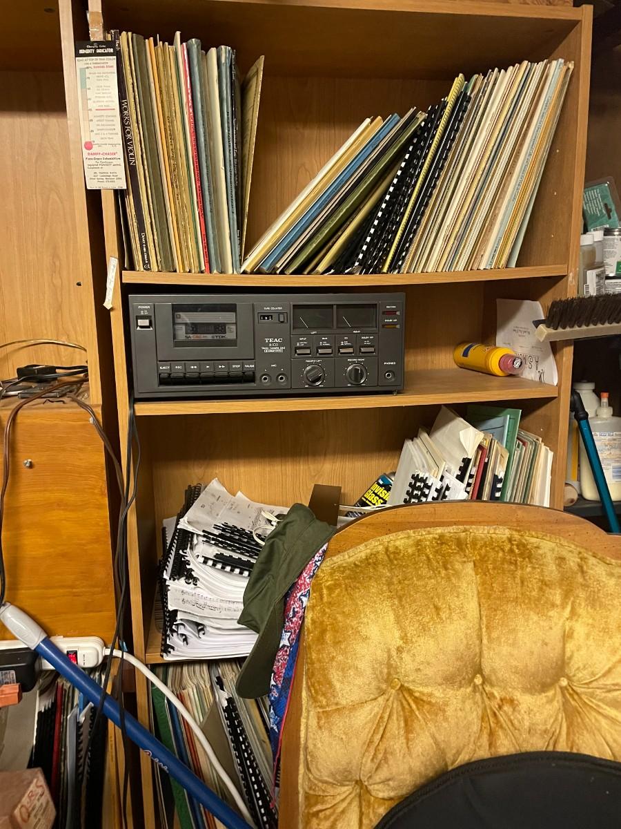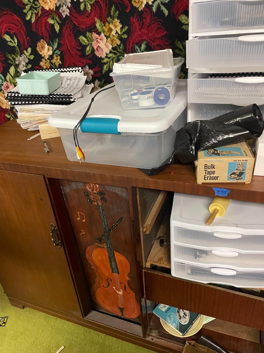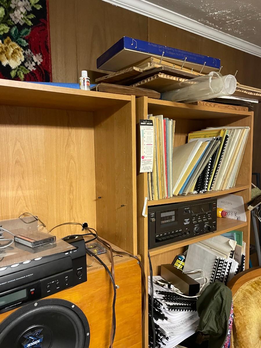 mid. century modern cabinet with contents, misc. items, electronics, books, etc.