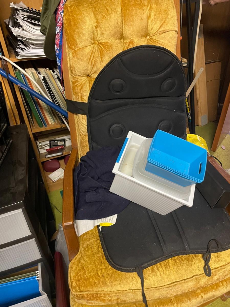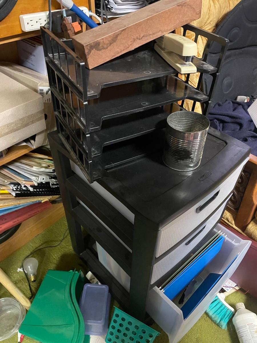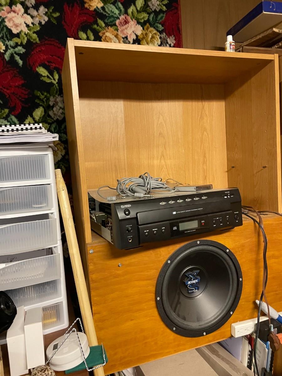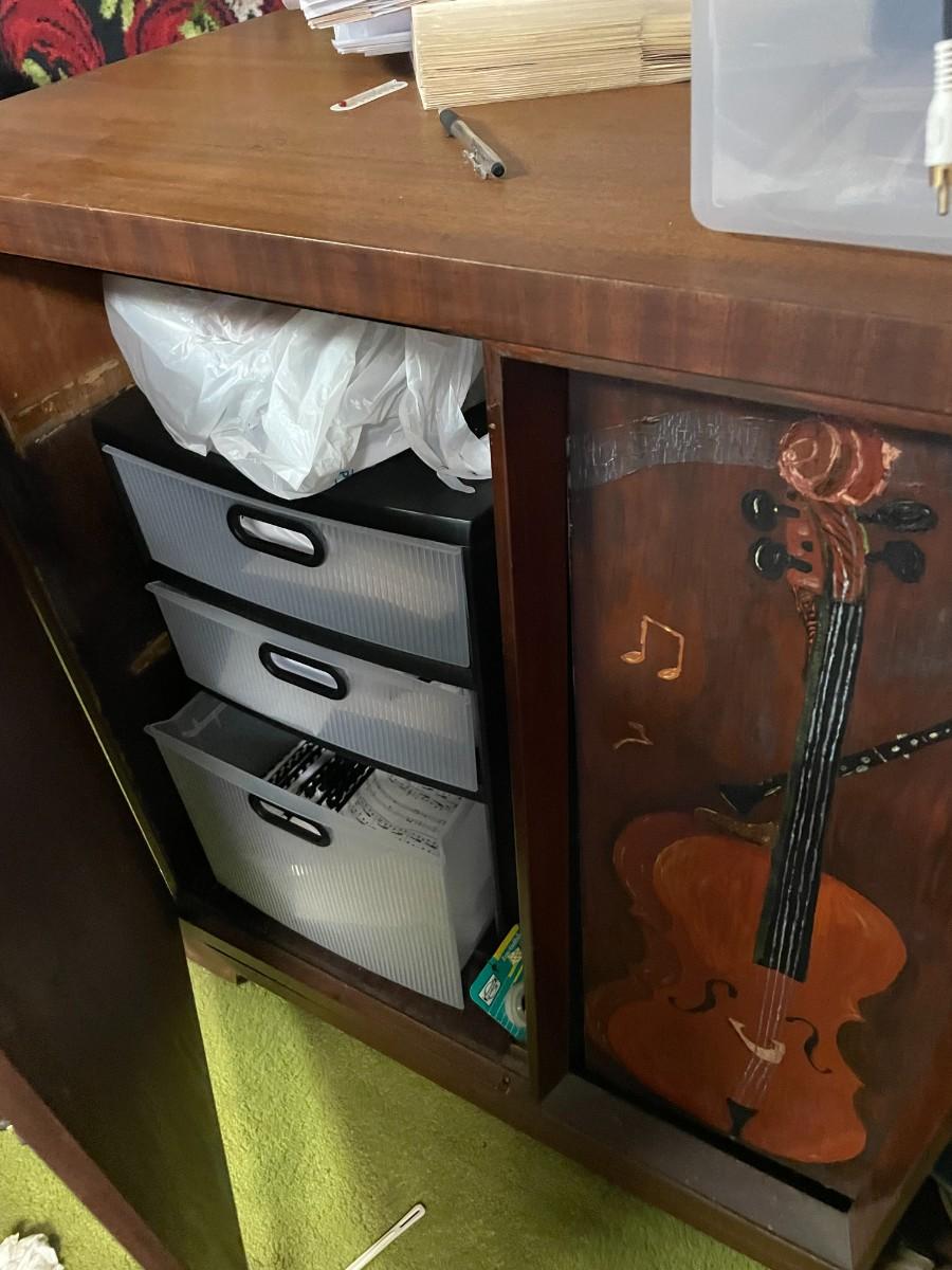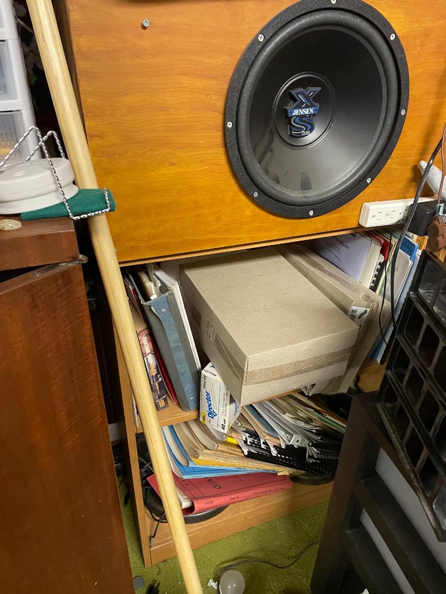 mid. century modern cabinet with contents, misc. items, electronics, books, etc.