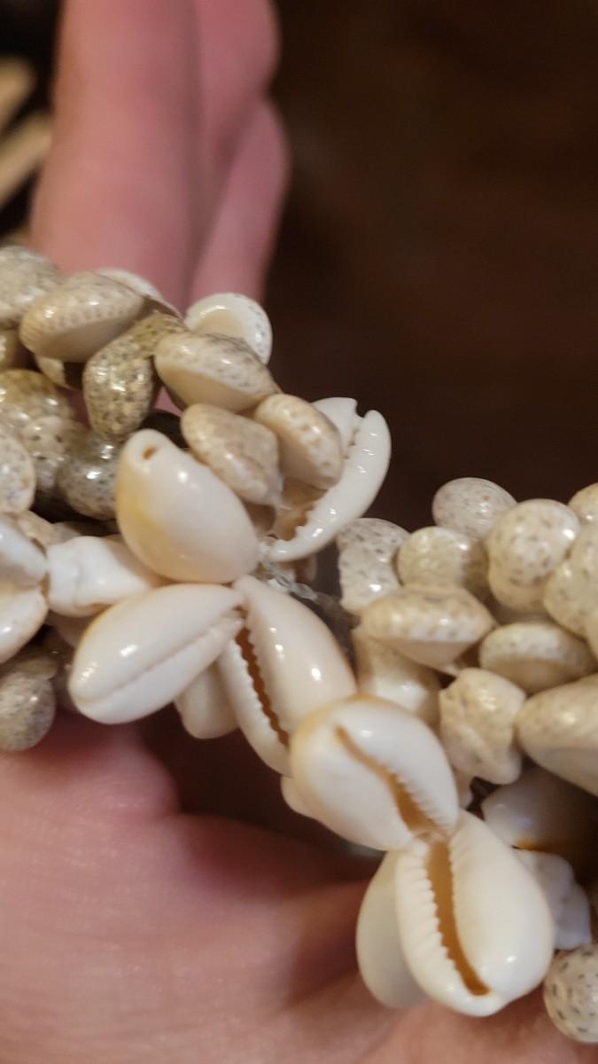 Multi Strand Shell Necklace is 16"- 18" and doesn't have a clasp