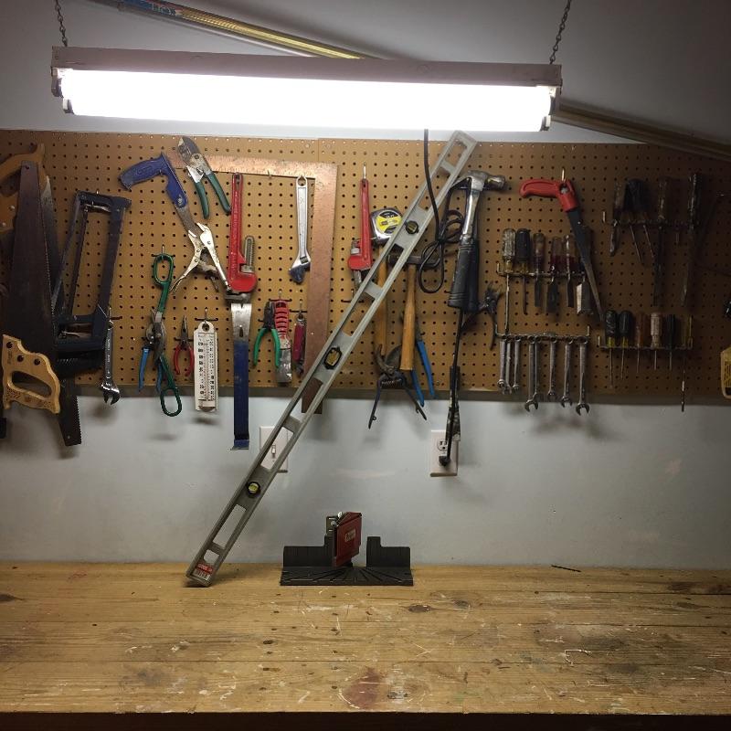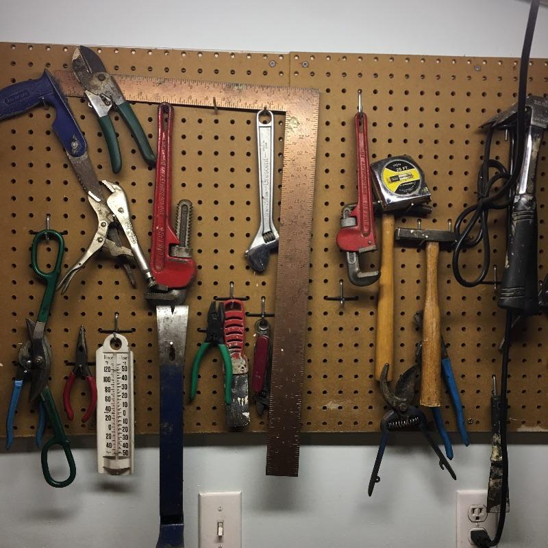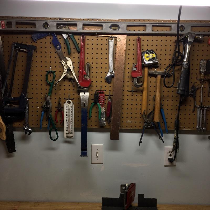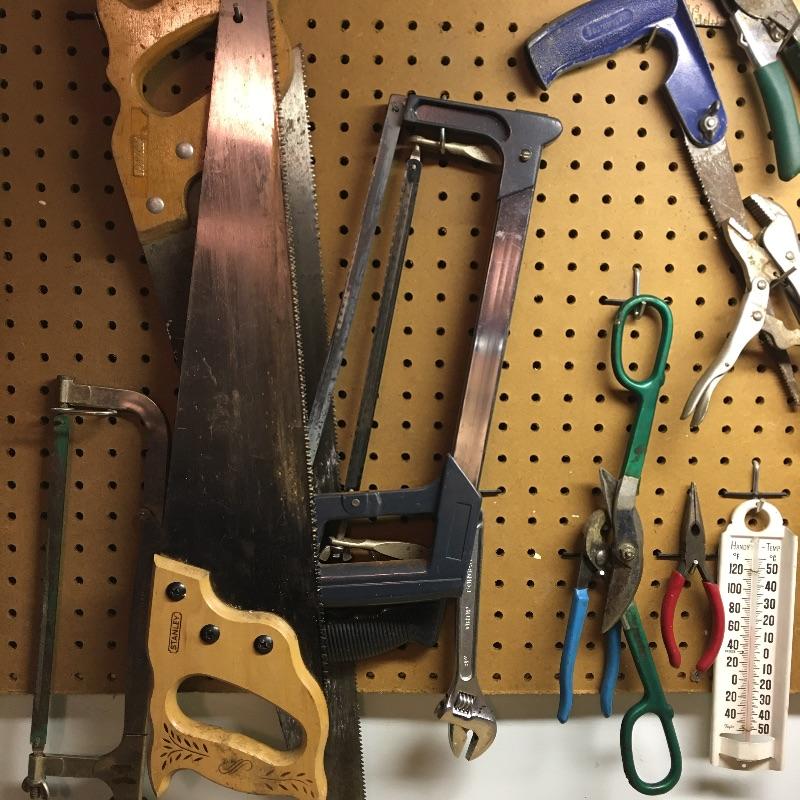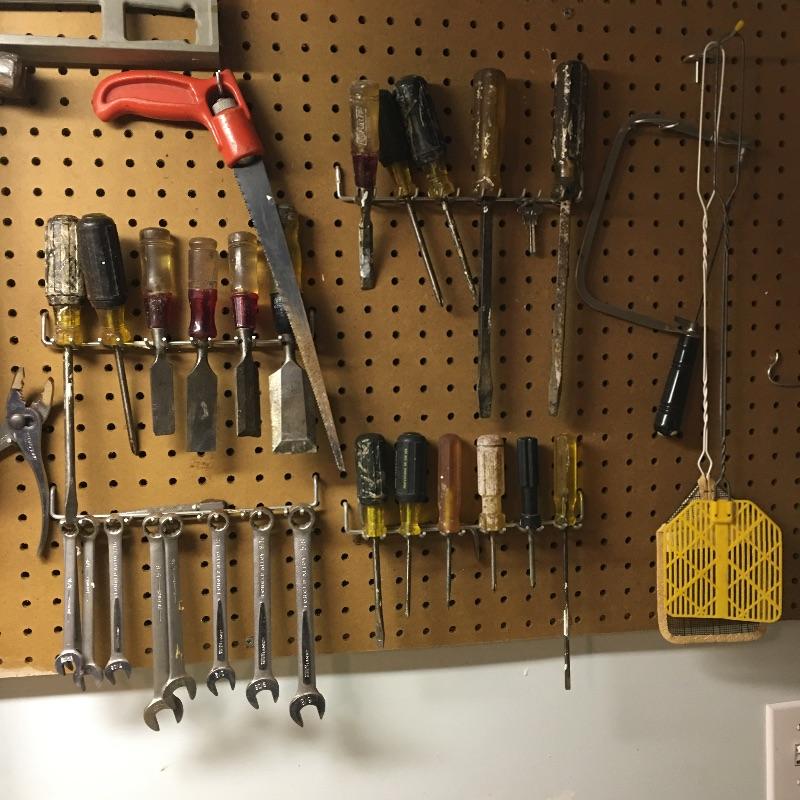 Tools includes spammers, 4’ level, mitre box, pipe wrenches, saws, chisels, screwdrivers, hammers, tape measure and more. Pegboard not included.