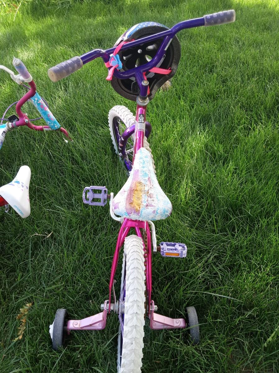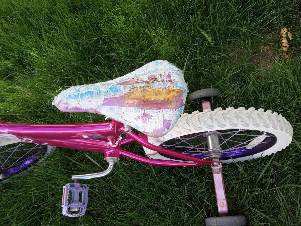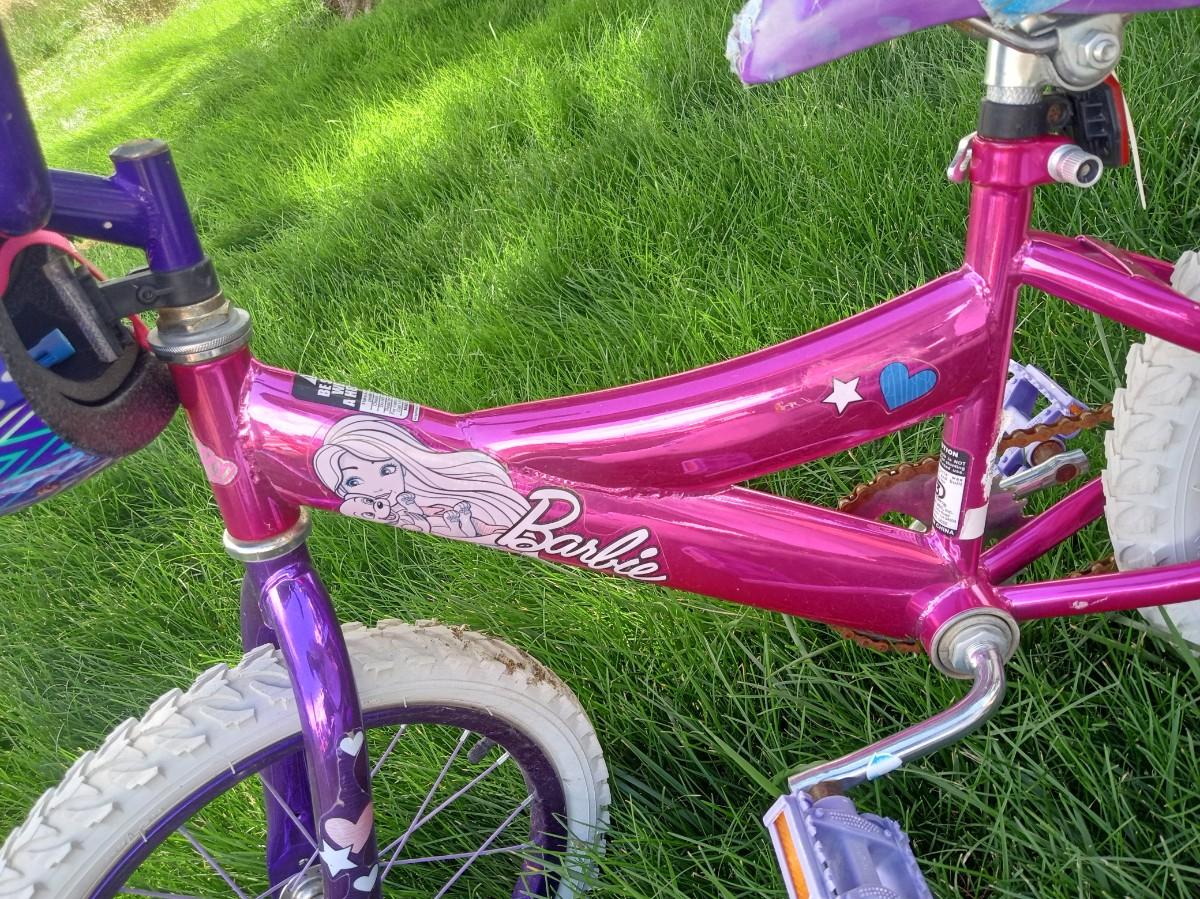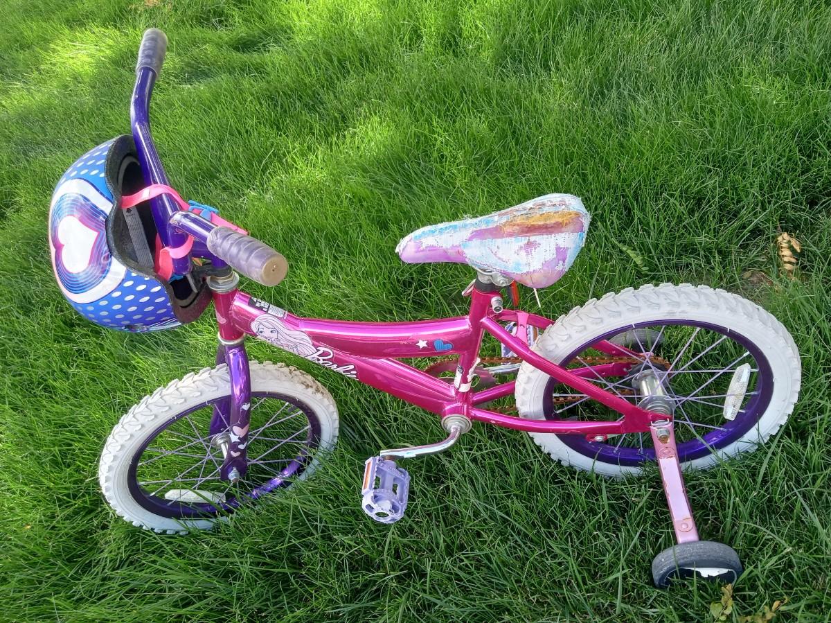 BARBIE BIKE WITH TRAINING WHEELS, THE SEAT IS IN BAD SHAPE