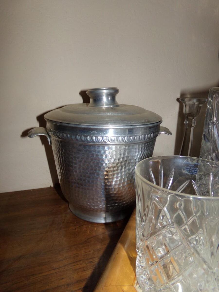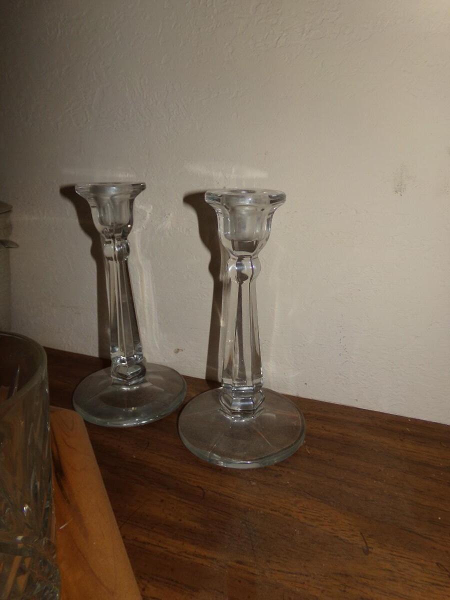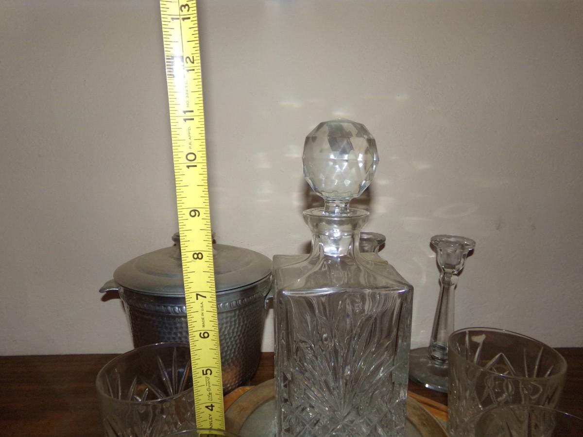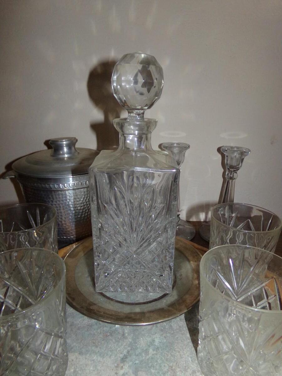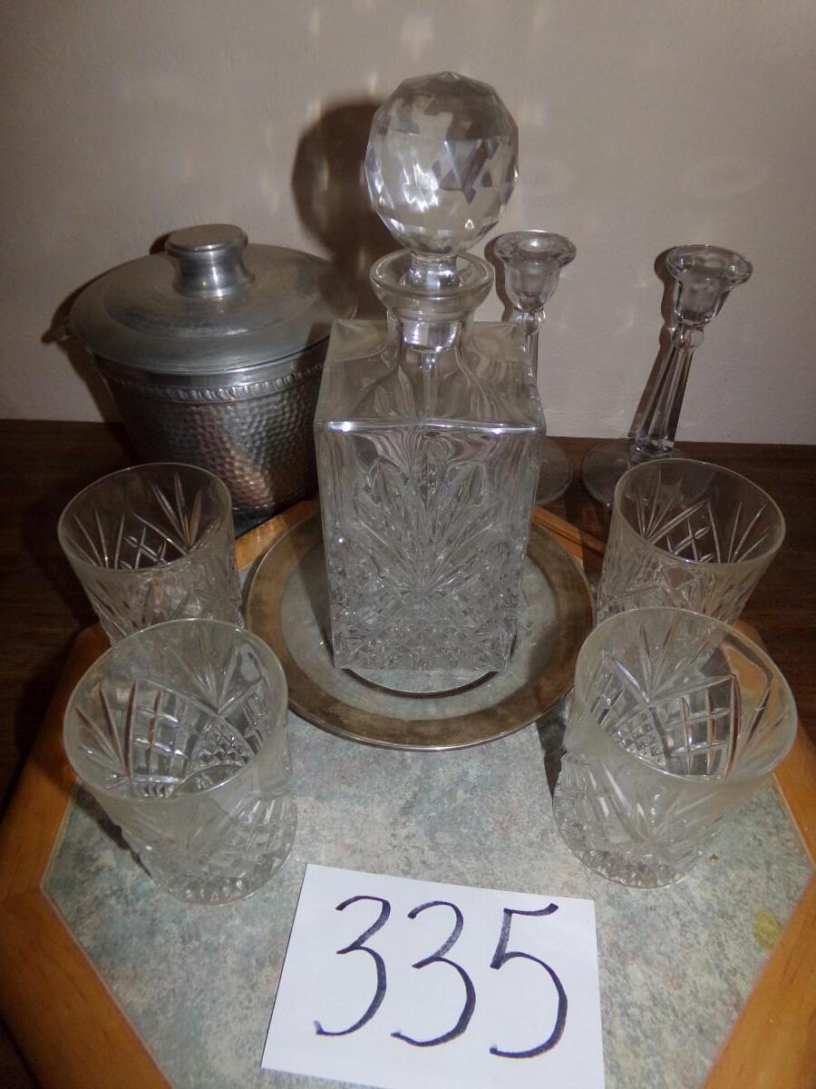 VINTAGE GLASS DECANTER BOTTLE AND GLASSES, ALSO 2 GLASS CANDLE HOLDERS AND A VINTAGE ICE BUCKET.
