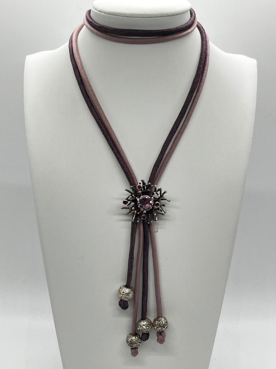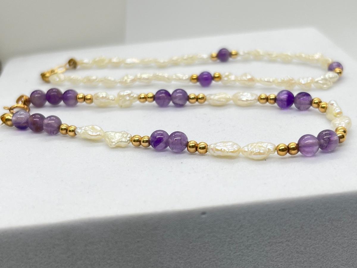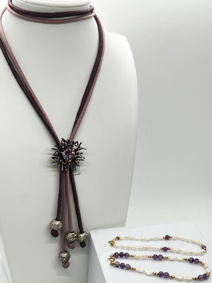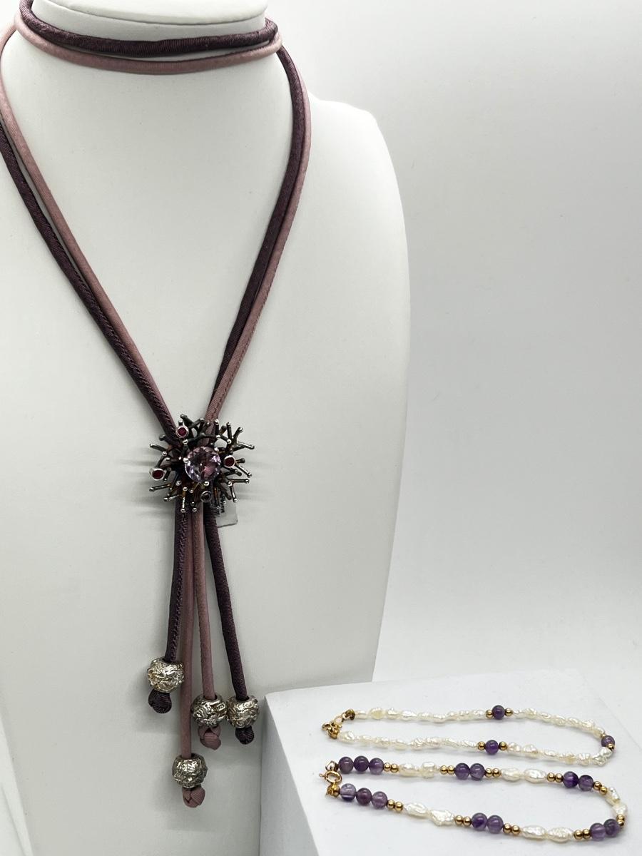 Lot 335J: Satin Cord Bolo Necklace + Two 7" Amethyst and Freshwater Pearl Braceletes with 14K Clasps