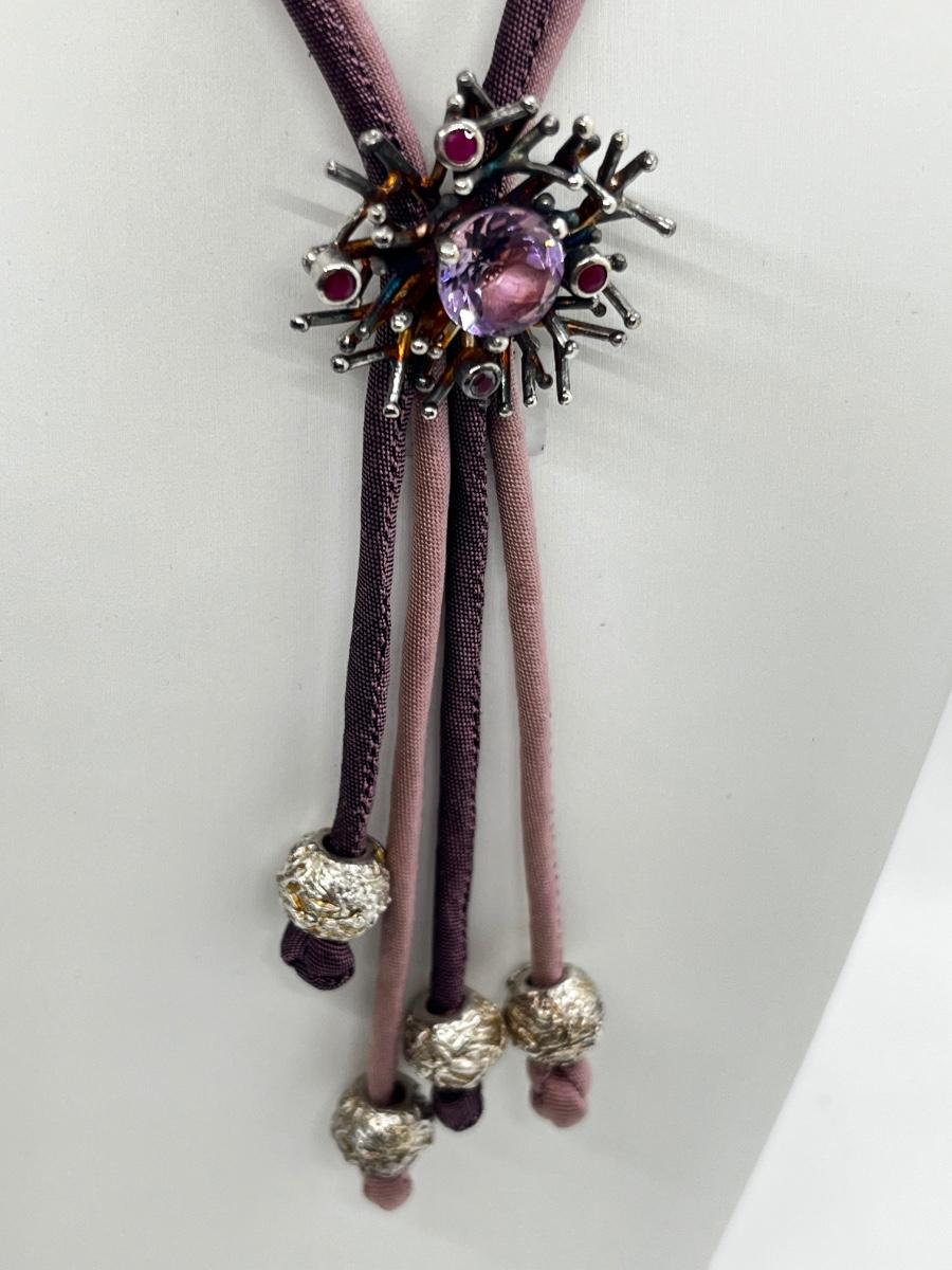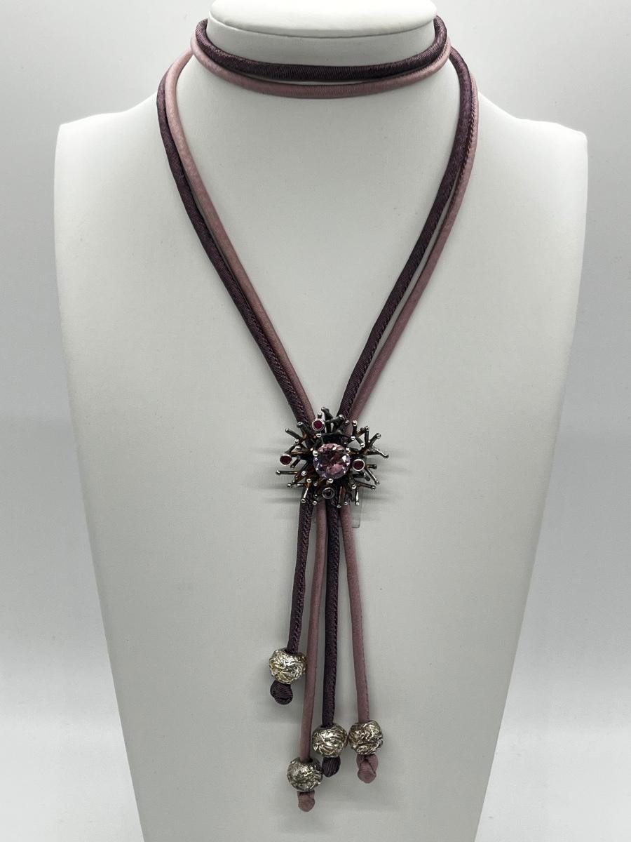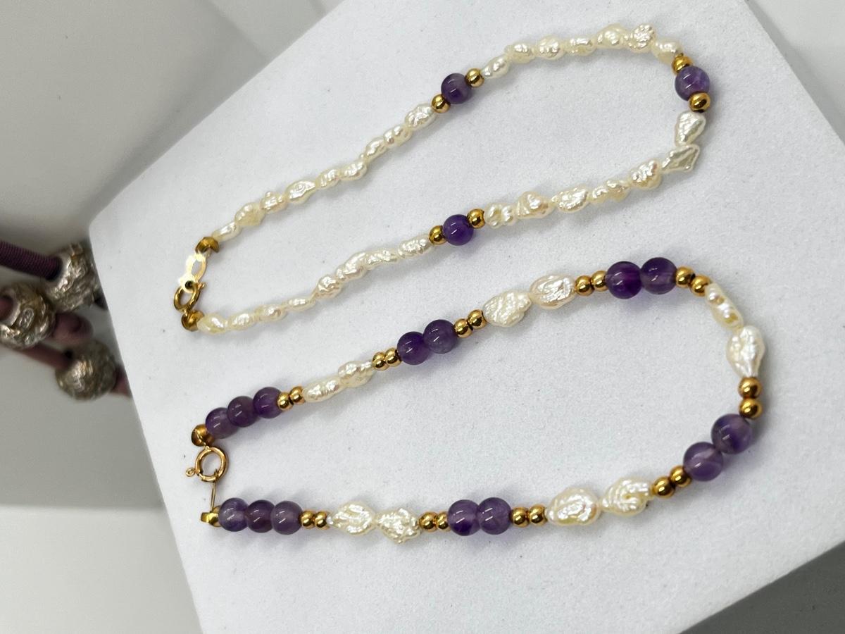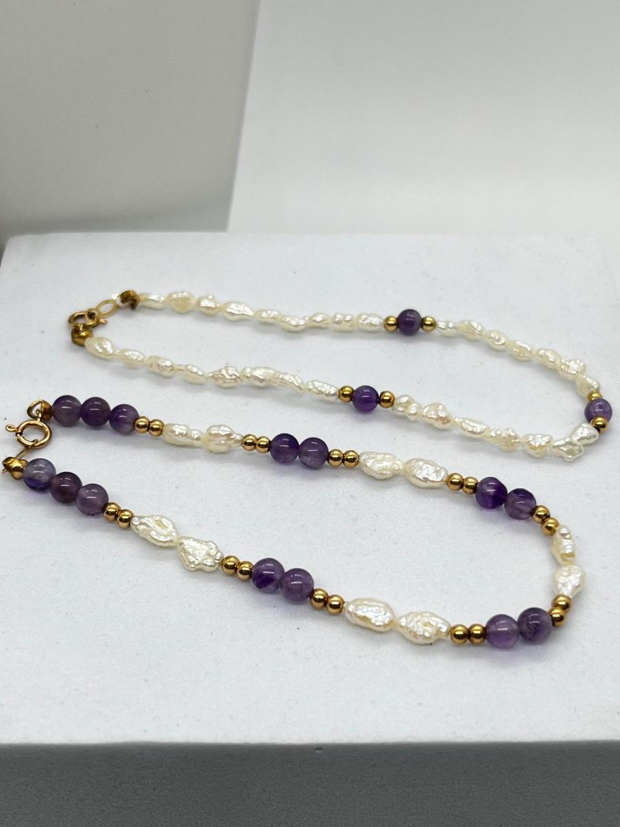 Lot 335J: Satin Cord Bolo Necklace + Two 7" Amethyst and Freshwater Pearl Braceletes with 14K Clasps