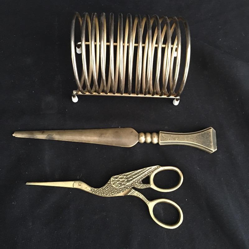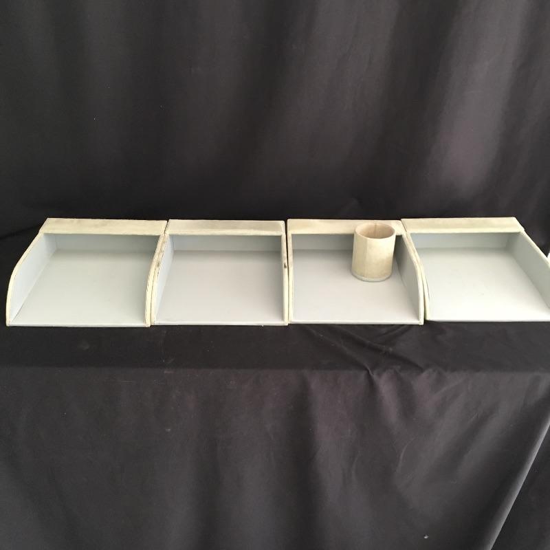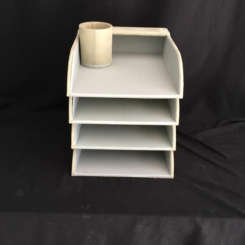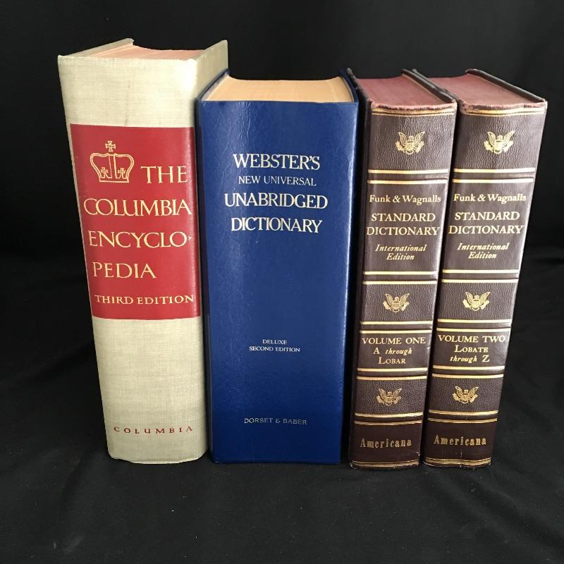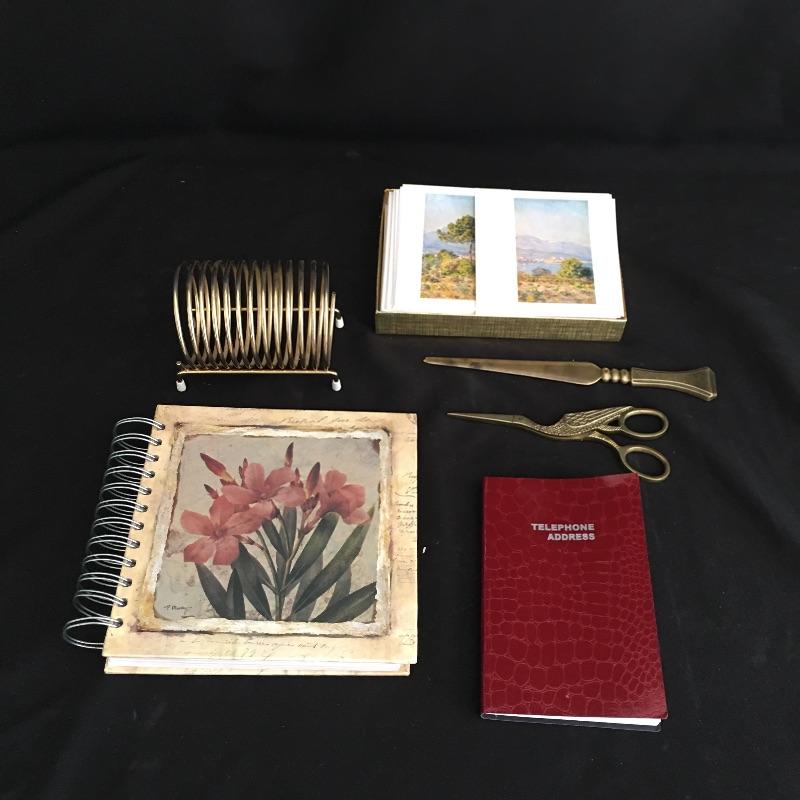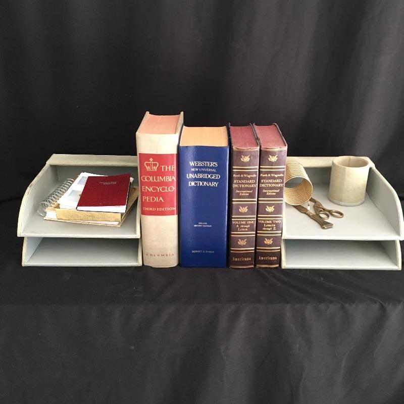 All sorts of useful items in this desk accessory lot including four leather letter boxes and a matching pen and pencil holder, decorative scissors, letter opener, three dictionaries, encyclopedia and more. Letter boxes measure 10.5” x12” x 3.25”.