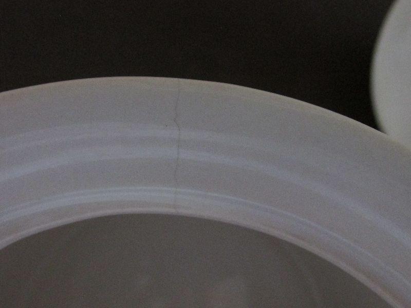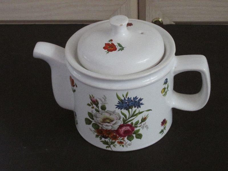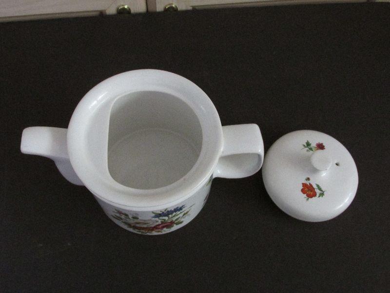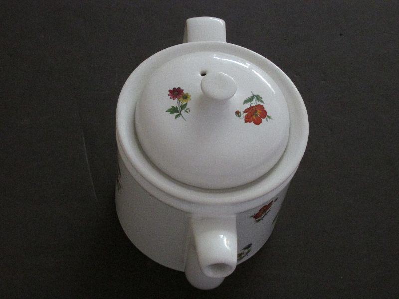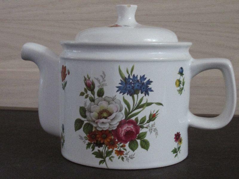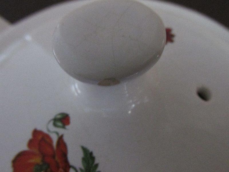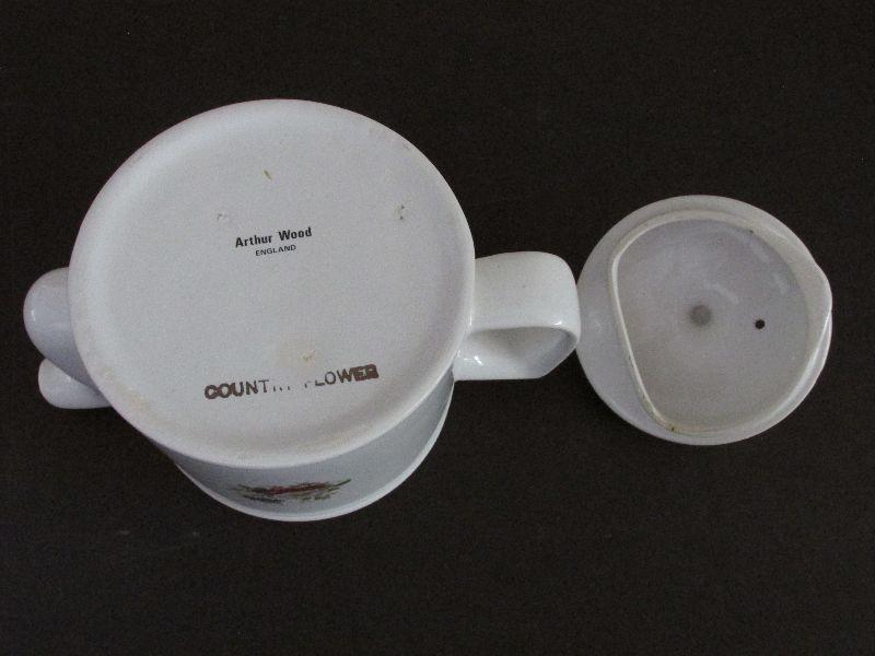 Arthur Wood Floral Teapot. There is a significant amount of crazing throughout the teapot. There is also a crack in the inner rim and chip on the top handle of the teapot lid. Both shown in photos.