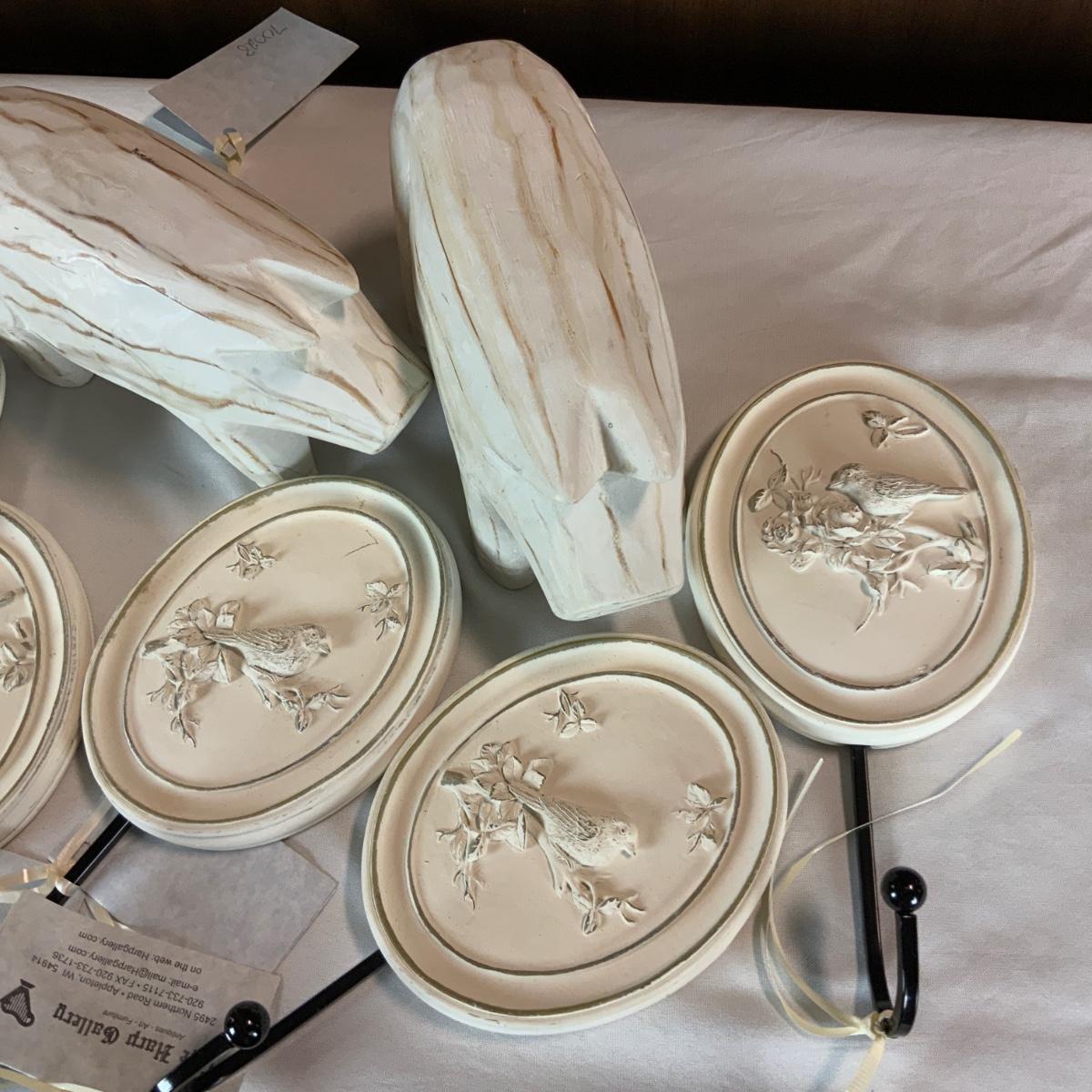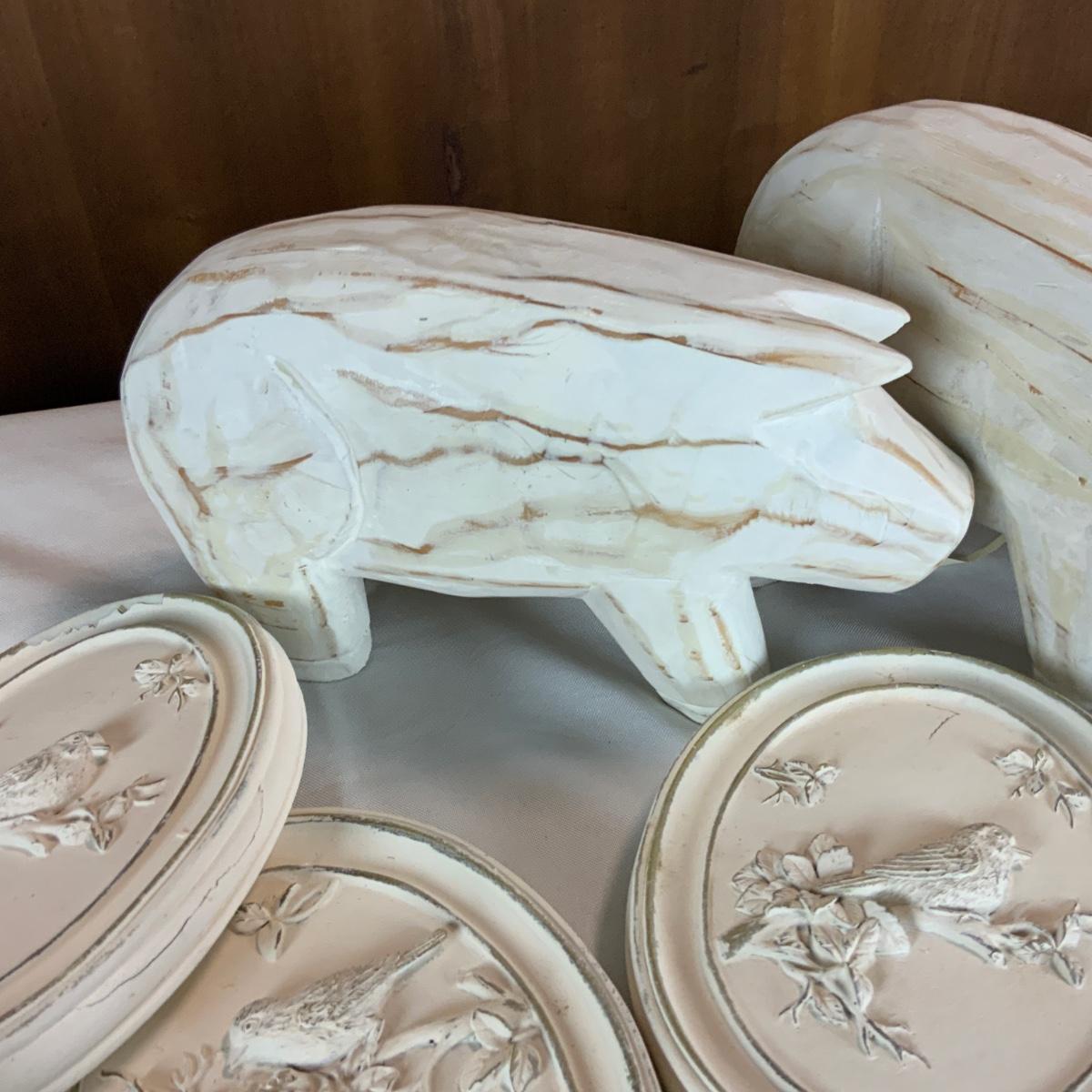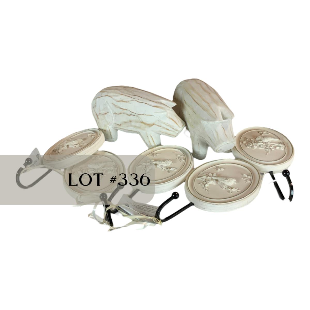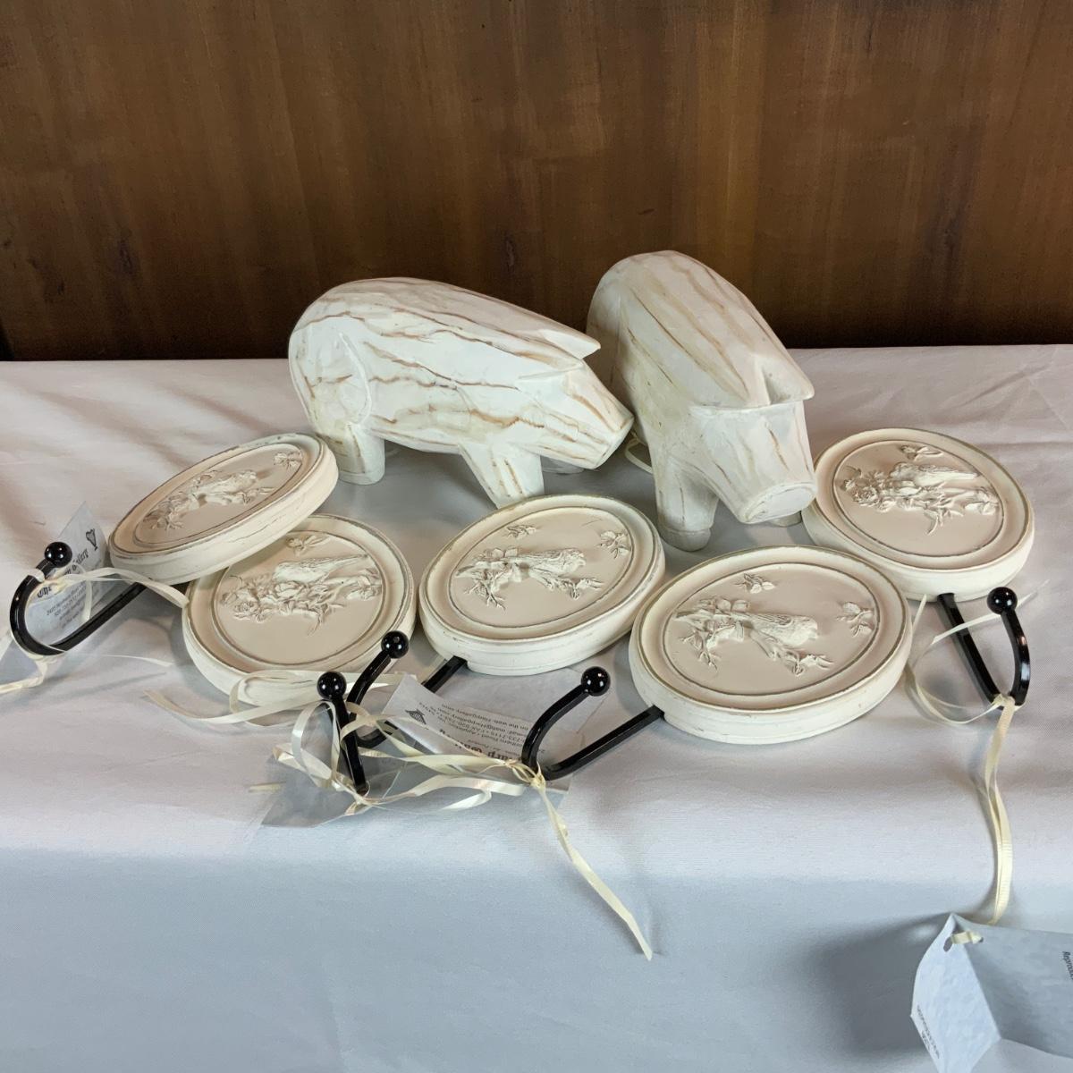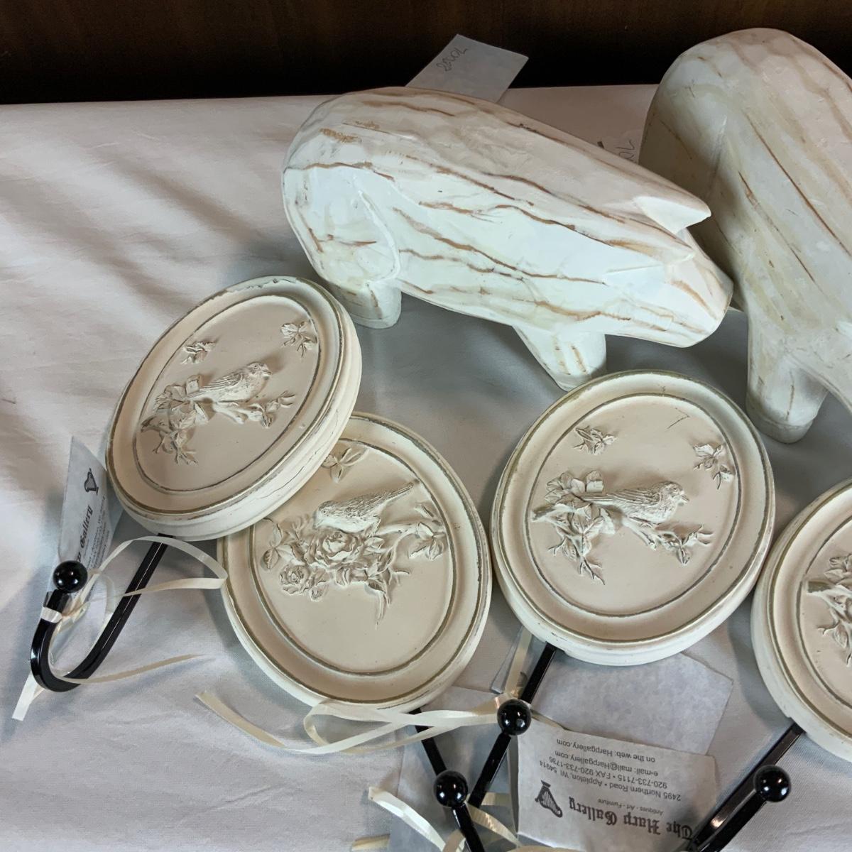 Five reproduction French inspired hooks, two pigs. //::\\ Please see photos for details and condition. No attempt has been made to hide any imperfections. All items listed in this auction are warehouse items, and need to be cleaned. A majority of the items need restoration as well. All items are sold AS IS and WITHOUT GUARANTEE. If you are uncertain about an item, DO NOT BID. Due to the nature of this online auction in-person inspection is HIGHLY recommended. All Sales are FINAL. Pick Up Times are FIRM. Please confirm with your own schedule that you can pick up in the scheduled times listed in the Terms and Conditions. Any questions please message the auctioneer. DO NOT Contact The Harp Gallery.