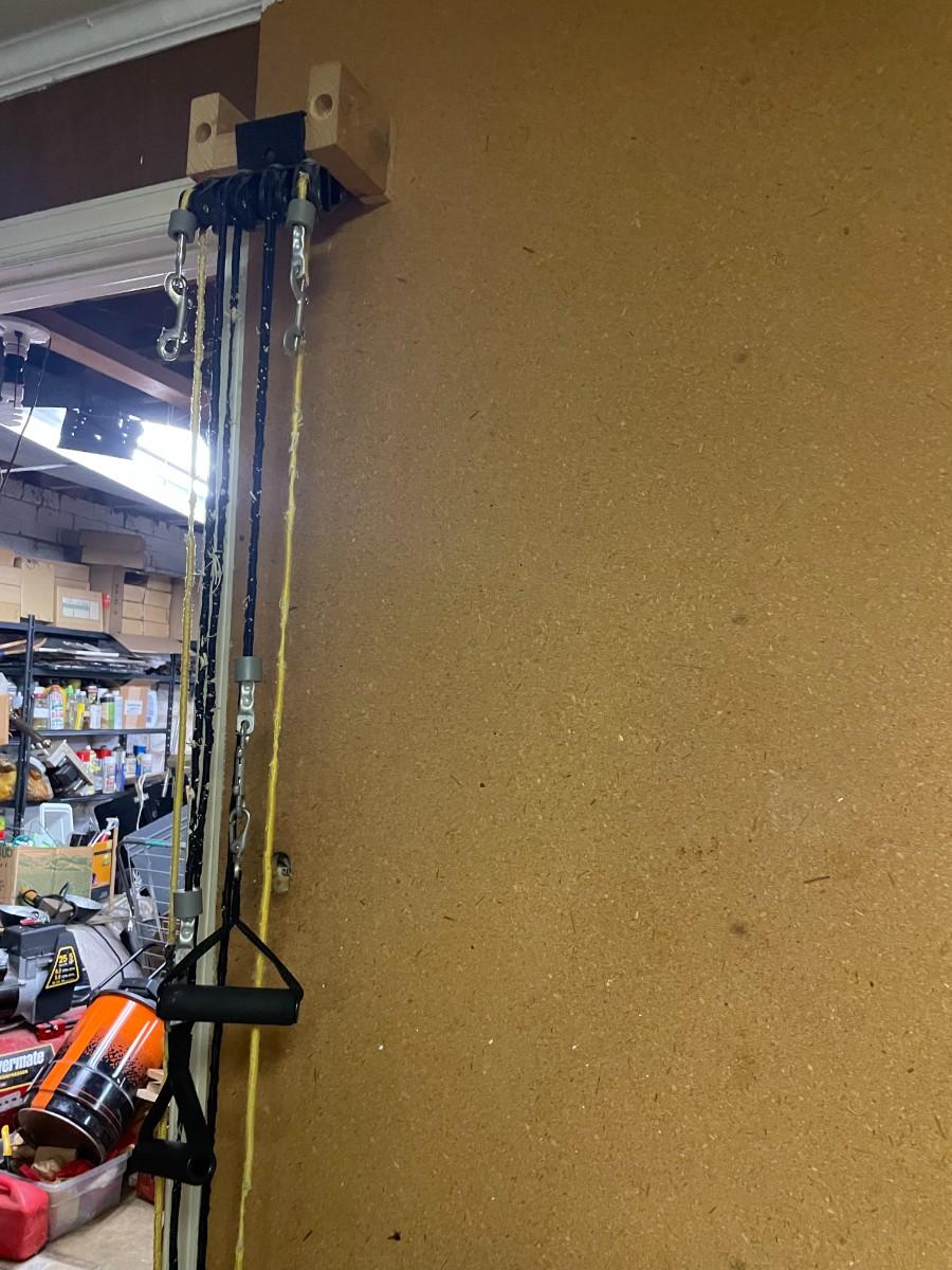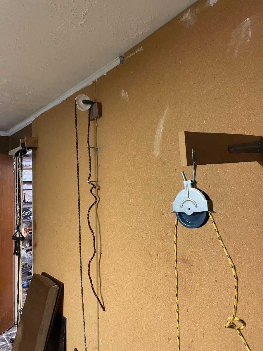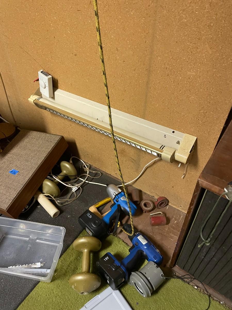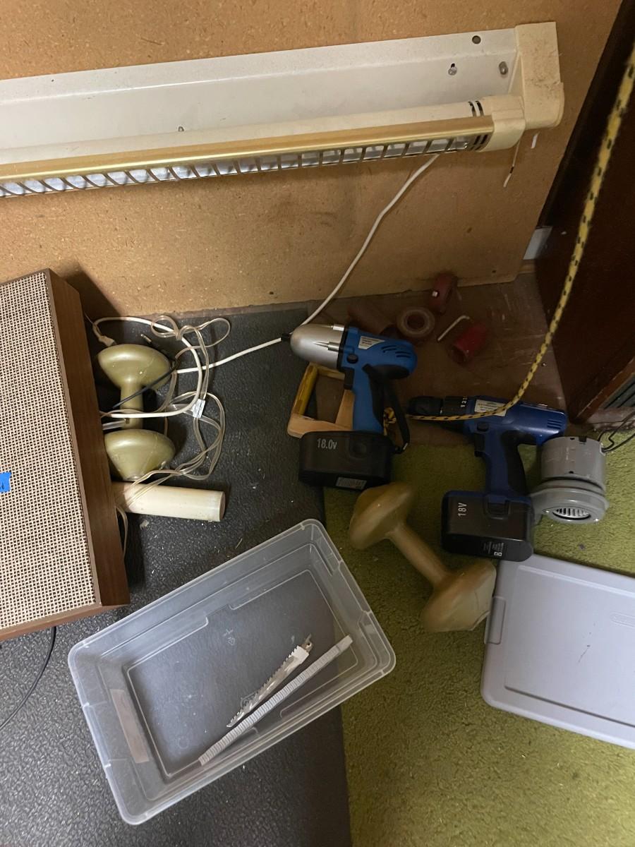 misc. tools, electronics, exercise equipment, knife, speakers.