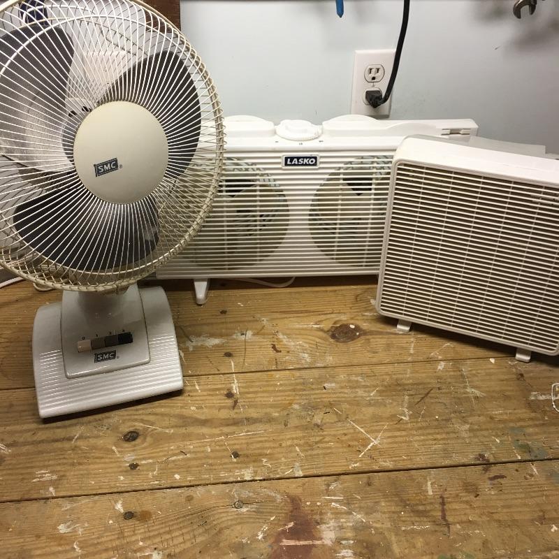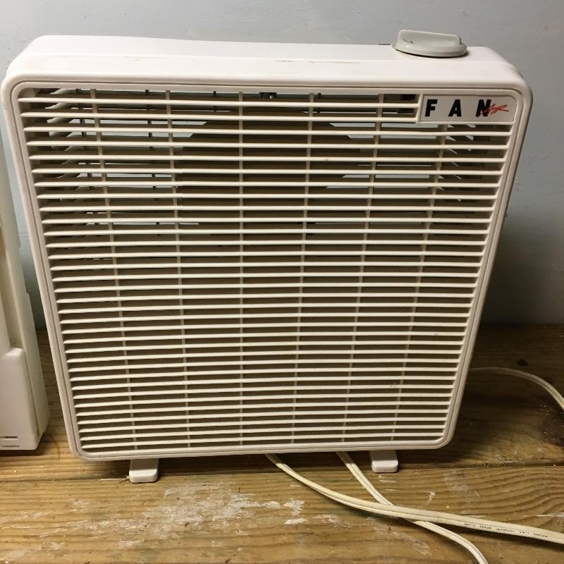 Trio of fans. Lot includes mini box fan, oscillating fan and window fan. Oscillating fan has 14”D fan. Keep the air moving with these cool fans.