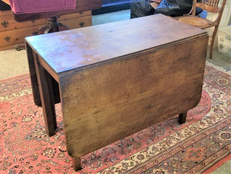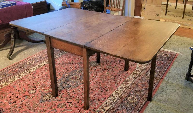 If you have been looking for a nice antique gateleg table, this may be the one. Good antique condition - all original. Sturdy - Oak. When fully extended, measures 60.5" long. 41" across, 27.5" tall. This one was used as a side table with leaves down. Perfect when you need extra seating at holiday time. 19th century.
