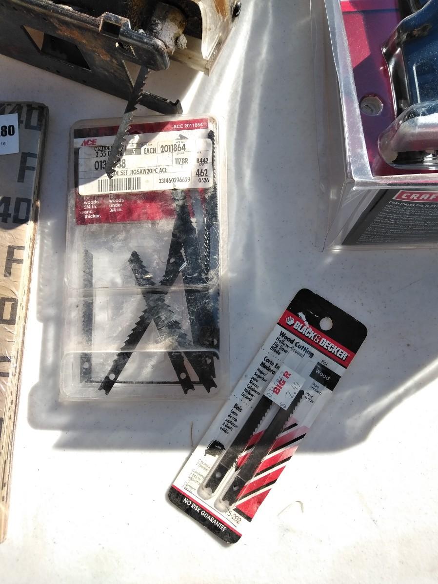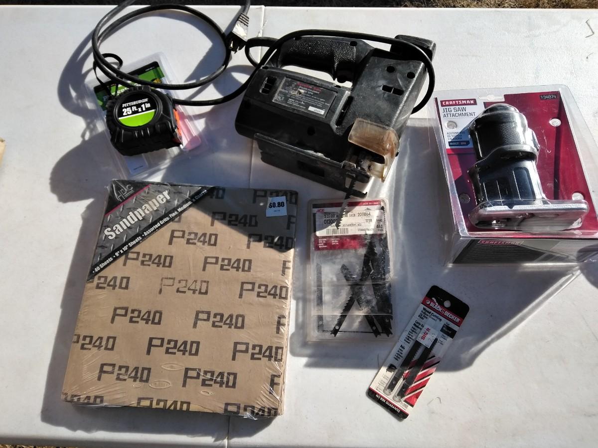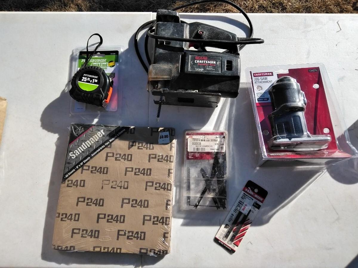 CRAFTSMAN JIGSAW, NEW CRAFTSMAN JIGSAW ATTATCHMENT (fit this saw?) SANDPAPER, TAPE MEASURE, AND MORE