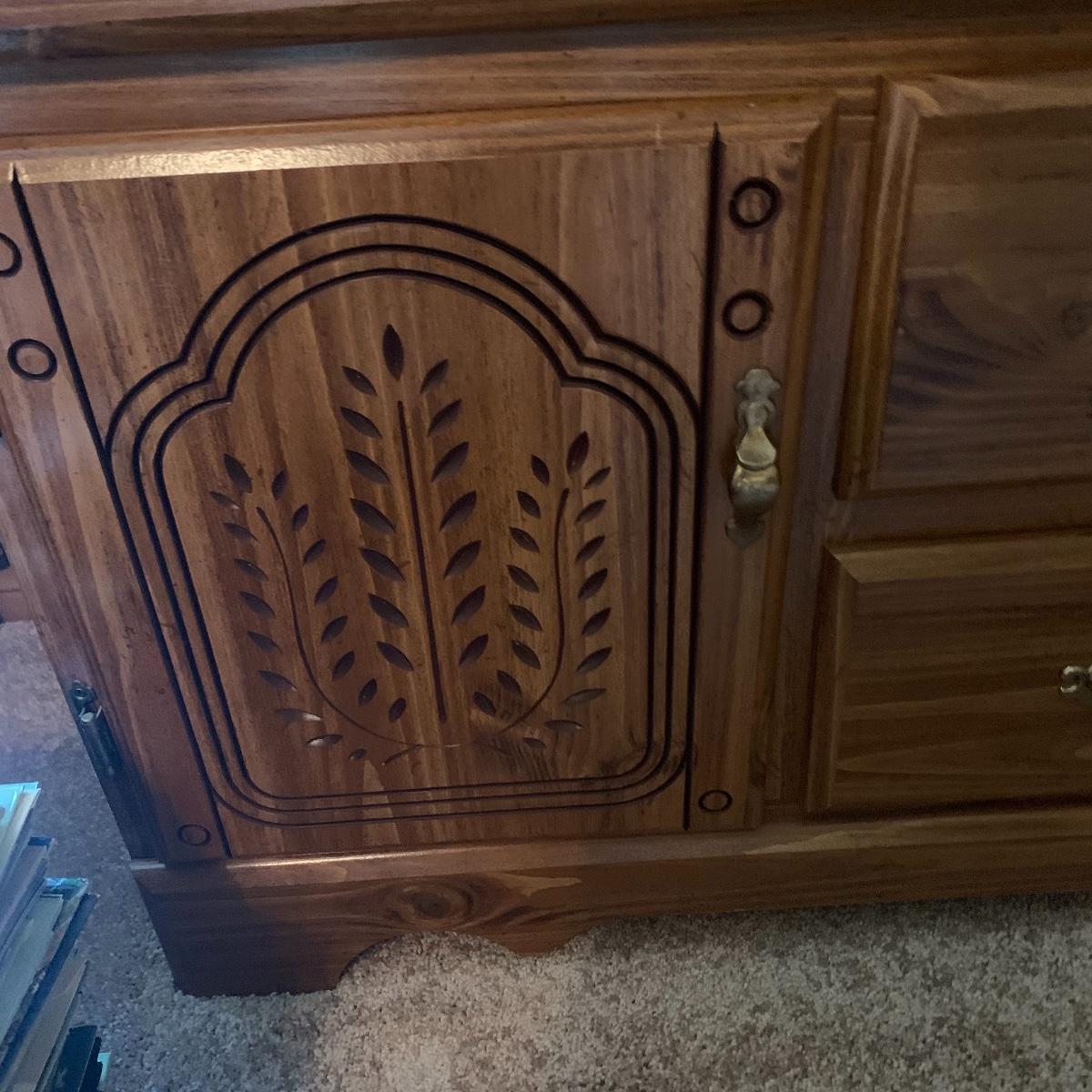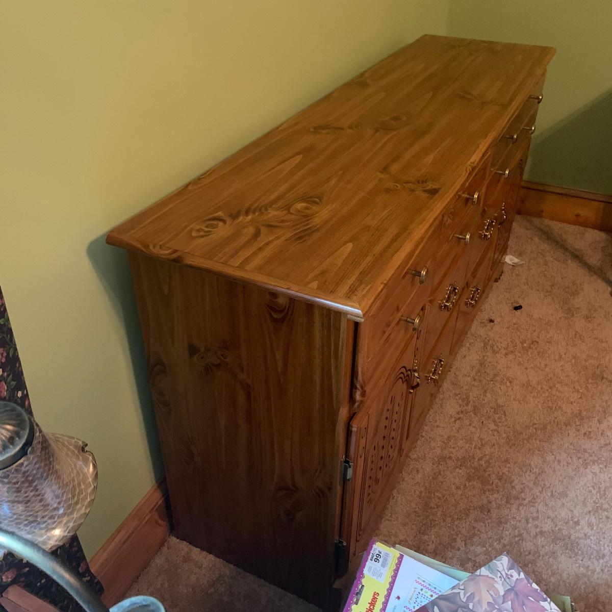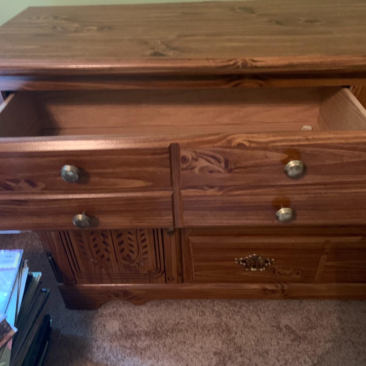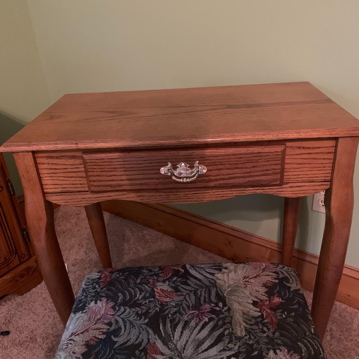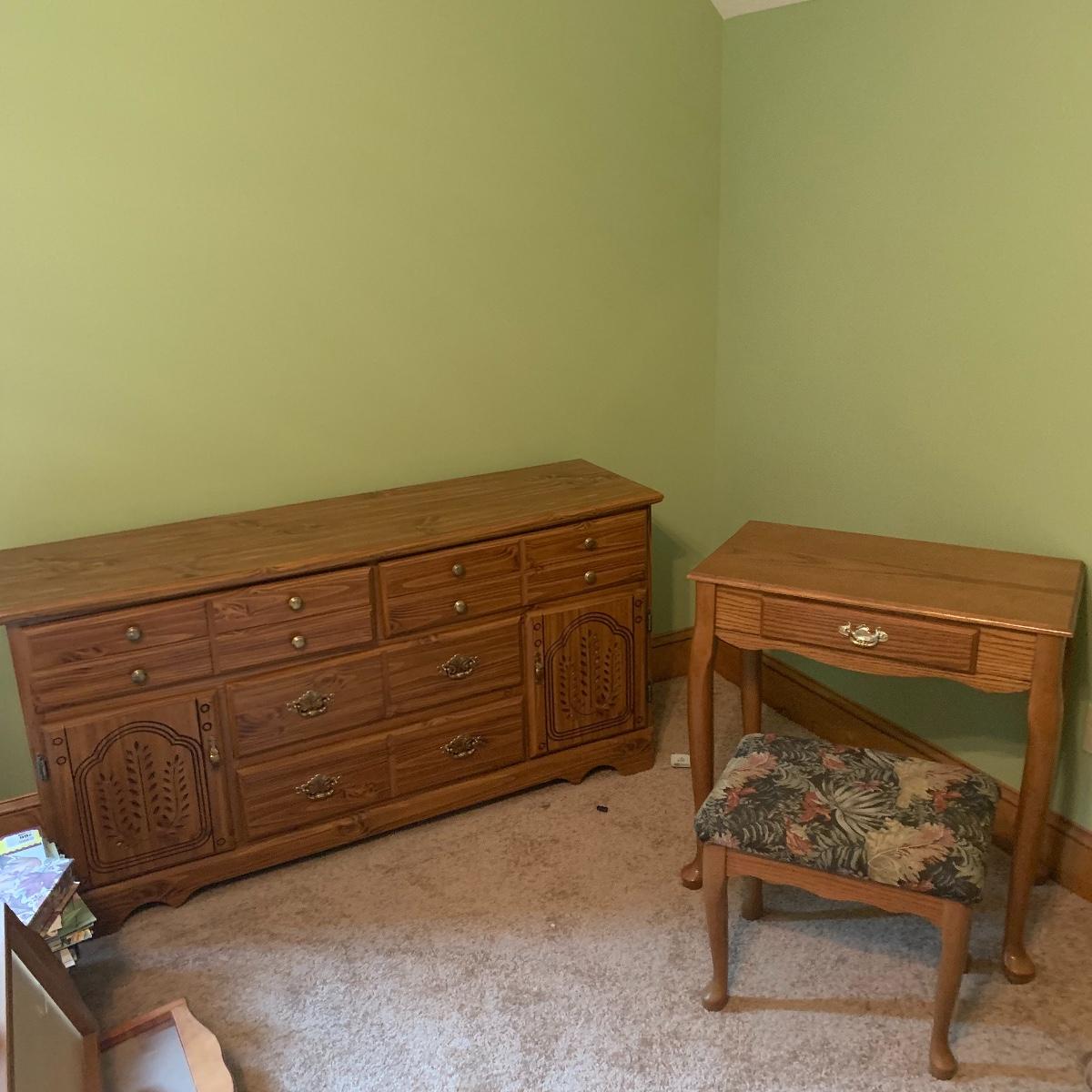 This lot offers great storage options. Included in this lot is a beautiful dresser that features shiny gold hardware and doors that have carved leaf designs. There are four drawers and ample storage behind each of the two doors. It measures 60” Wide X 16” Deep X 30” tall. Also offered is small side table that has one drawer. This item would make a nice vanity, writing desk or bedside table. It measures 28” Wide X 16” Deep X 30” Tall. It comes with a cute little stool as well. Local pickup only.