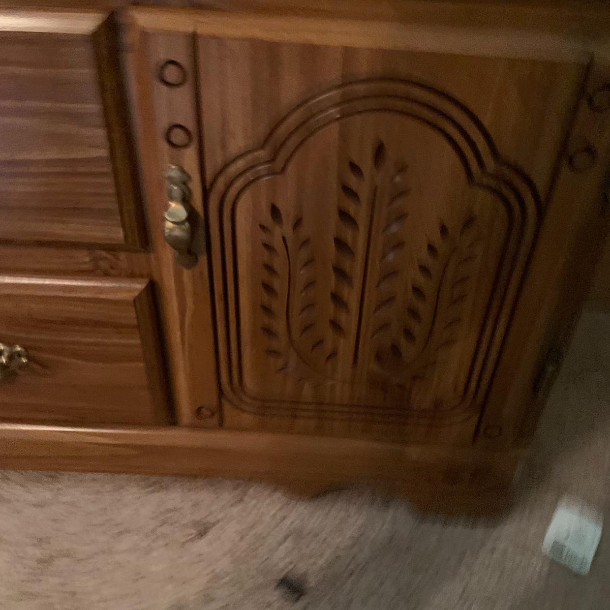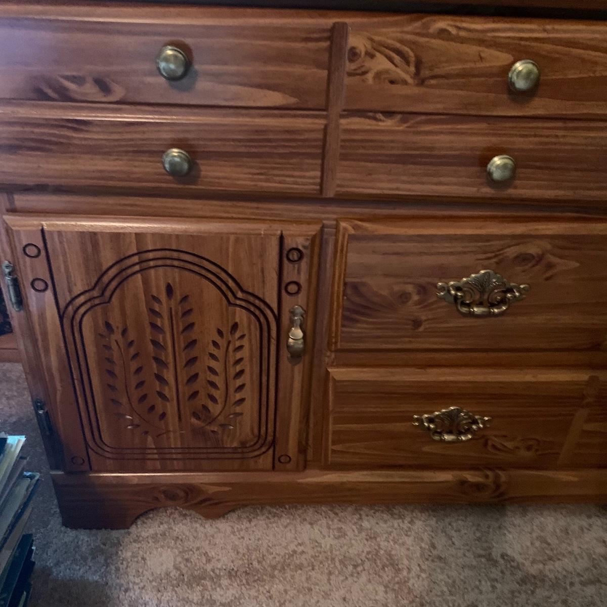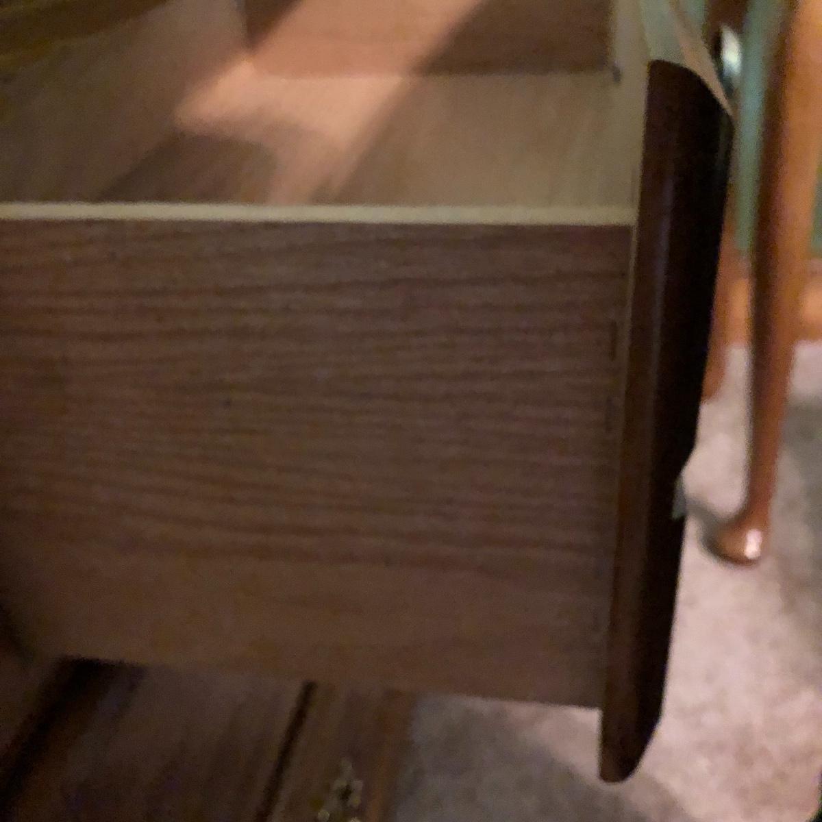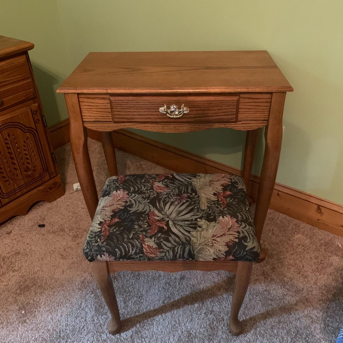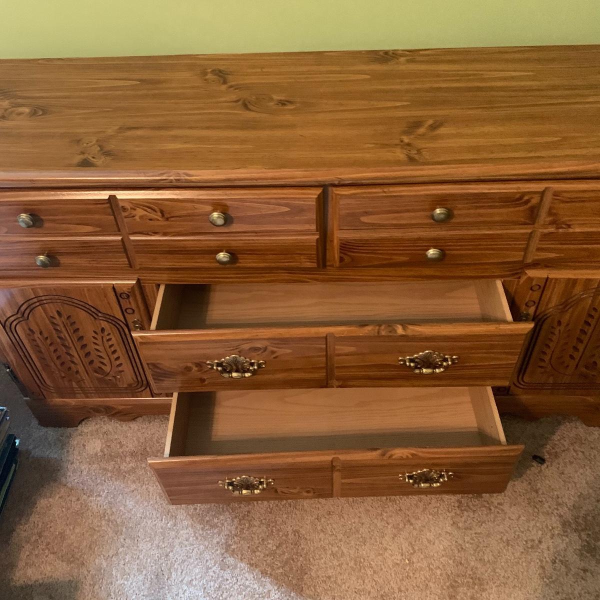 This lot offers great storage options. Included in this lot is a beautiful dresser that features shiny gold hardware and doors that have carved leaf designs. There are four drawers and ample storage behind each of the two doors. It measures 60” Wide X 16” Deep X 30” tall. Also offered is small side table that has one drawer. This item would make a nice vanity, writing desk or bedside table. It measures 28” Wide X 16” Deep X 30” Tall. It comes with a cute little stool as well. Local pickup only.