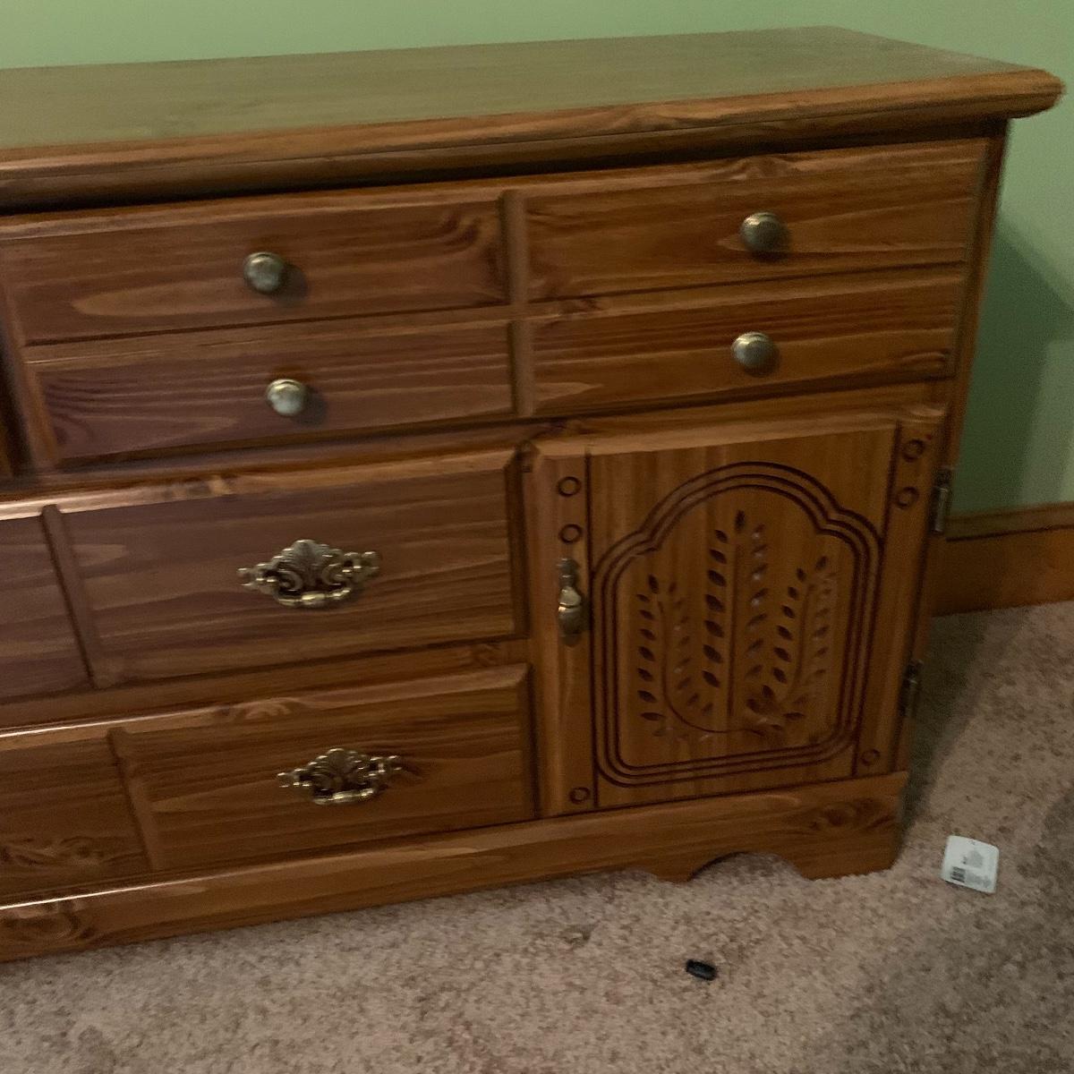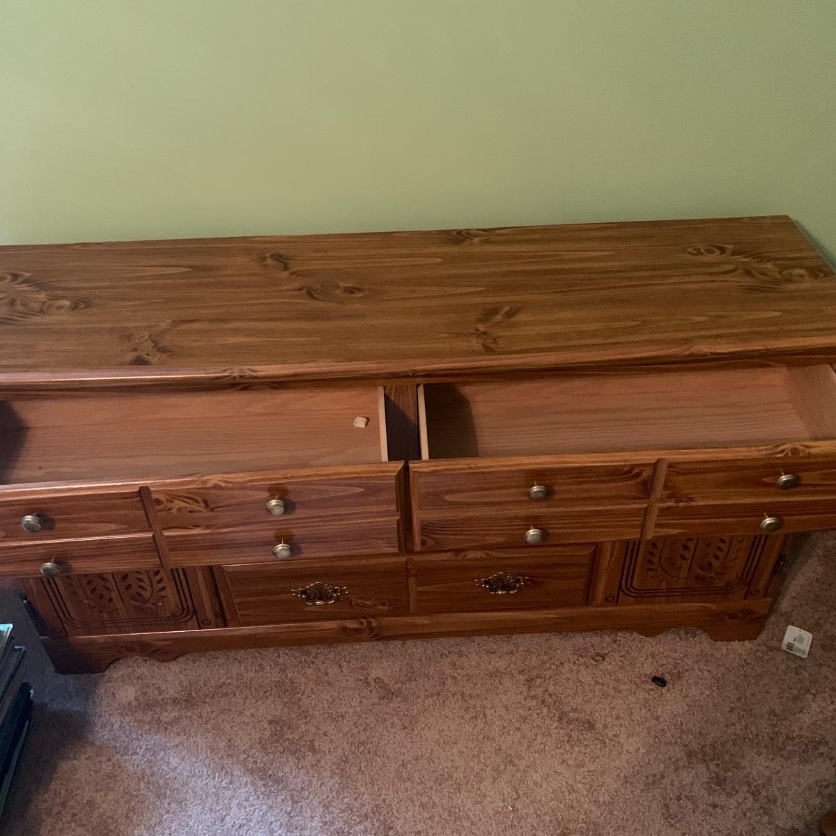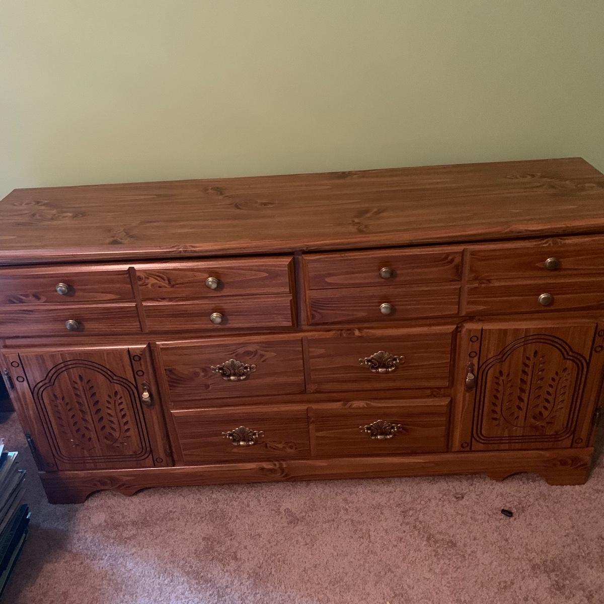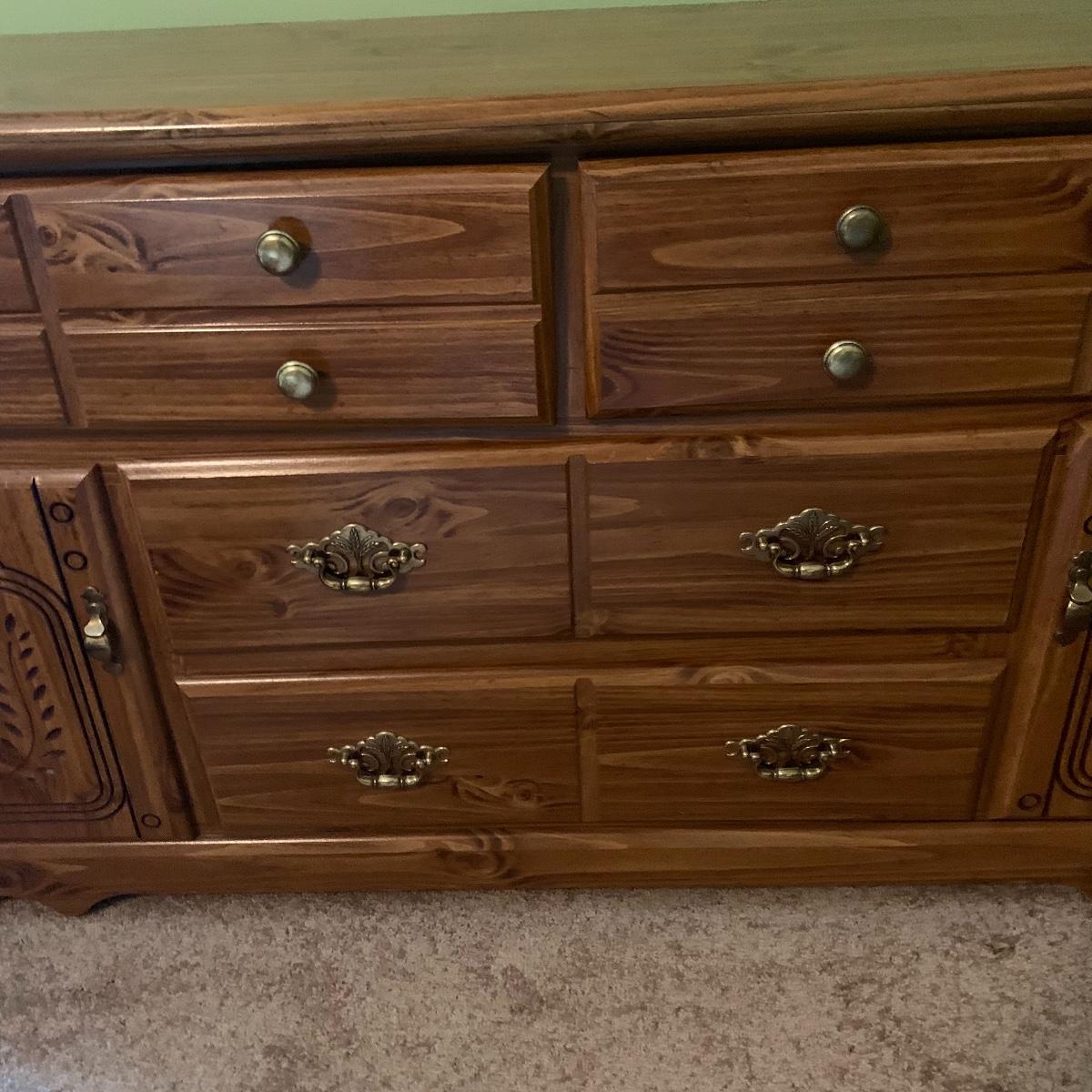 This lot offers great storage options. Included in this lot is a beautiful dresser that features shiny gold hardware and doors that have carved leaf designs. There are four drawers and ample storage behind each of the two doors. It measures 60” Wide X 16” Deep X 30” tall. Also offered is small side table that has one drawer. This item would make a nice vanity, writing desk or bedside table. It measures 28” Wide X 16” Deep X 30” Tall. It comes with a cute little stool as well. Local pickup only.