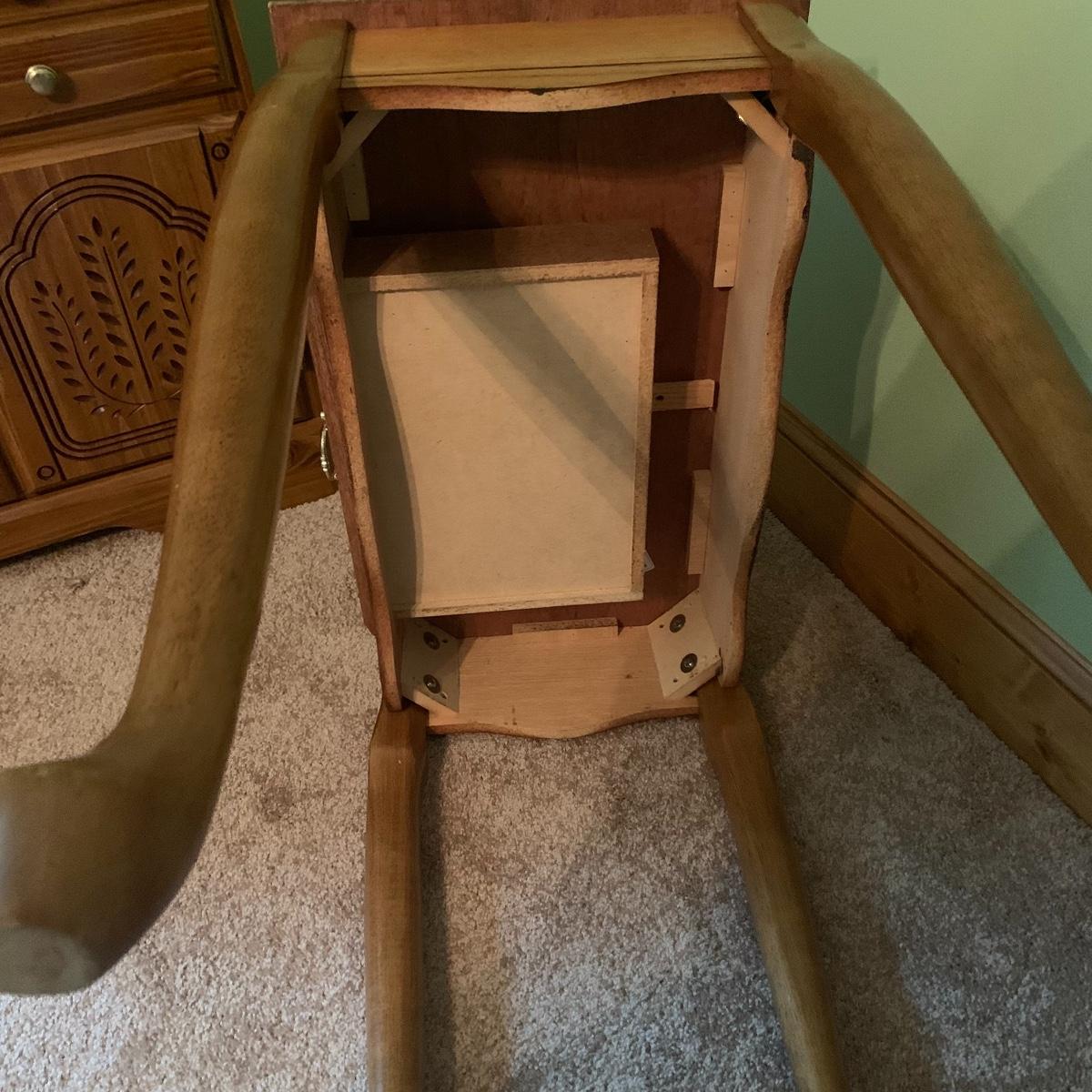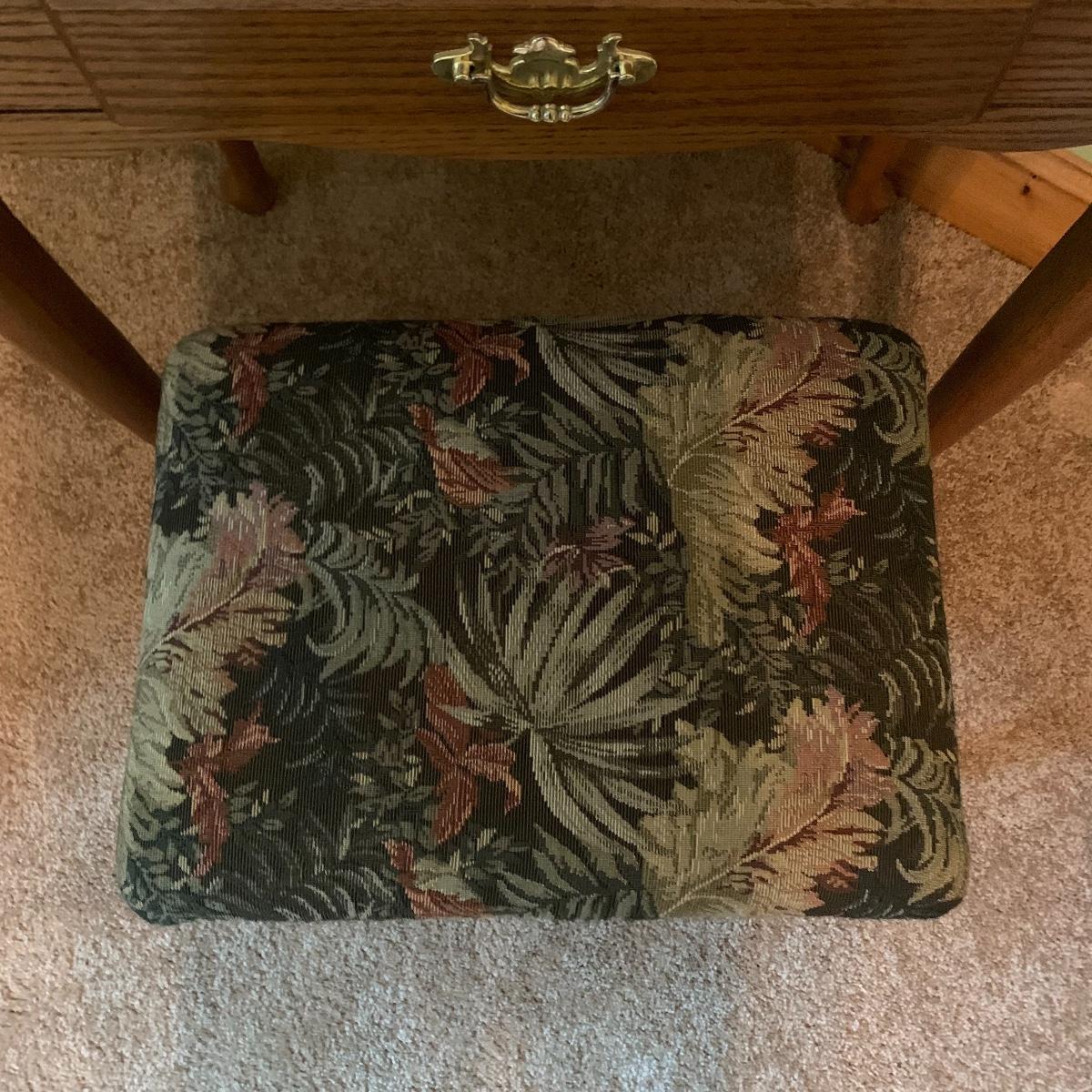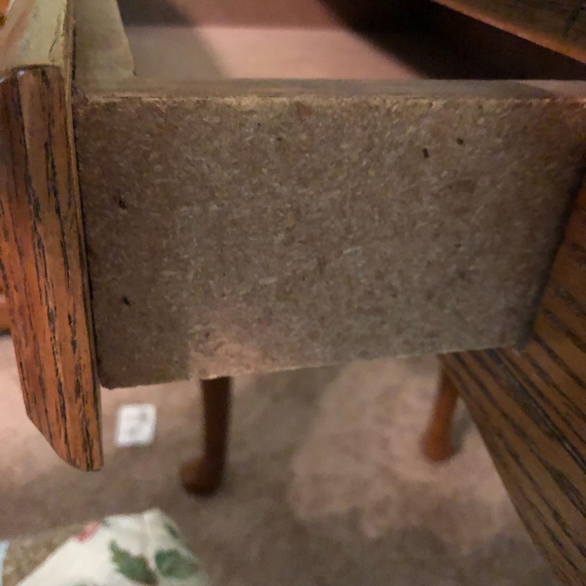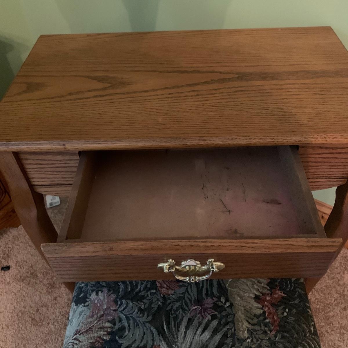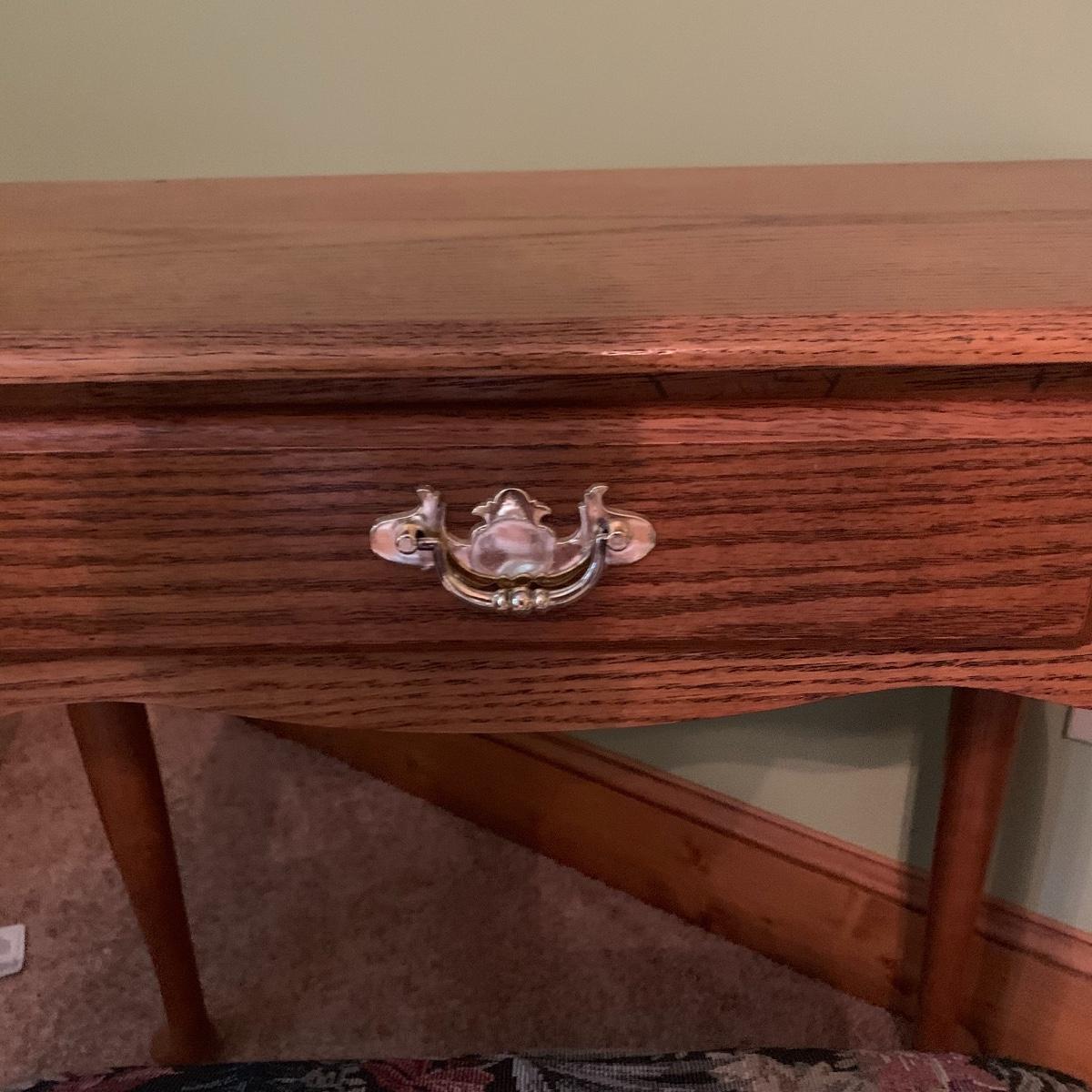 This lot offers great storage options. Included in this lot is a beautiful dresser that features shiny gold hardware and doors that have carved leaf designs. There are four drawers and ample storage behind each of the two doors. It measures 60” Wide X 16” Deep X 30” tall. Also offered is small side table that has one drawer. This item would make a nice vanity, writing desk or bedside table. It measures 28” Wide X 16” Deep X 30” Tall. It comes with a cute little stool as well. Local pickup only.